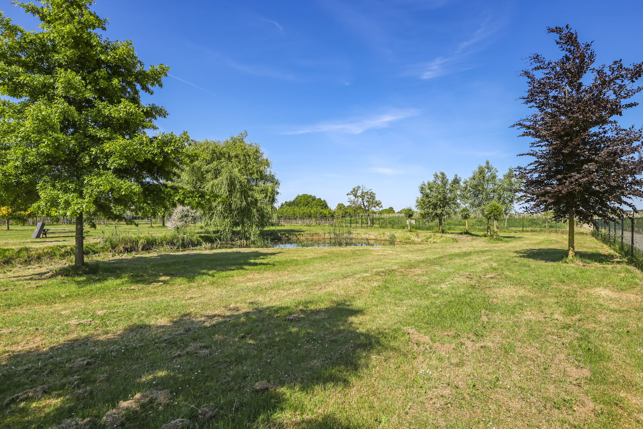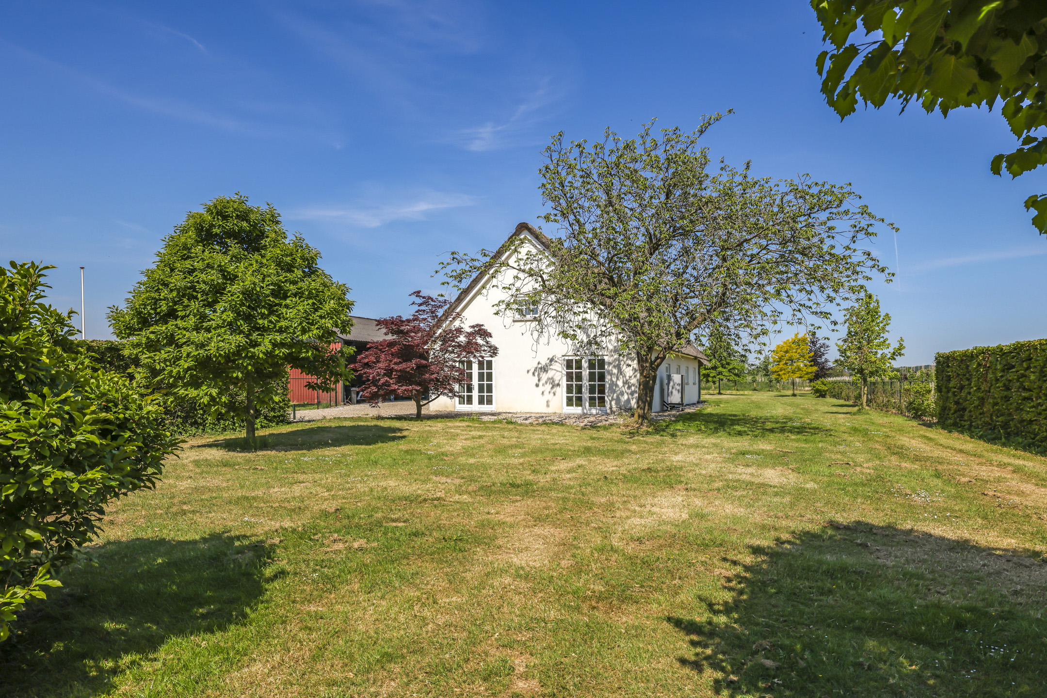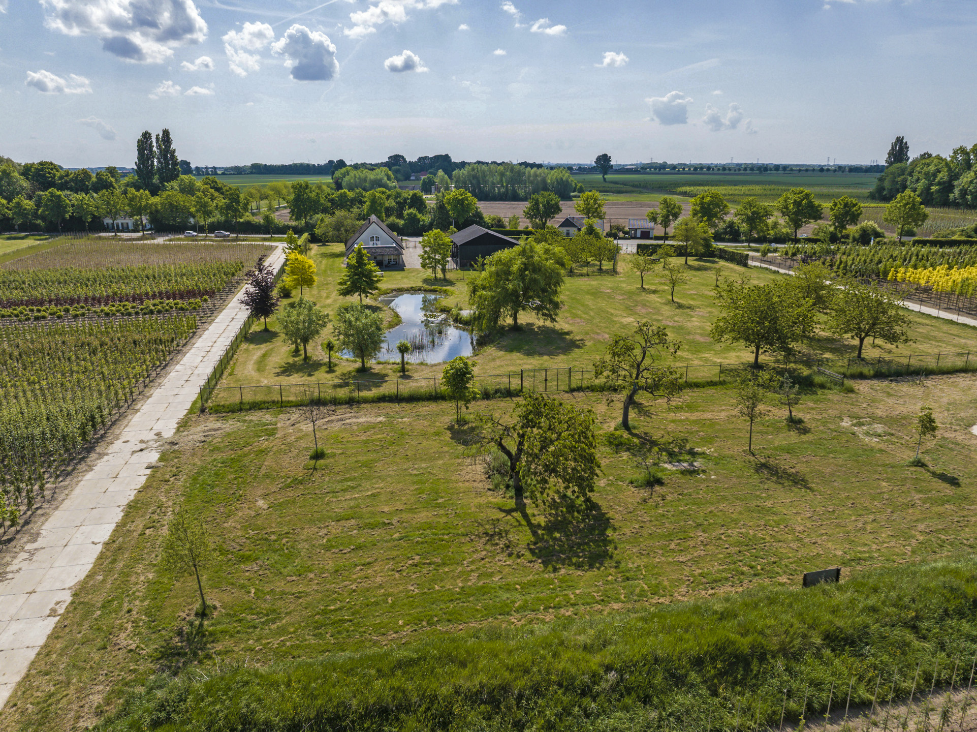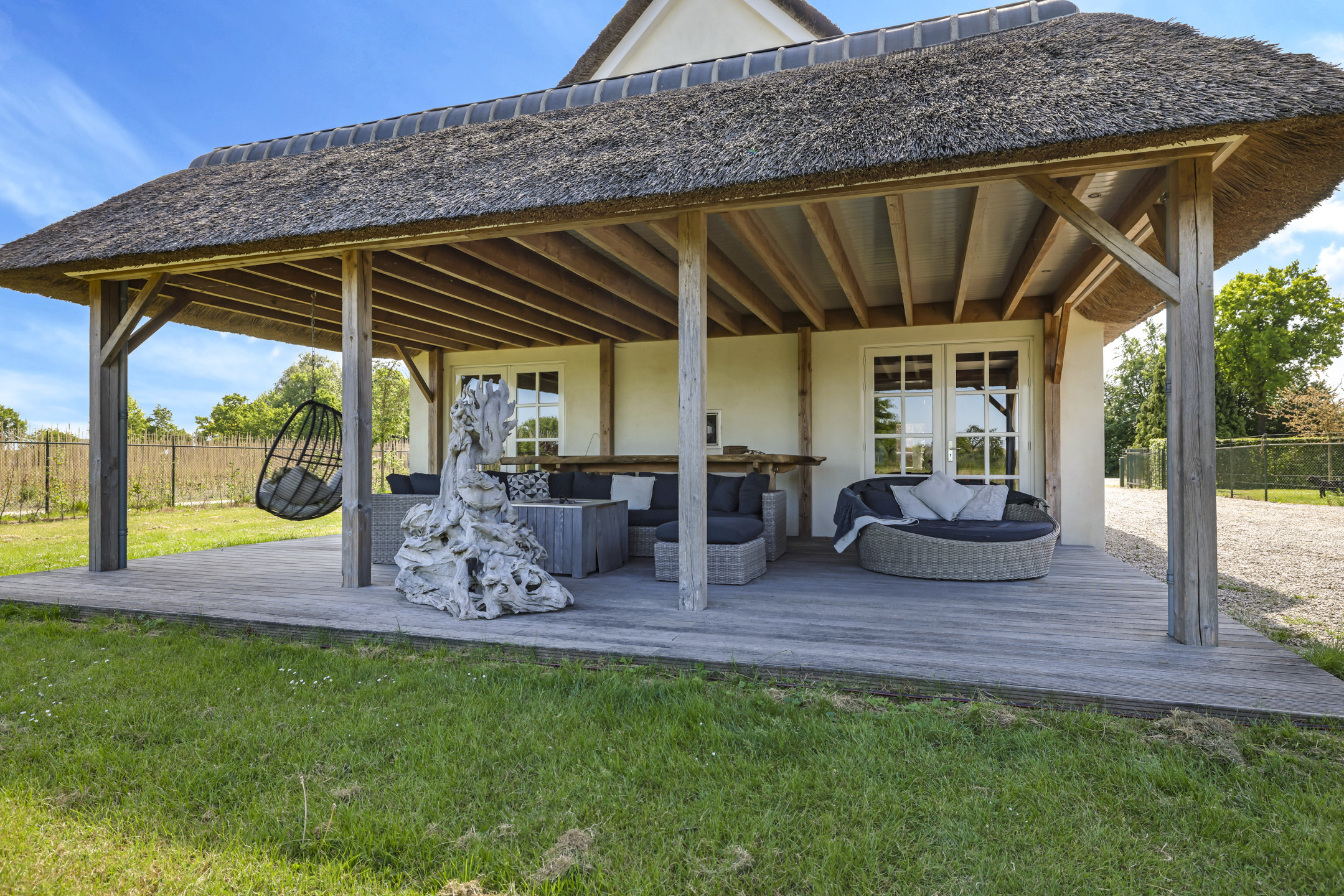 Ben je op zoek naar meer buitenleven, dan zal deze tuin je zeker aanspreken. Aan alle zijden van de woning geniet van je van veel vrijheid en daarmee ook veel privacy. In het midden van de tuin is een grote vijver geplaatst welke zorgt voor veen biodiversiteit in de tuin. Verder in het grasveld tref je verschillende bomen waaronder ook kersenbomen. Direct aan de woning is een veranda van ca. 40m² geplaatst waar je heerlijk kan genieten van het vrije zicht over het erf. Zie jij jezelf hier ’s ochtends al een kopje koffie drinken?