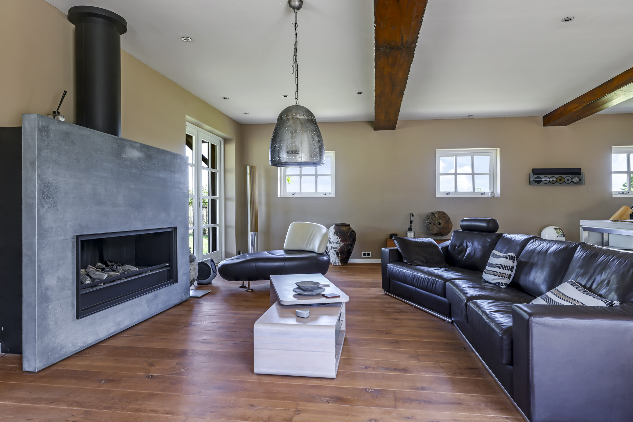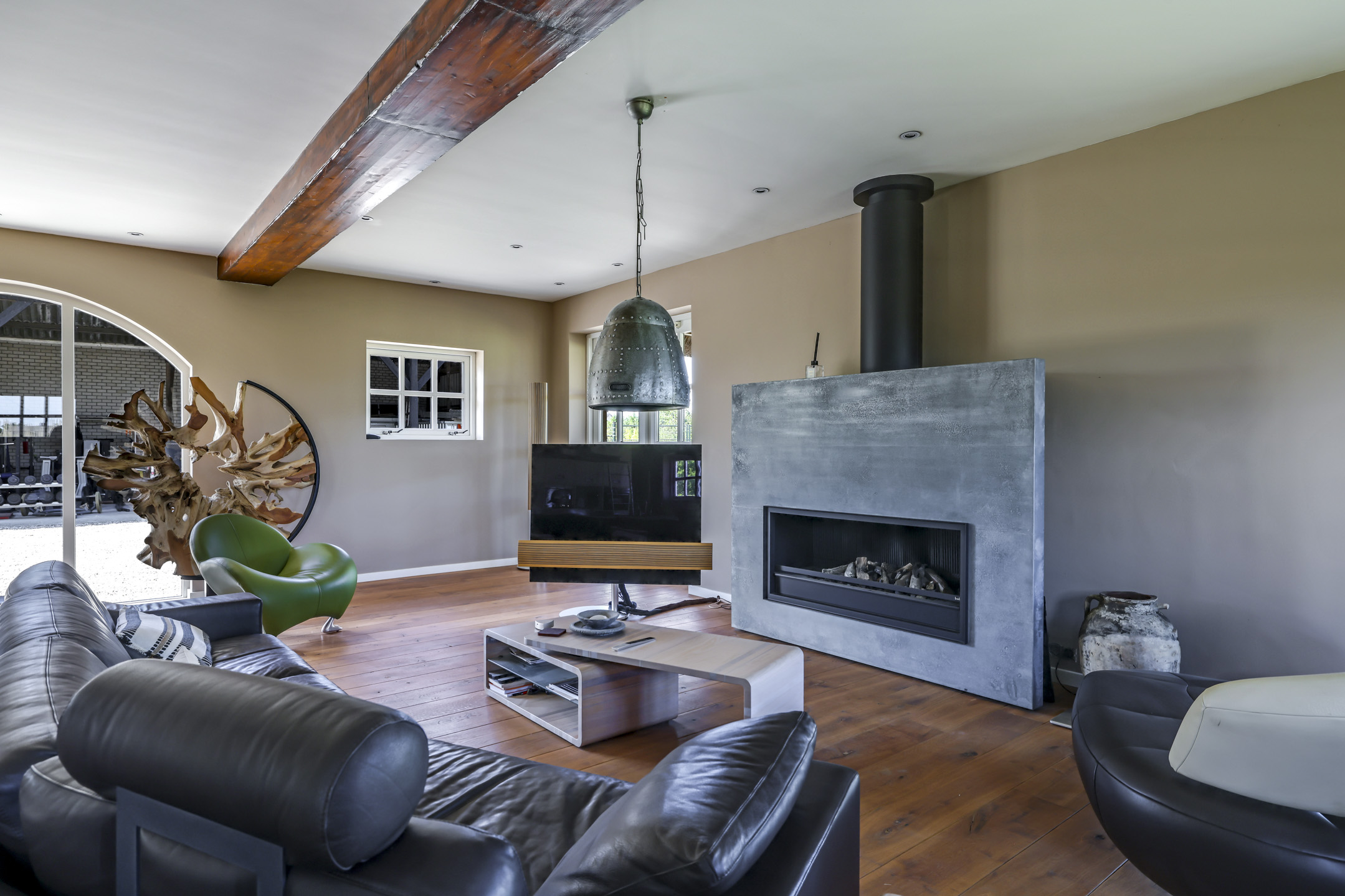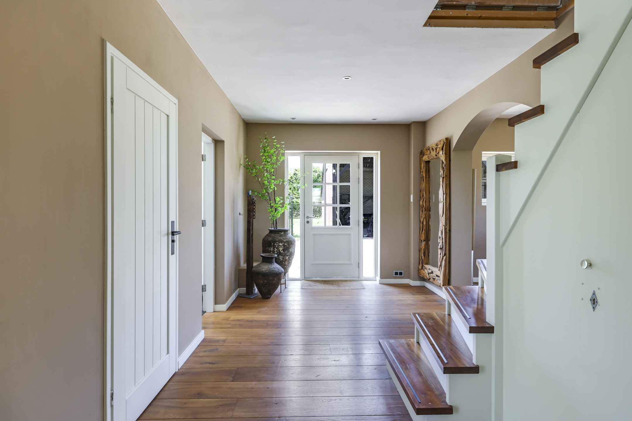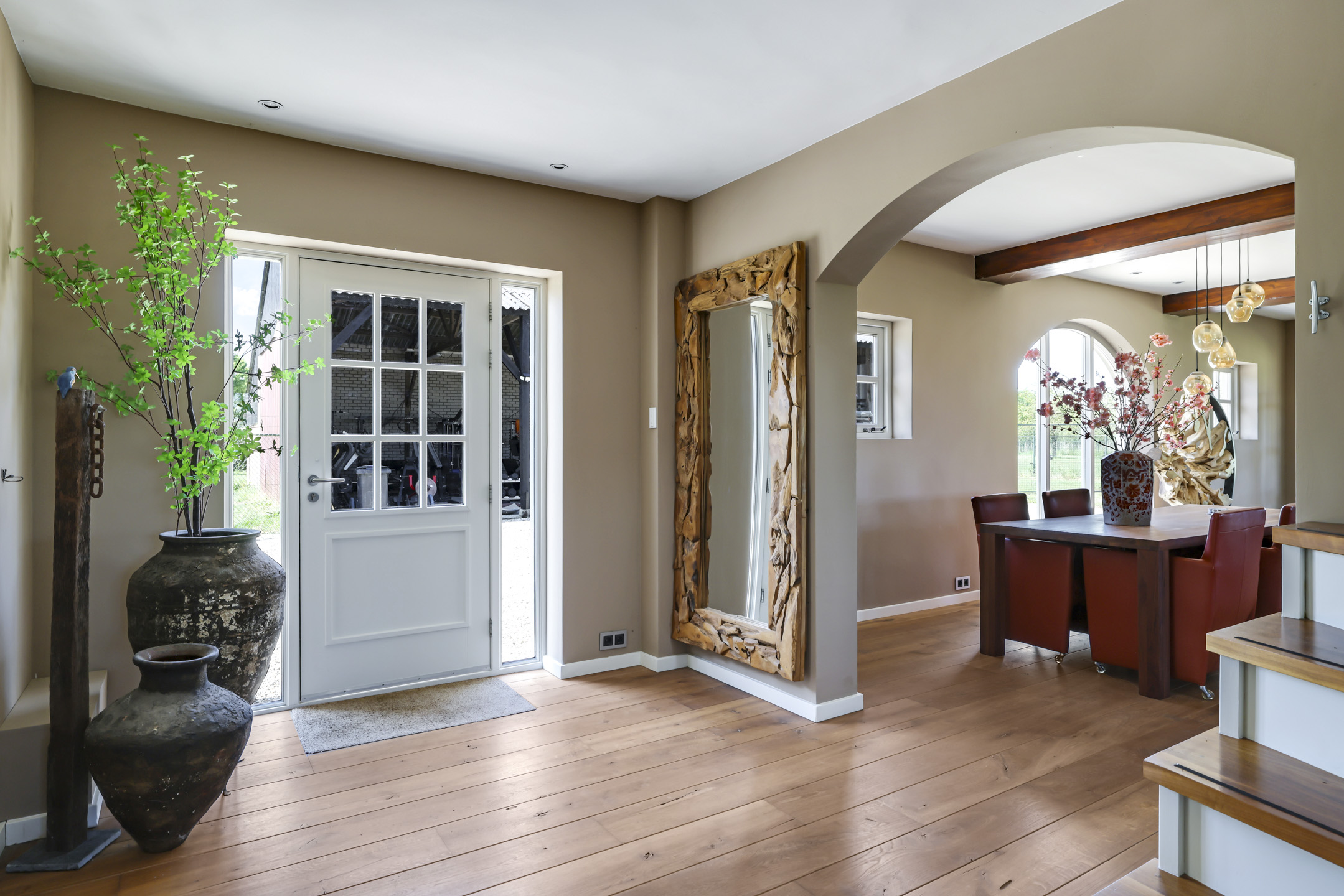 De indeling bestaat uit onder meer een zeer royale woonkamer in de voormalige deel met onder meer vloerverwarming, een gashaard, dubbele openslaande deuren, een uitgebreide keuken met kookeiland, 2 volwaardige slaapkamer en een luxe badkamer met o.a. een ligbad en inloopdouche op de begane grond. Op de verdieping zijn nog een zeer riante masterbedroom met hoge nok met het spantwerk in het zicht, een 4e slaapkamer met entresol en een badkamer met inloopdouche gelegen. De masterbedroom heeft tevens een vrijstaand, rond ligbad en een houtkachel. Vanuit deze kamer heb je toegang tot het dakterras waarvan je geniet van een uitzicht over je eigen tuin.