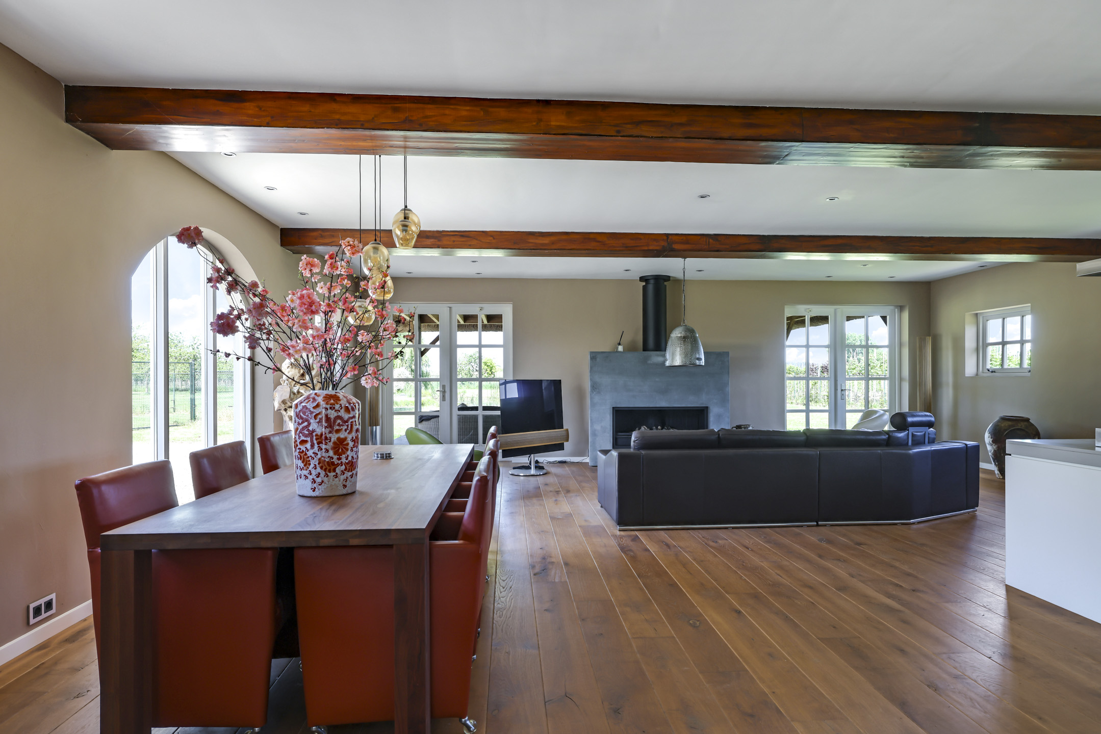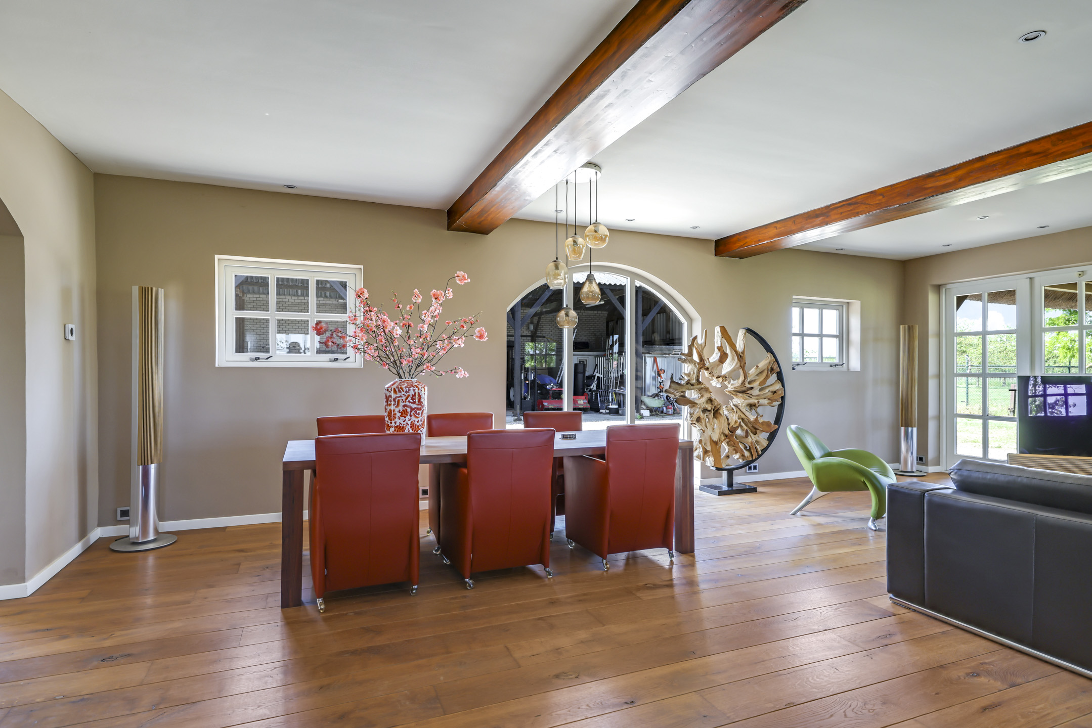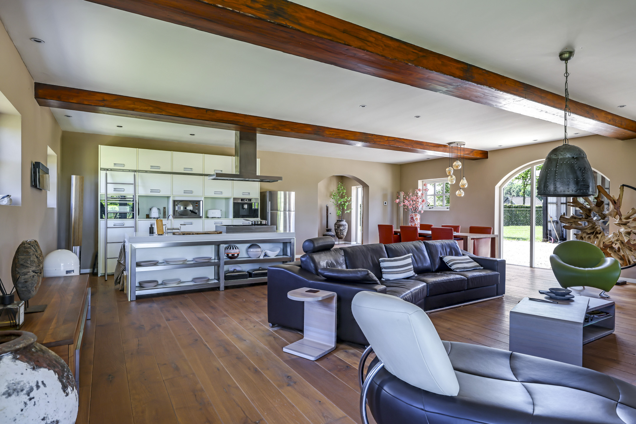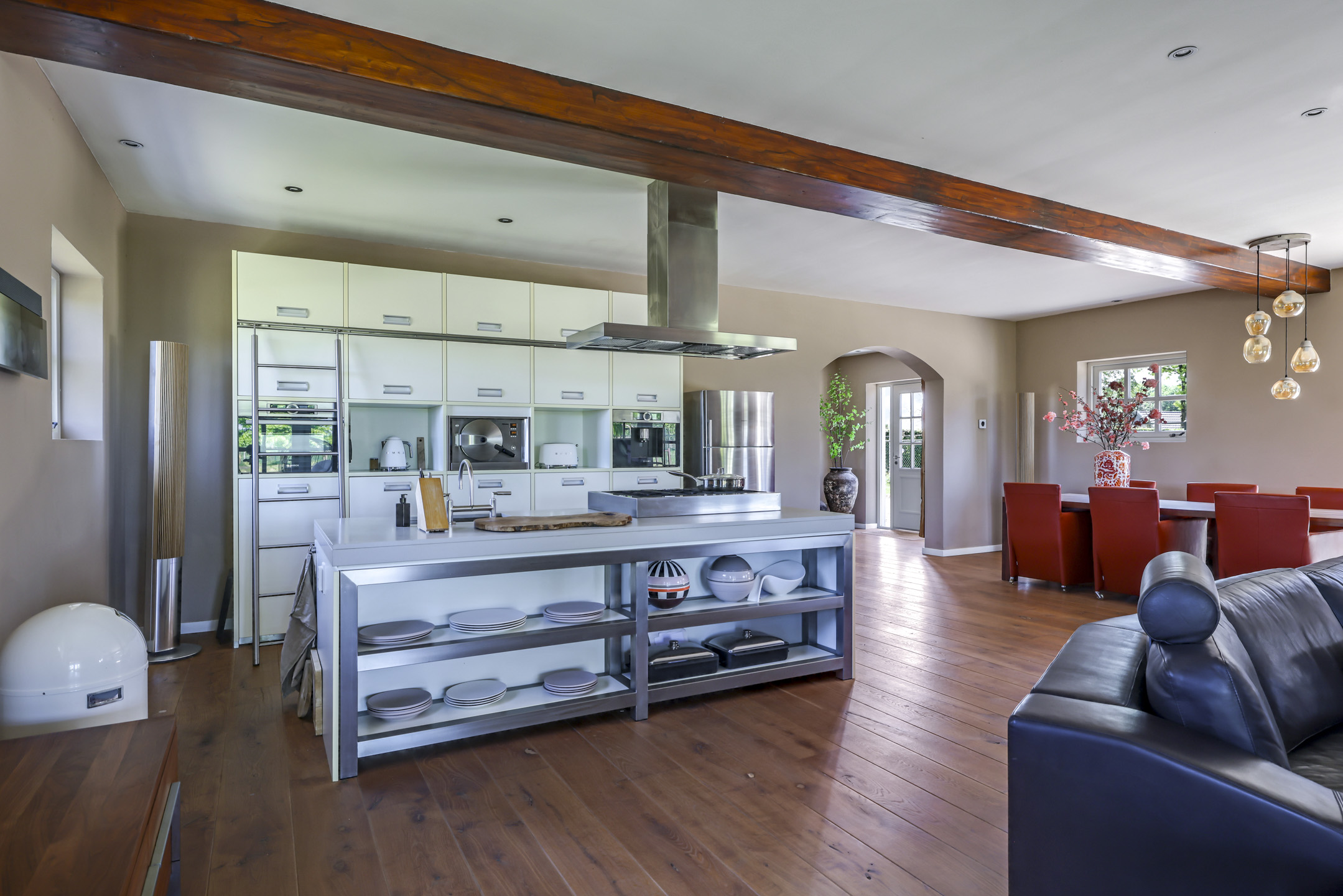Vanuit de hal is er toegang tot de voormalige deel. Hier stonden vroeger de dieren waardoor het ook veel soberder was afgewerkt dan het voorhuis. Wanneer je de deel inloopt, word je verrast door een enorme ruimte met grote raampartijen en een sfeervolle, massief houten vloer. In de achtergevel zijn 2 keer dubbele openslaande tuindeuren geplaatst met daartussenin een Boley gashaard. De keuken is zeer uitgebreid met onder andere een riant kook- en spoeleiland met vaatwasser en daarachter een hoge kastenwand voorzien van inbouwapparatuur zijnde een koffiezetapparaat, een Miele hogedruk stoomoven, een combi-oven/magnetron en een koelkast.