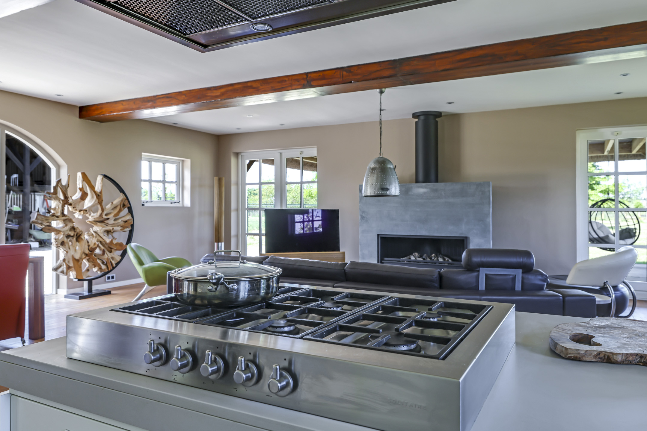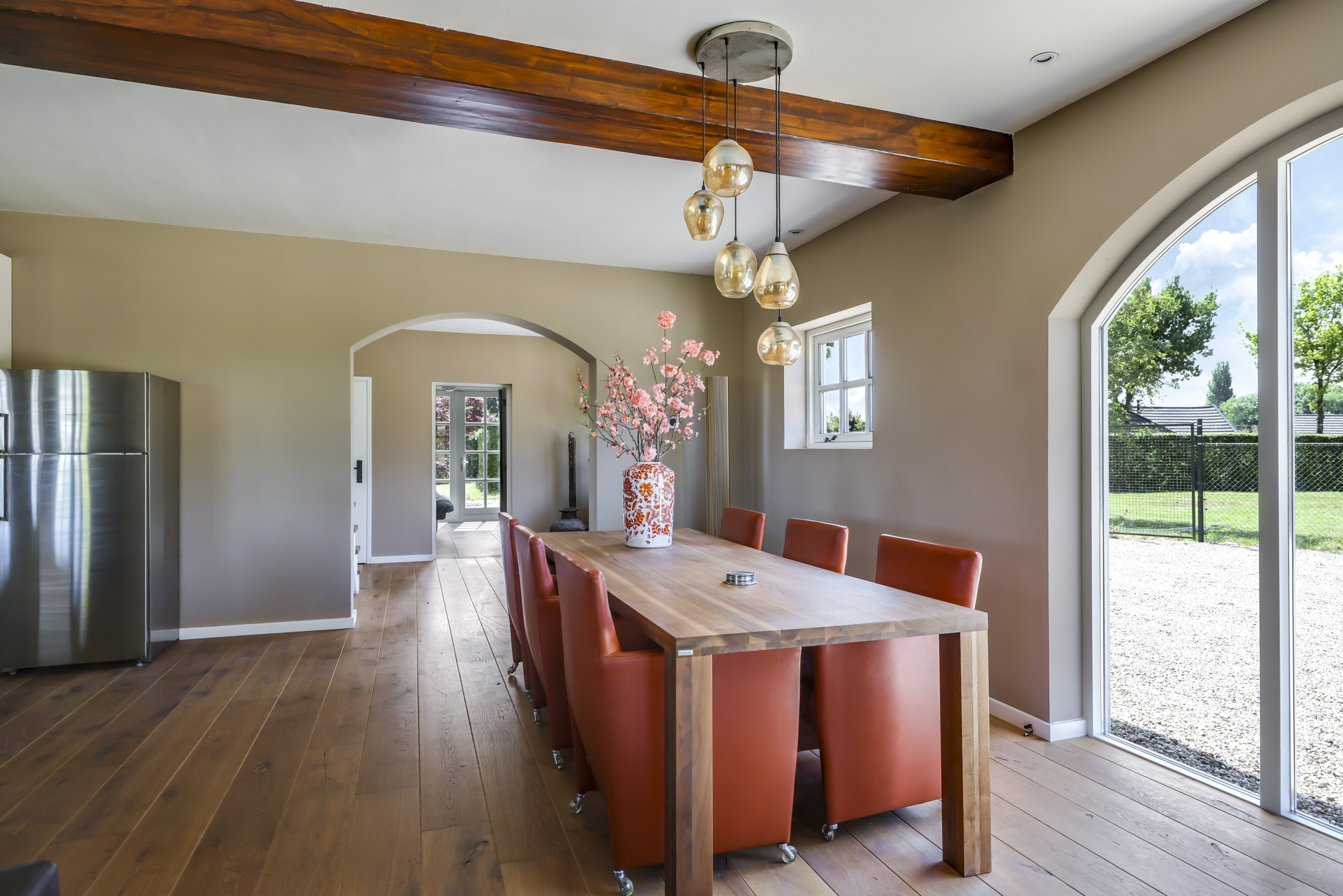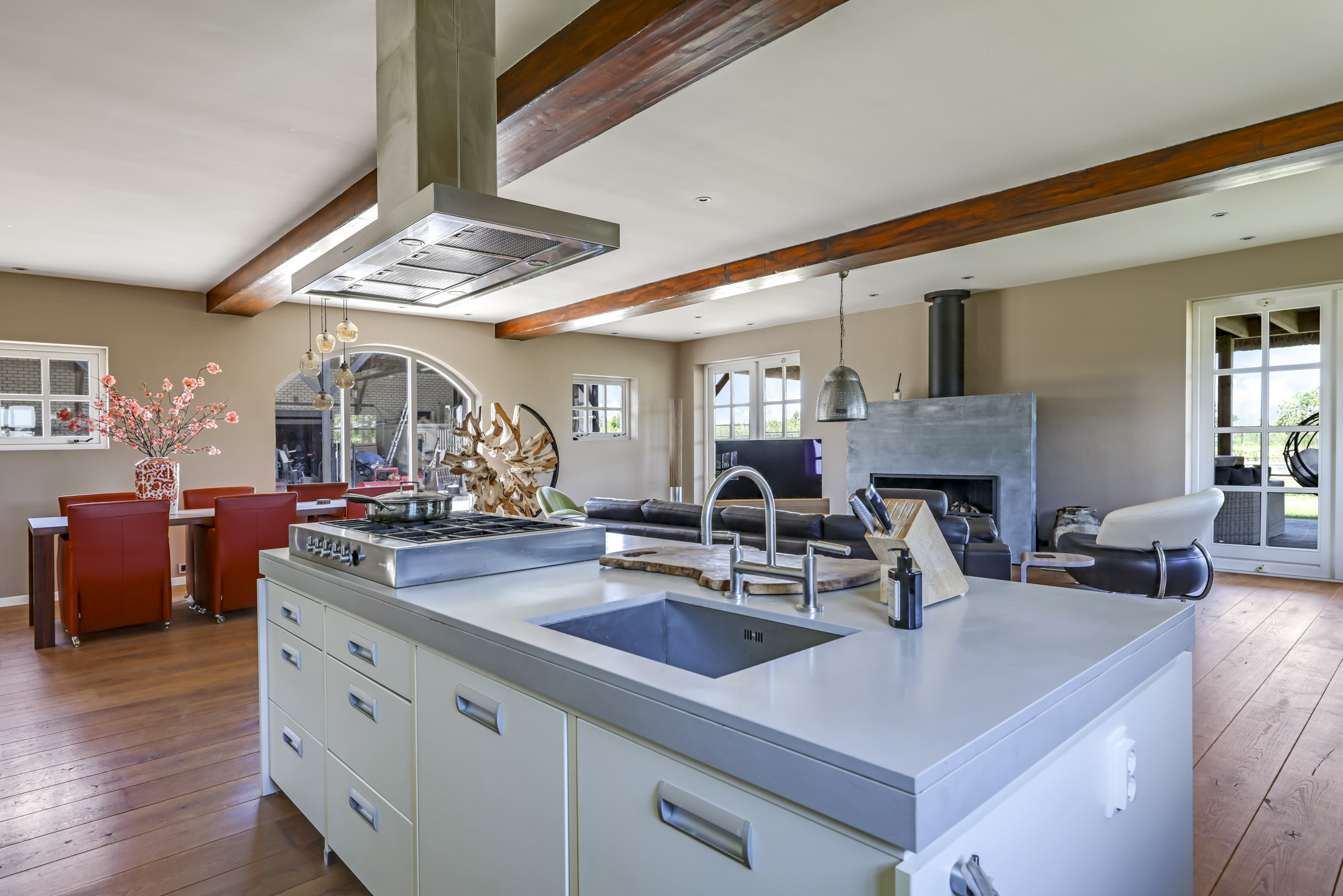 Vanuit de hal is er toegang tot de voormalige deel. Hier stonden vroeger de dieren waardoor het ook veel soberder was afgewerkt dan het voorhuis. Wanneer je de deel inloopt, word je verrast door een enorme ruimte met grote raampartijen en een sfeervolle, massief houten vloer. In de achtergevel zijn 2 keer dubbele openslaande tuindeuren geplaatst met daartussenin een Boley gashaard. De keuken is zeer uitgebreid met onder andere een riant kook- en spoeleiland met vaatwasser en daarachter een hoge kastenwand voorzien van inbouwapparatuur zijnde een koffiezetapparaat, een Miele hogedruk stoomoven, een combi-oven/magnetron en een koelkast.