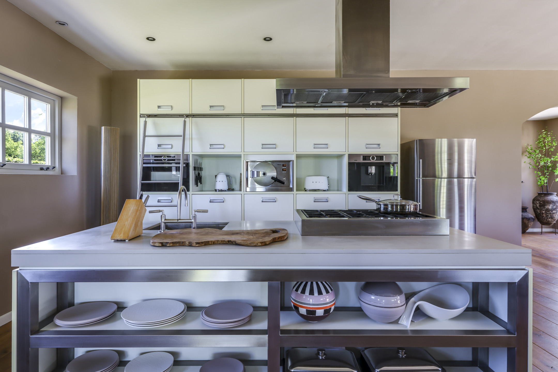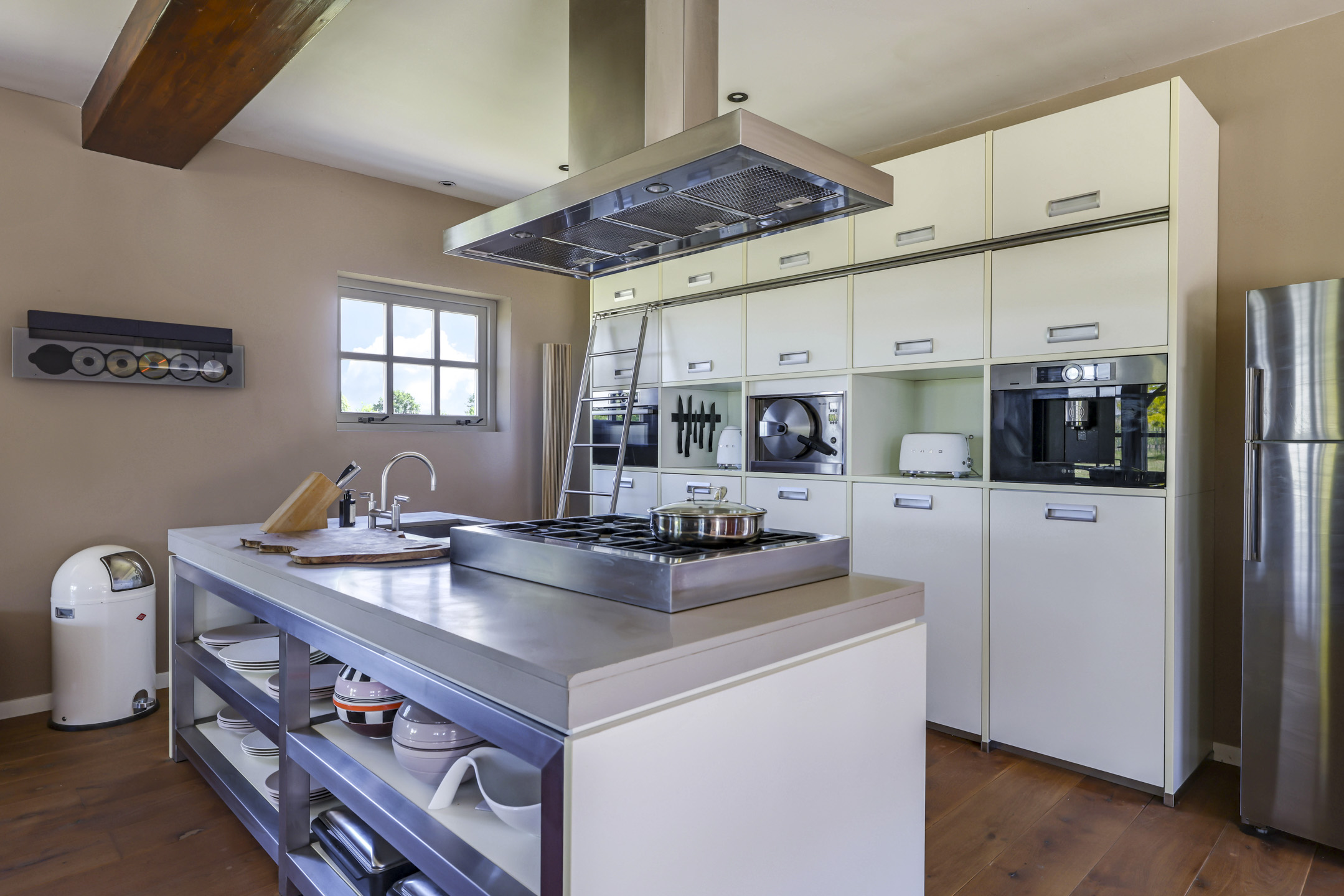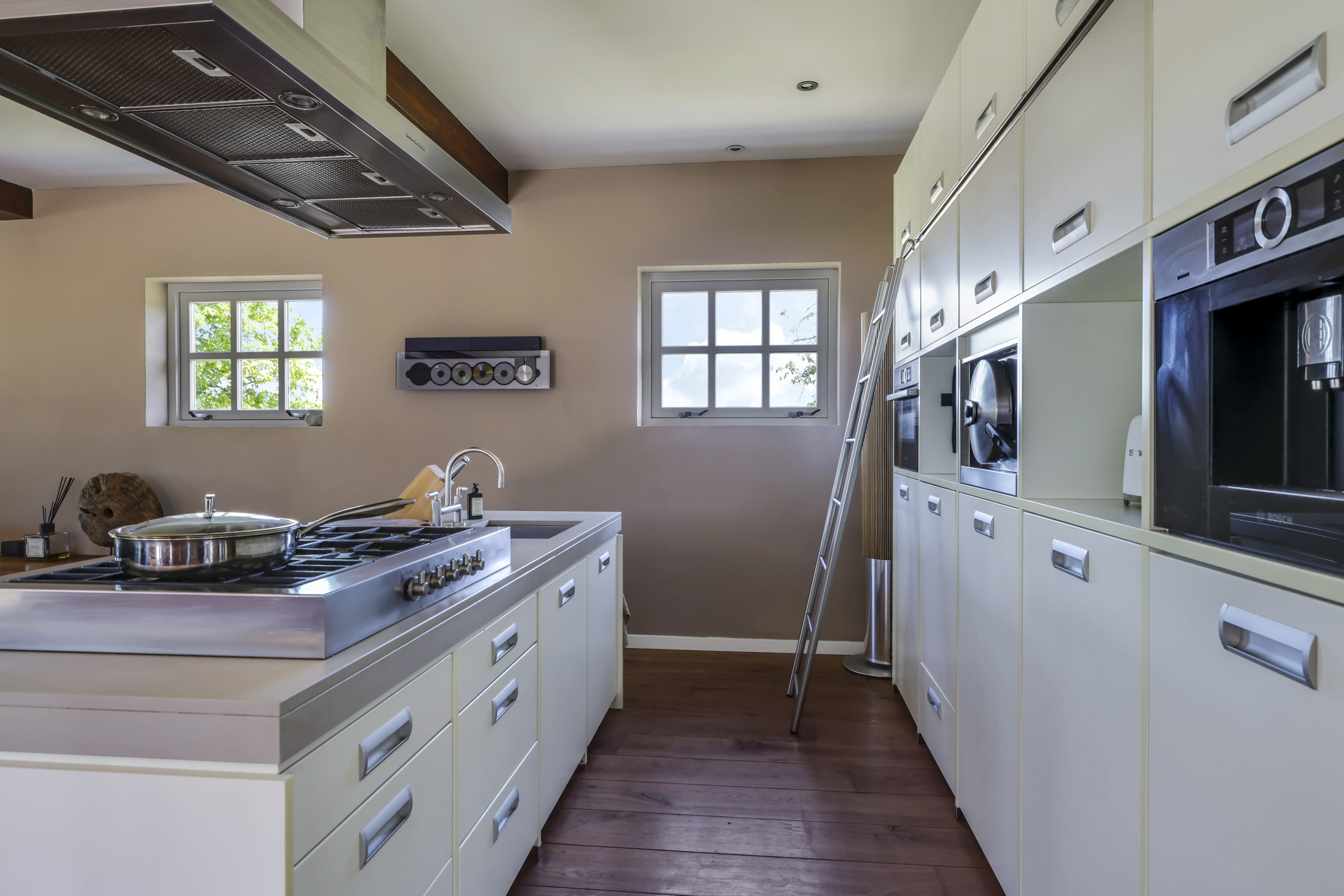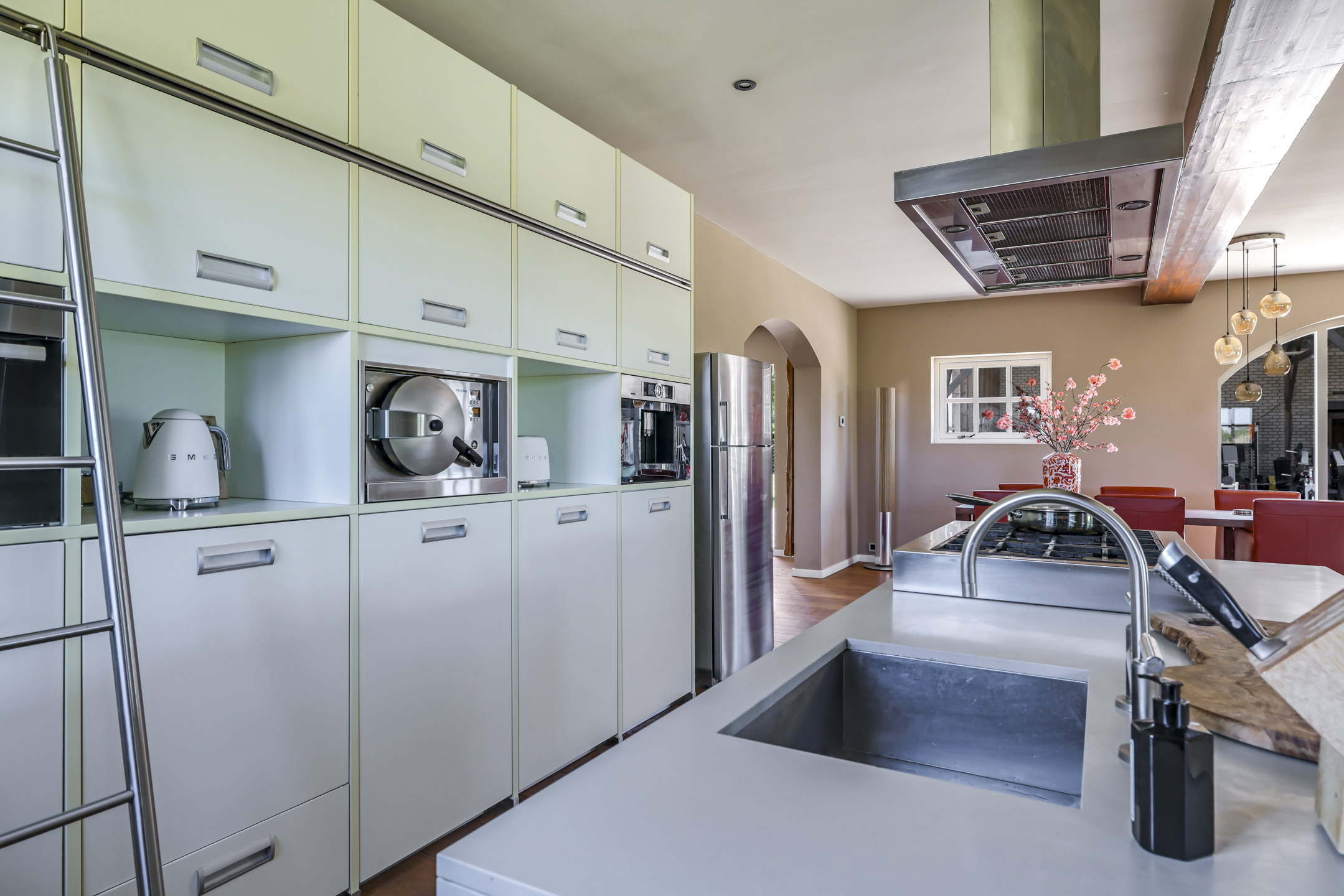 Vanuit de hal is er toegang tot de voormalige deel. Hier stonden vroeger de dieren waardoor het ook veel soberder was afgewerkt dan het voorhuis. Wanneer je de deel inloopt, word je verrast door een enorme ruimte met grote raampartijen en een sfeervolle, massief houten vloer. In de achtergevel zijn 2 keer dubbele openslaande tuindeuren geplaatst met daartussenin een Boley gashaard. De keuken is zeer uitgebreid met onder andere een riant kook- en spoeleiland met vaatwasser en daarachter een hoge kastenwand voorzien van inbouwapparatuur zijnde een koffiezetapparaat, een Miele hogedruk stoomoven, een combi-oven/magnetron en een koelkast.