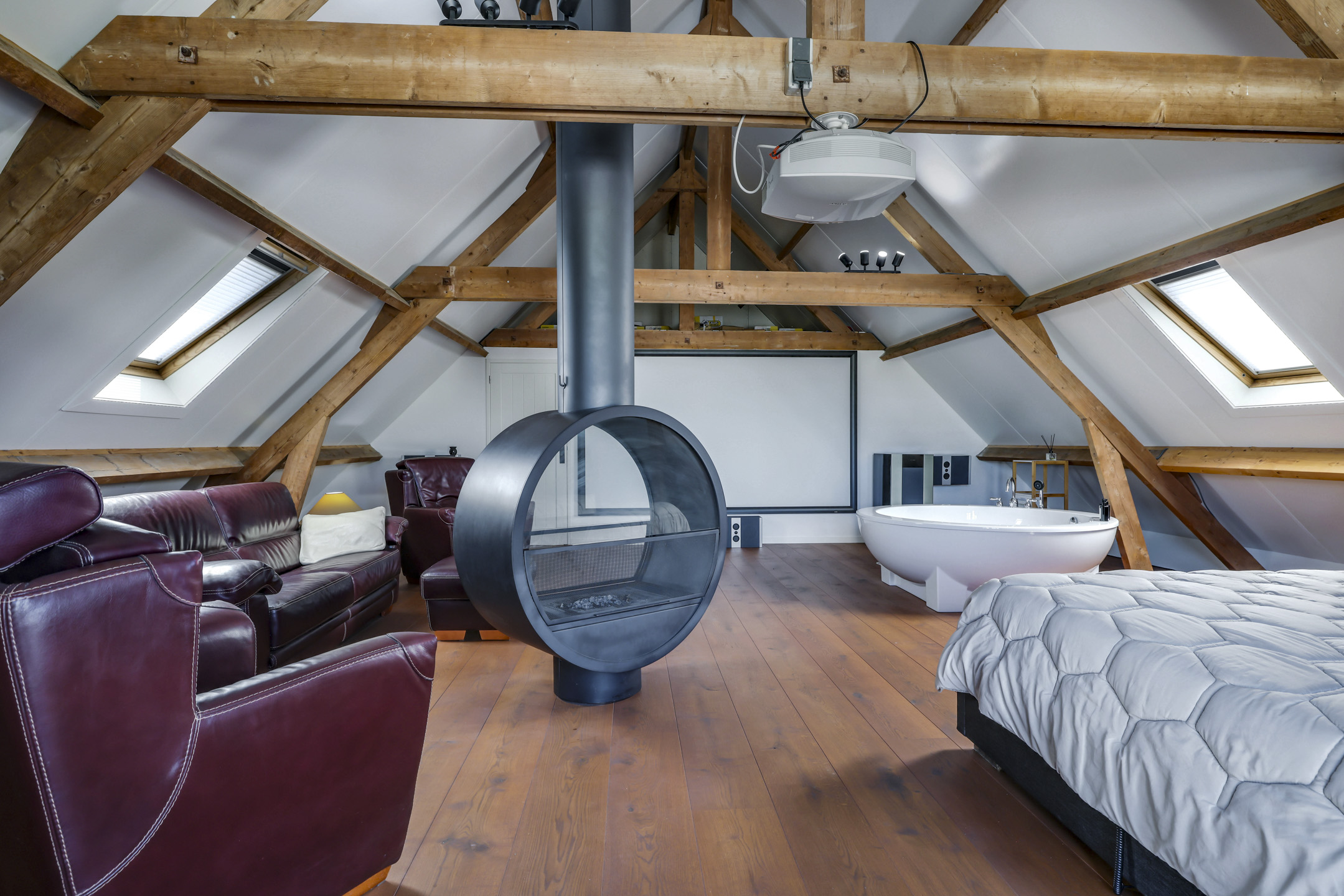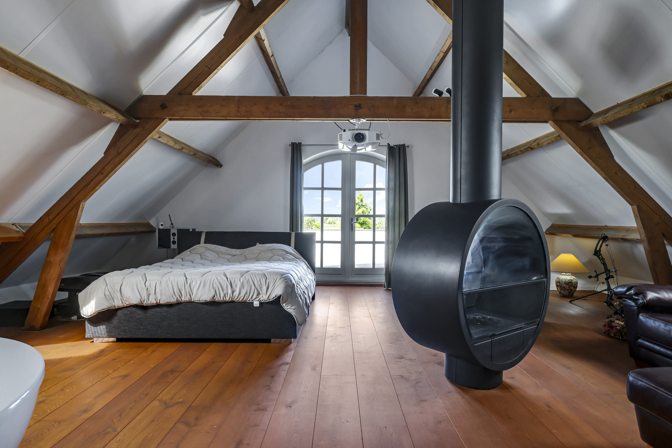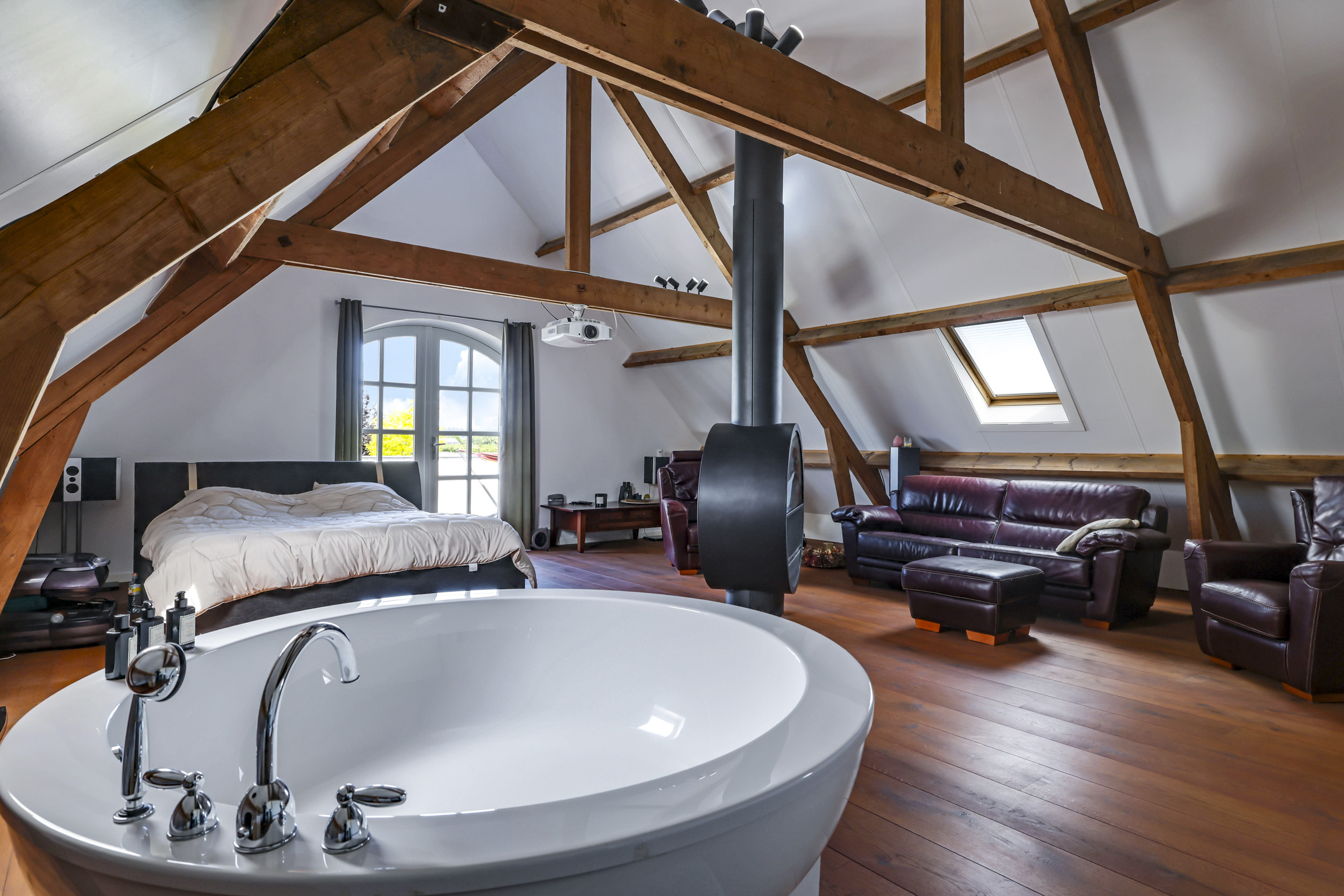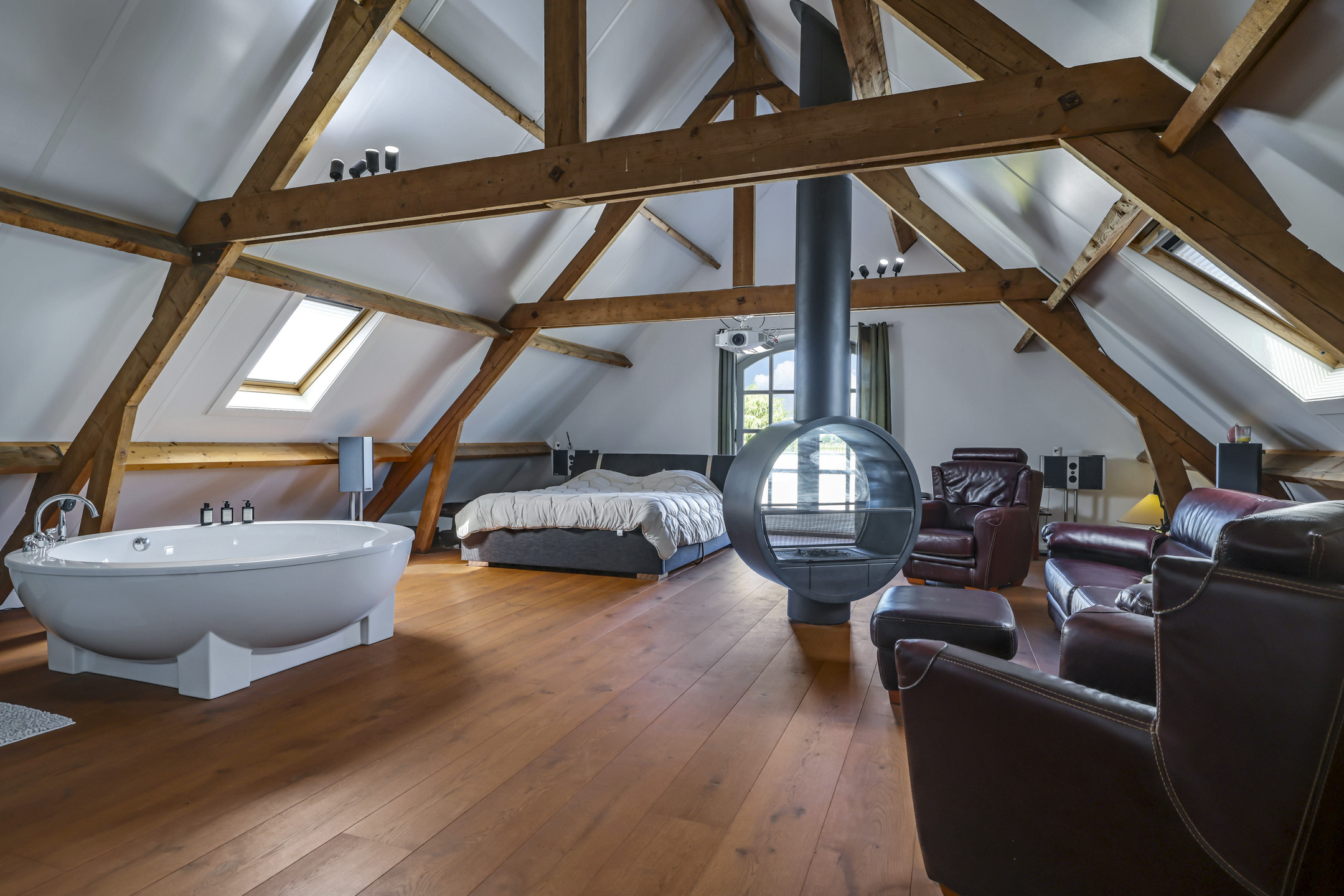 De 1e verdieping is opgedeeld in een zeer riante masterbedroom, nog een slaapkamer en een badkamer. De masterbedroom is van hetzelfde formaat als de woonkamer dus maar liefst ca. 75m² groot. Geen wonder dat hier dan ook een royaal, rond bad (Dreamscape) is geplaatst met daarbij een passende ronde, draaibare houtkachel (Boley). Aansluitend aan deze kamer is het dakterras van ca. 27m² bereikbaar.
