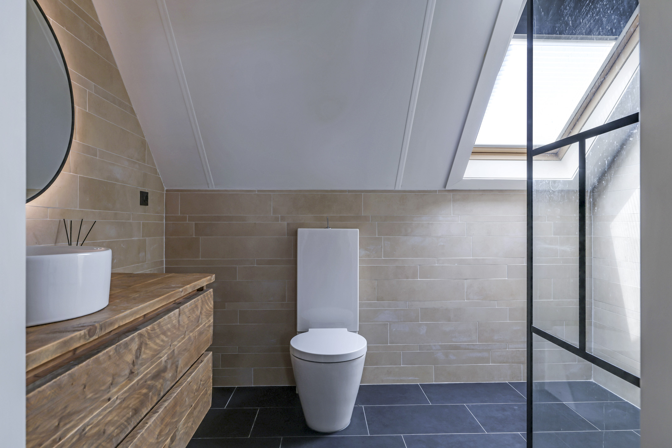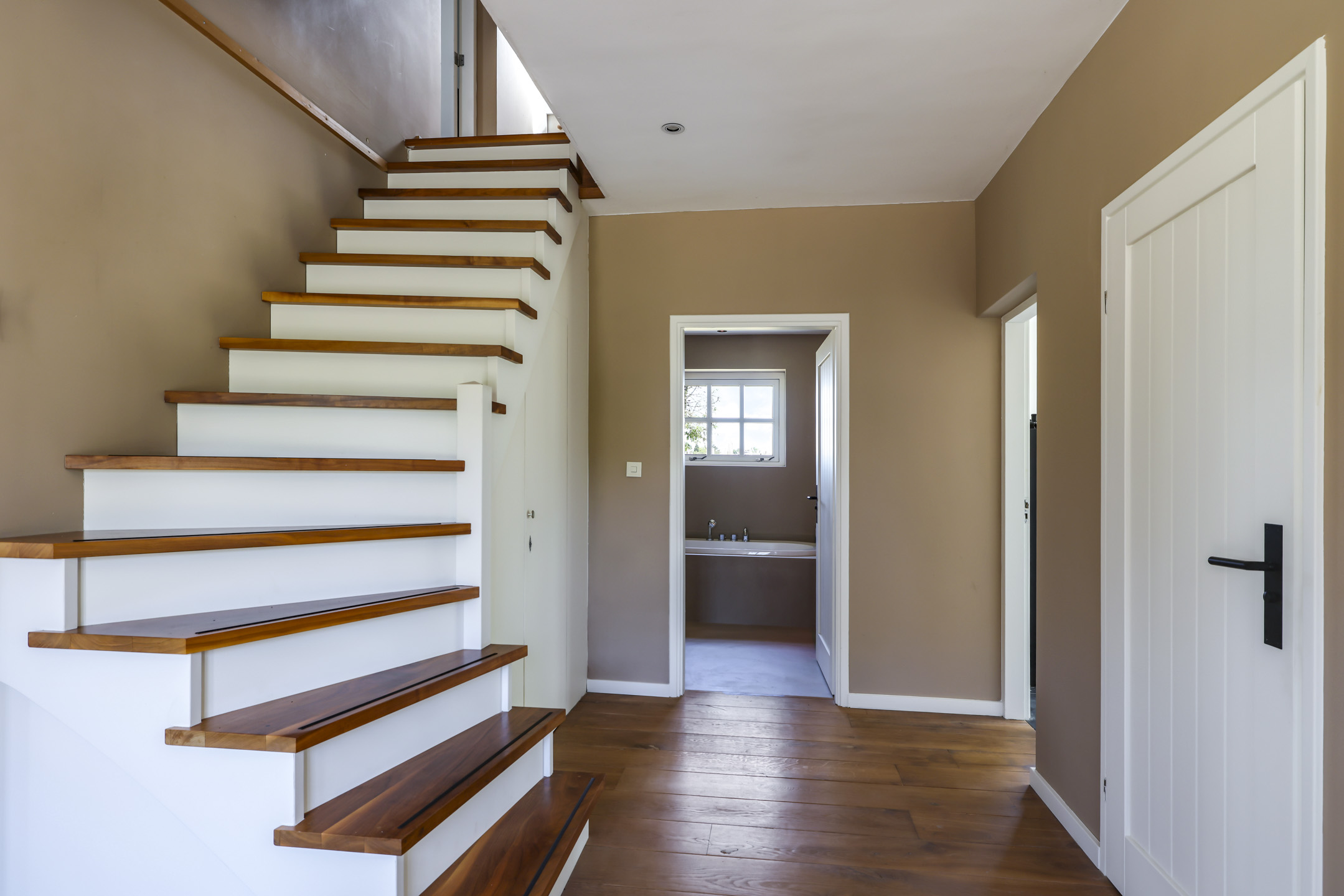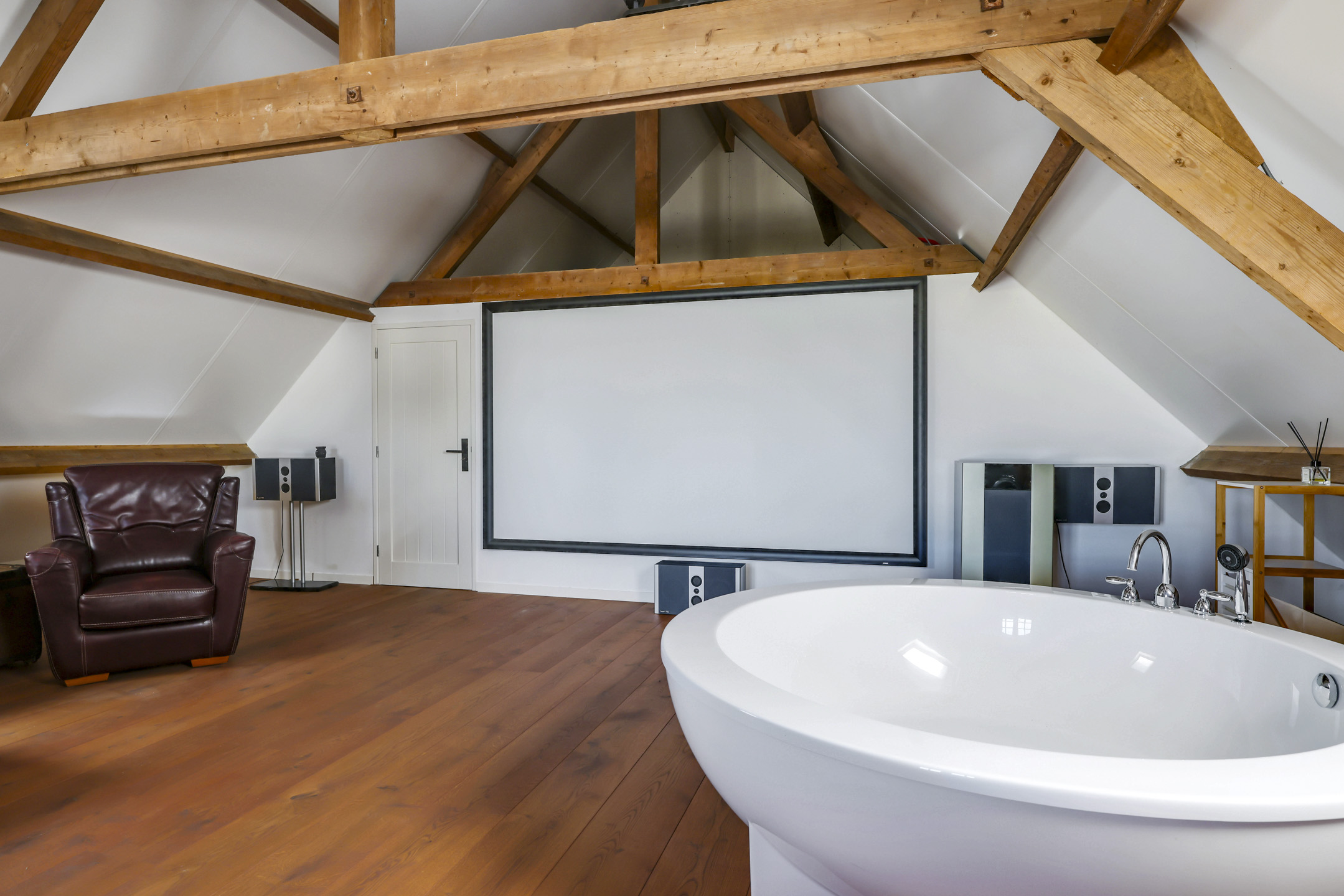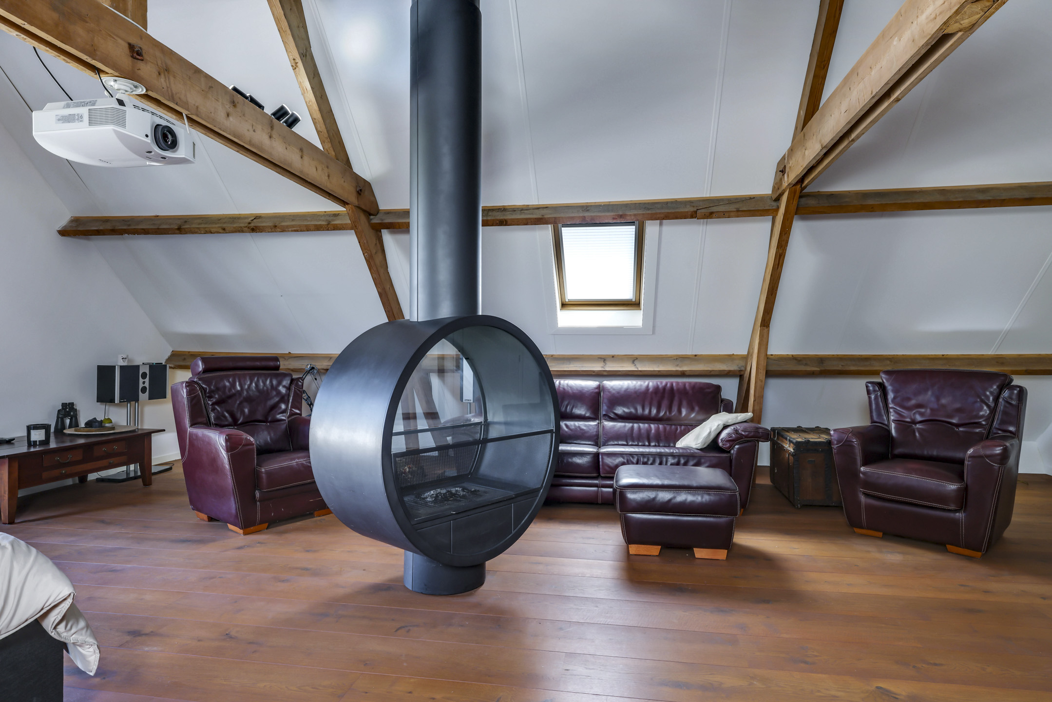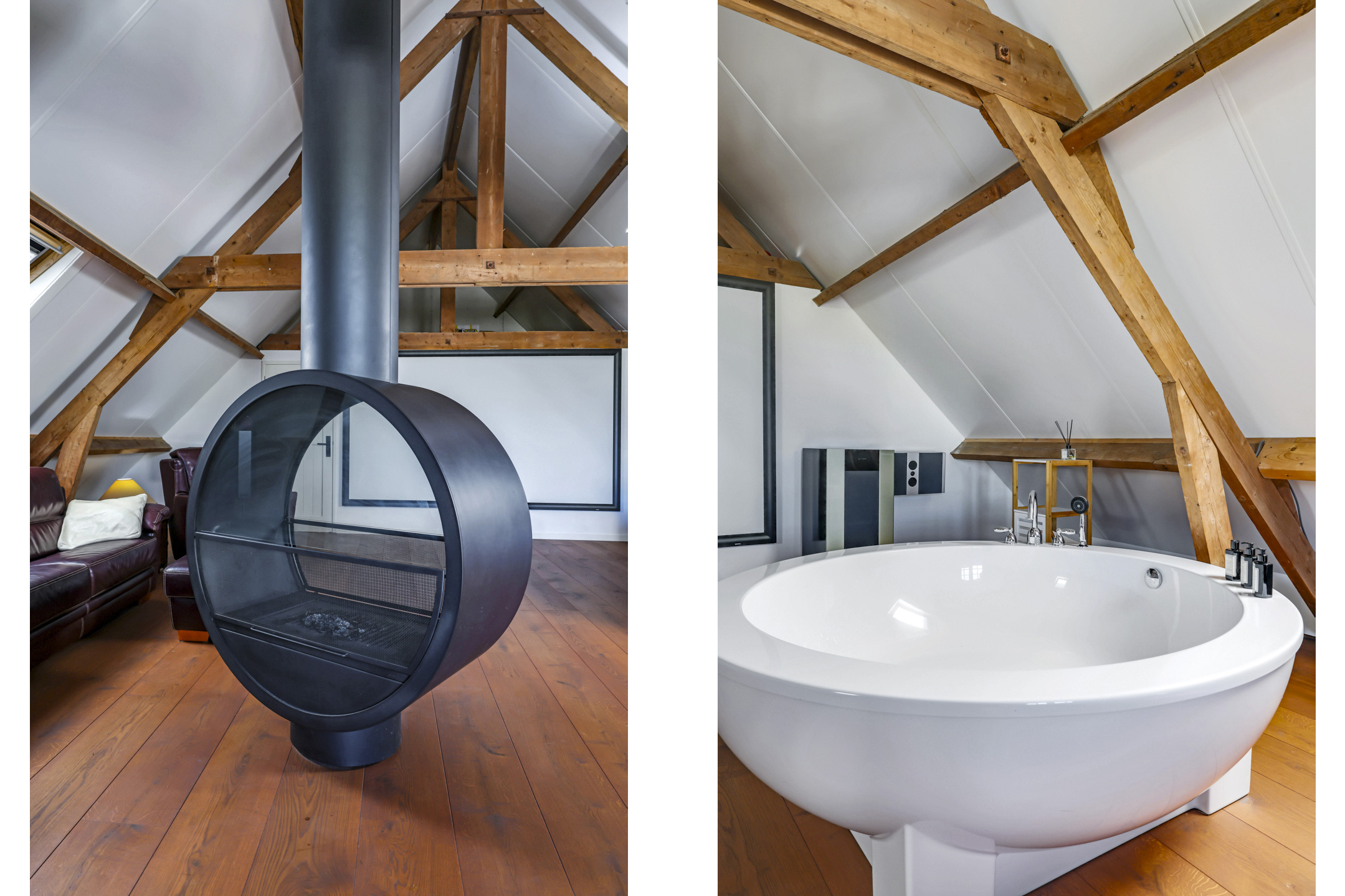 De 1e verdieping is opgedeeld in een zeer riante masterbedroom, nog een slaapkamer en een badkamer. De masterbedroom is van hetzelfde formaat als de woonkamer dus maar liefst ca. 75m² groot. Geen wonder dat hier dan ook een royaal, rond bad (Dreamscape) is geplaatst met daarbij een passende ronde, draaibare houtkachel (Boley). Aansluitend aan deze kamer is het dakterras van ca. 27m² bereikbaar.