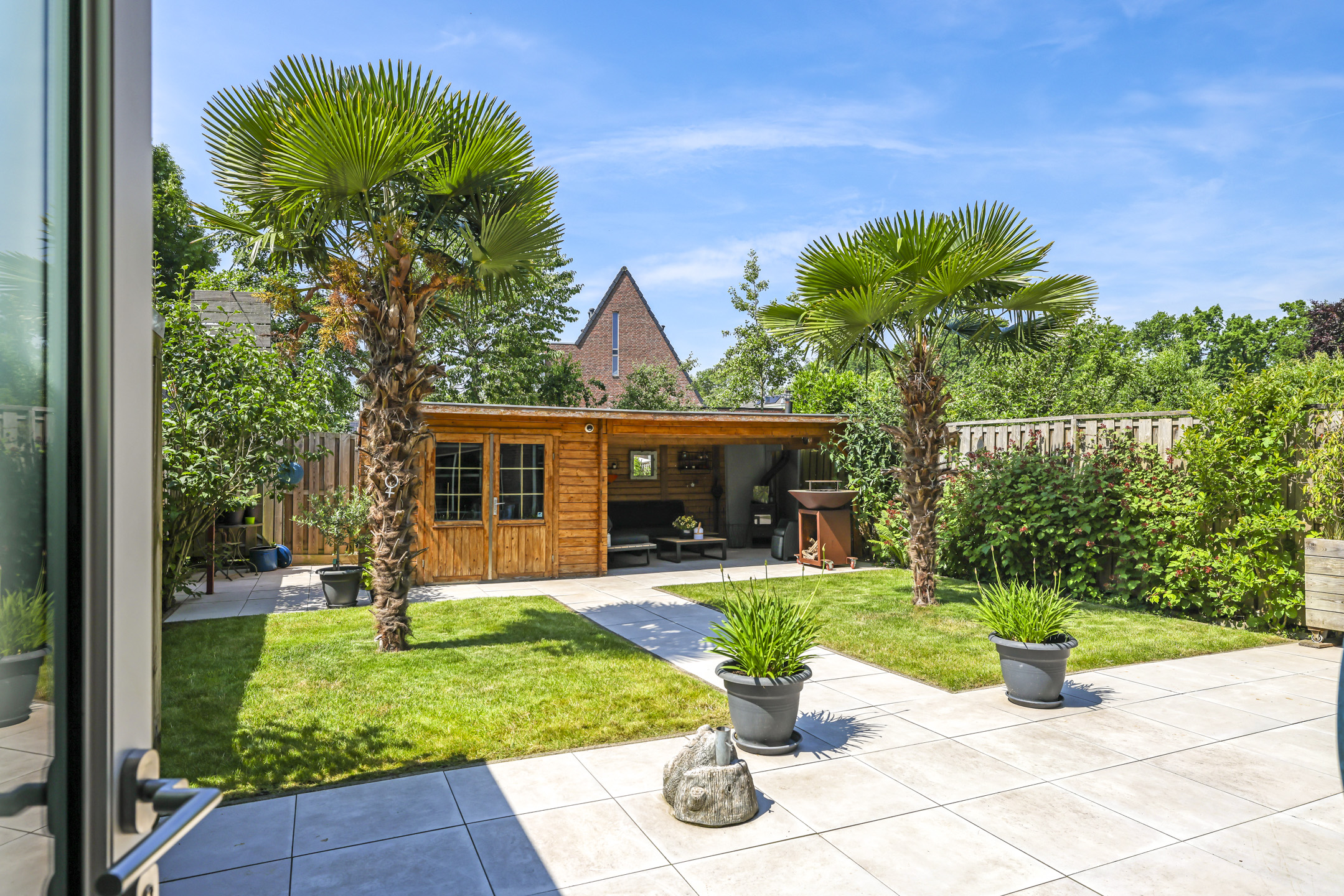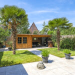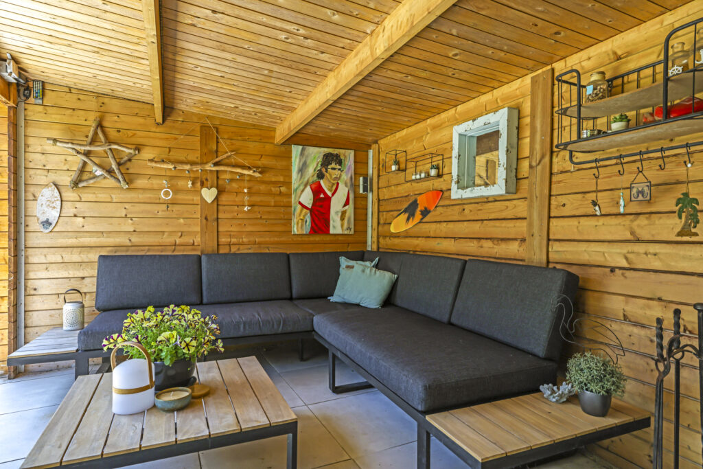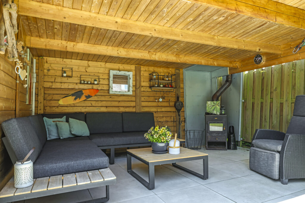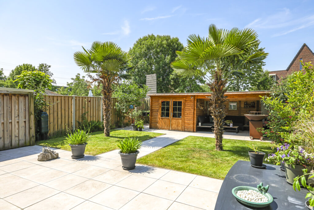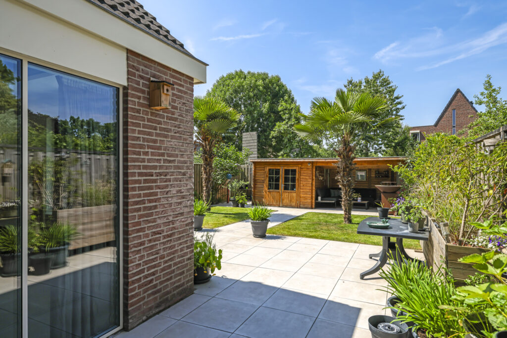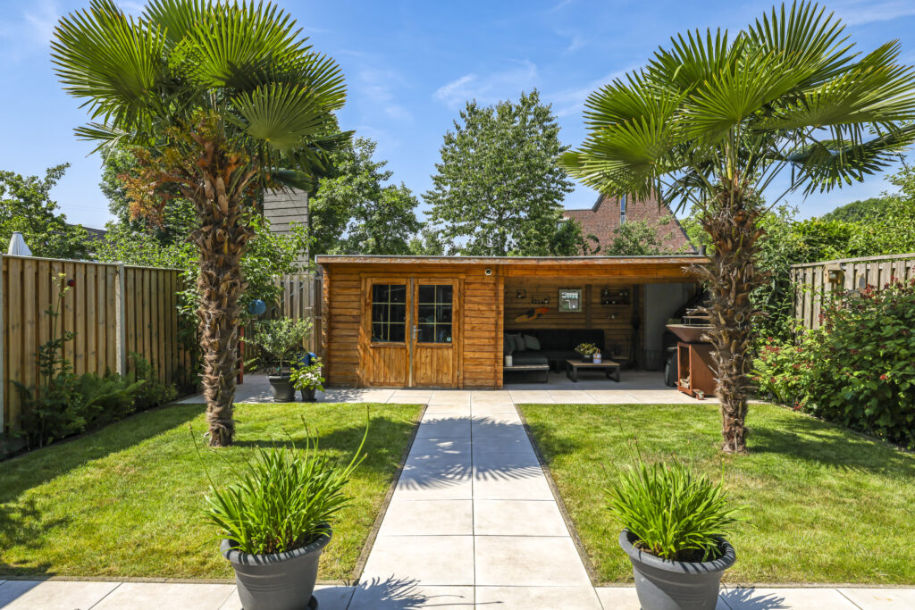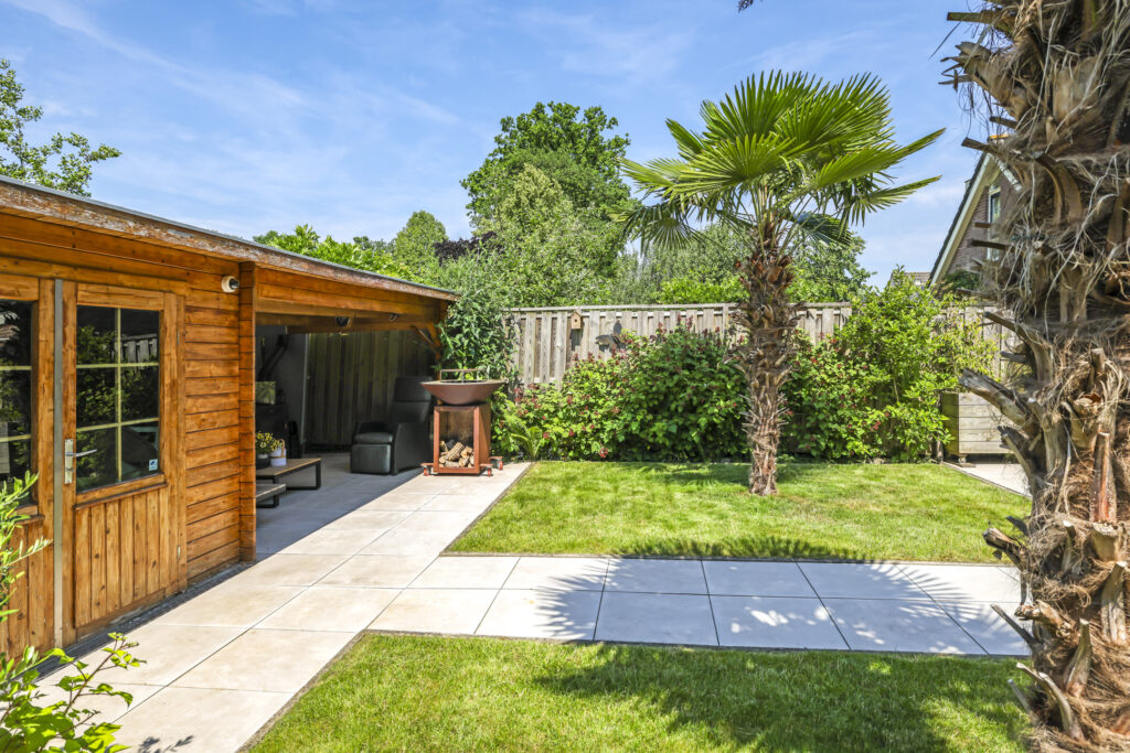 De tuin heeft een verzorgd en onderhoudsarm karakter die in 2017 geheel opnieuw is aangelegd. De 2 palmbomen zullen (helaas) meegaan met de verkoper, maar verder biedt de tuin een heerlijk zonneterras met strakke, keramische tegels (60×60) en een grasgazon. Achterin de tuin staat een fraai bijgebouw die bestaat uit een schuur (9m2) en een veranda (12m2). Noemenswaardig is dat de houtkachel achter blijft zodat je zelfs in de winter buiten kunt zitten. Tevens is er een houthok aanwezig waar je een voorraad kachelhout kunt opslaan.