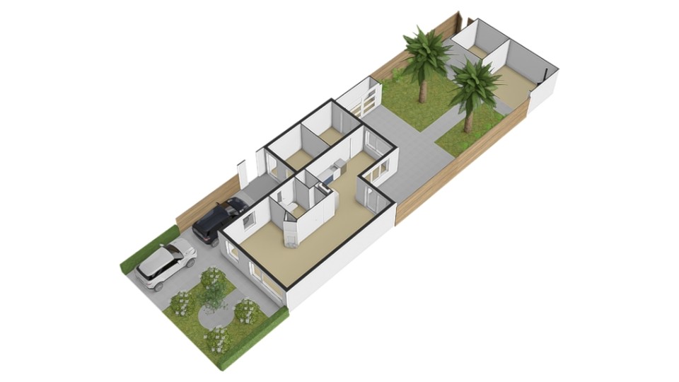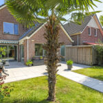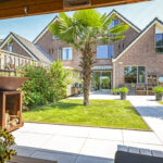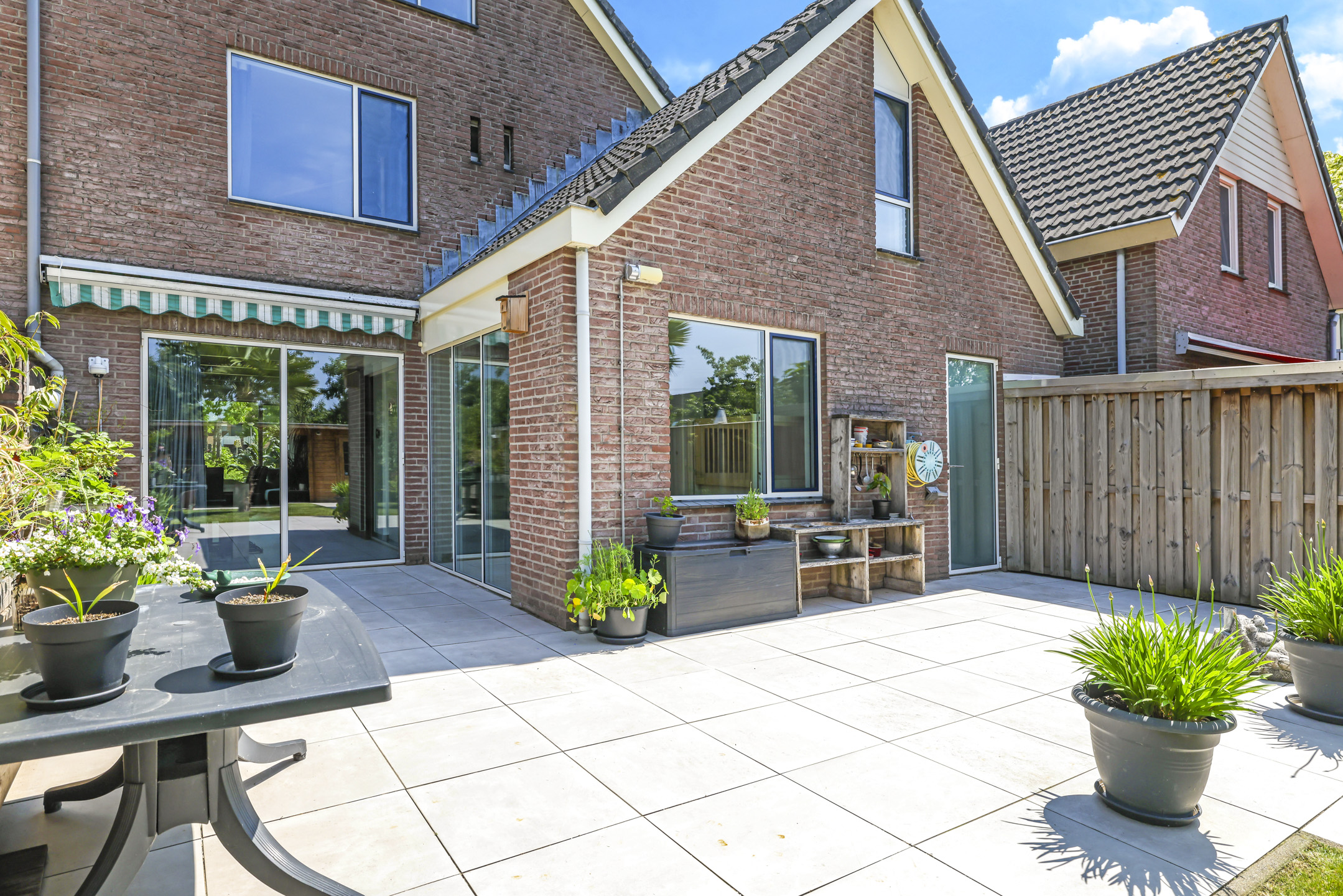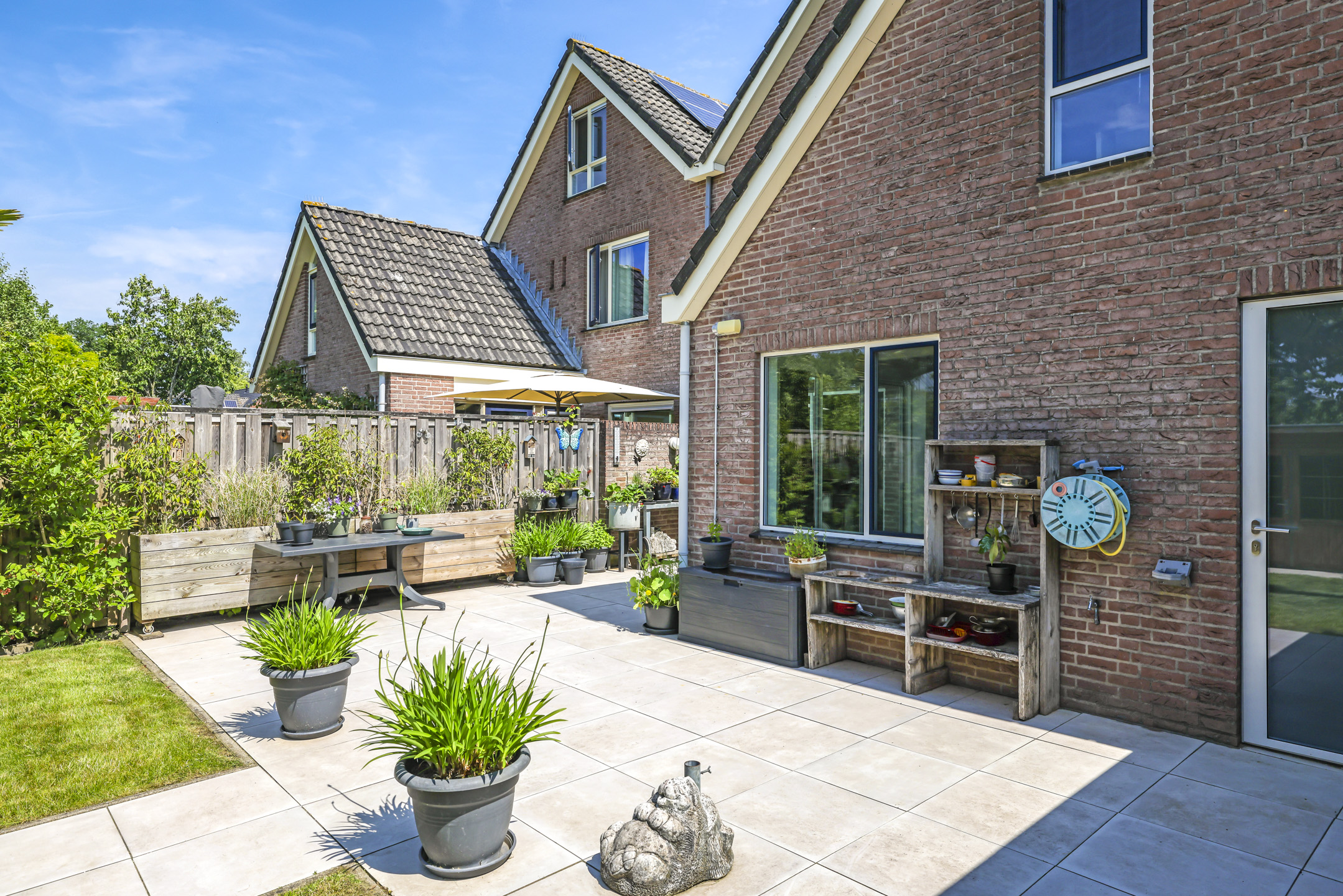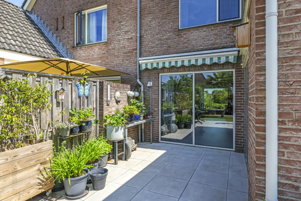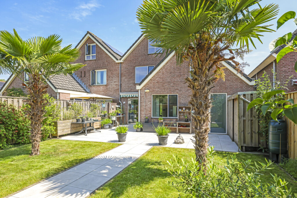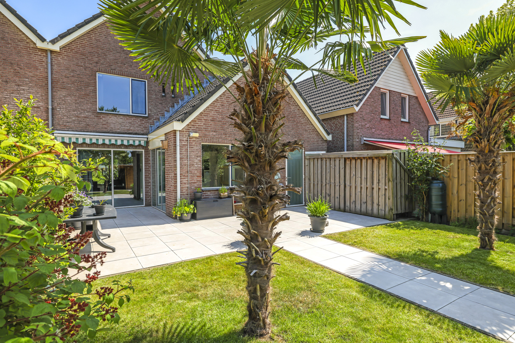 De tuin heeft een verzorgd en onderhoudsarm karakter die in 2017 geheel opnieuw is aangelegd. De 2 palmbomen zullen (helaas) meegaan met de verkoper, maar verder biedt de tuin een heerlijk zonneterras met strakke, keramische tegels (60×60) en een grasgazon. Achterin de tuin staat een fraai bijgebouw die bestaat uit een schuur (9m2) en een veranda (12m2). Noemenswaardig is dat de houtkachel achter blijft zodat je zelfs in de winter buiten kunt zitten. Tevens is er een houthok aanwezig waar je een voorraad kachelhout kunt opslaan.