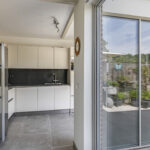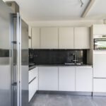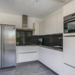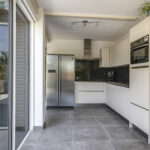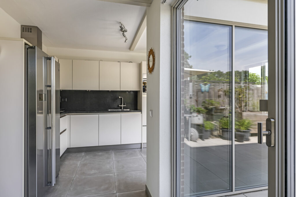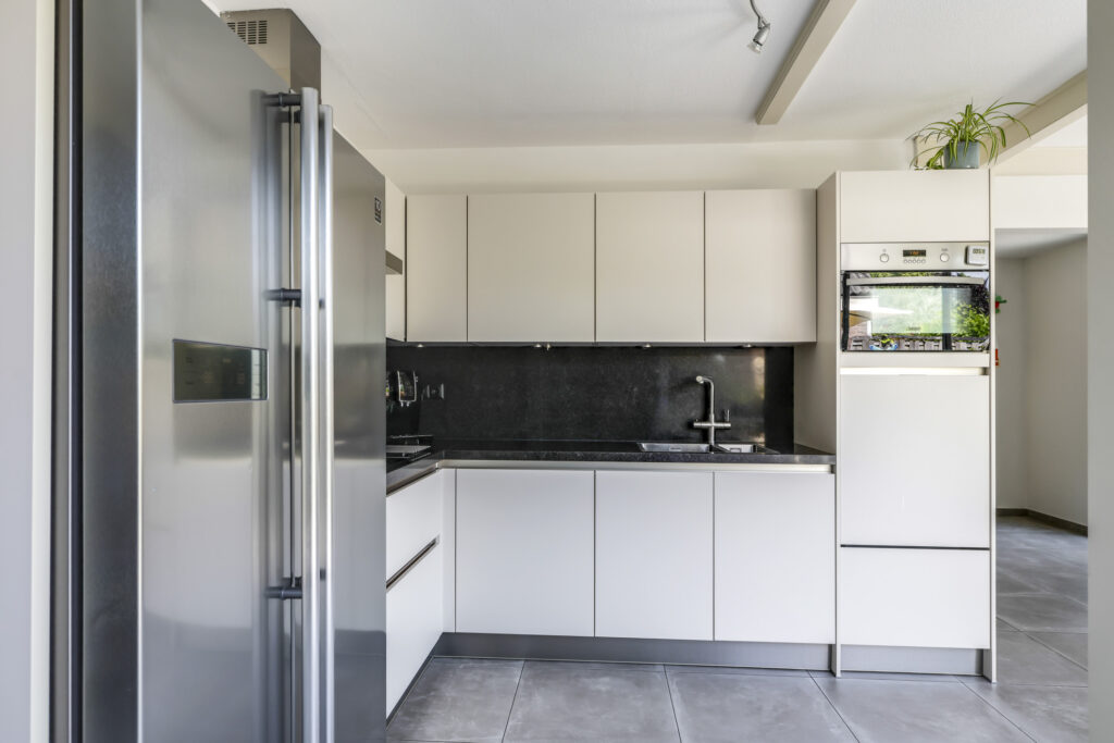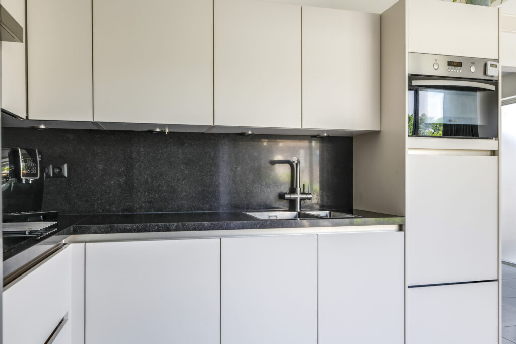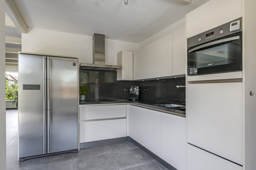 De keuken heeft een open karakter met de woonkamer waarbij de keuken in een hoekopstelling is geplaatst. De keuken is van zichzelf al lekker ruim opgezet, maar ook hier zorgen raampartijen tot aan de vloer weer voor een ruimtelijk gevoel. De keukenopstelling heeft witte, greeploze fronten waarbij het zwarte aanrechtblad van natuursteen (composiet) de keuken een luxe uitstraling geeft. De inbouwapparatuur bestaat uit een vaatwasser op hoogte (2024), een combi-oven/magnetron en een 4-pits inductie kookplaat met afzuigschouw. De aanwezige Amerikaanse koel/vriescombi blijft eveneens achter. Andere pluspunten zijn de kokend waterkraan en de slimme hoekkast (Le-manslede) die je voor een groot gedeelte uit de kast kan draaien. Spotverlichting maakt het plaatje helemaal compleet.