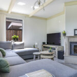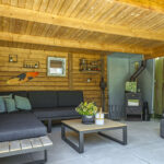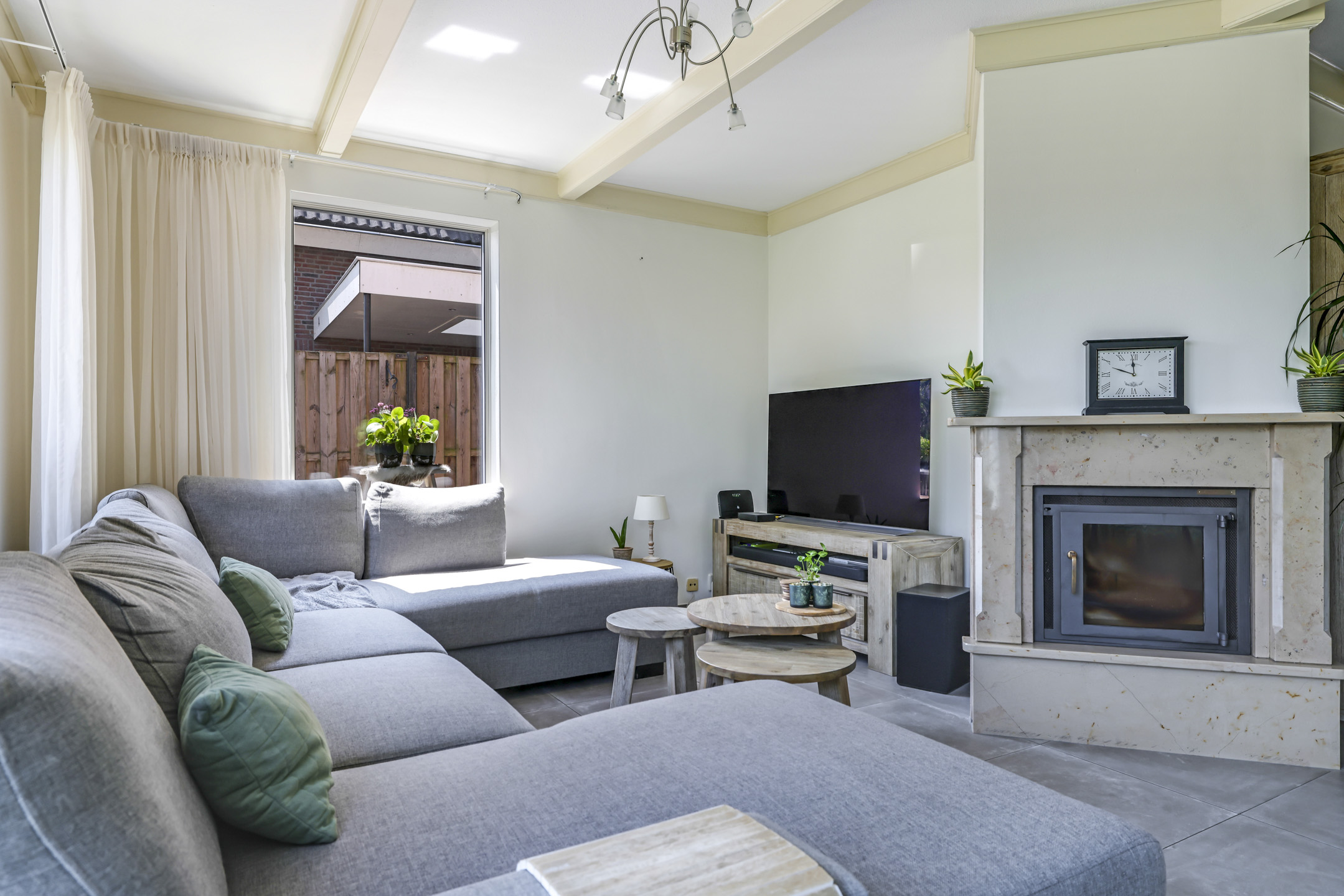 Woonkamer met L-indeling, ingebouwde houtkachel en dubbele terrasdeuren