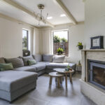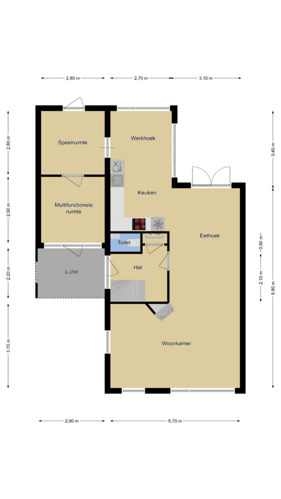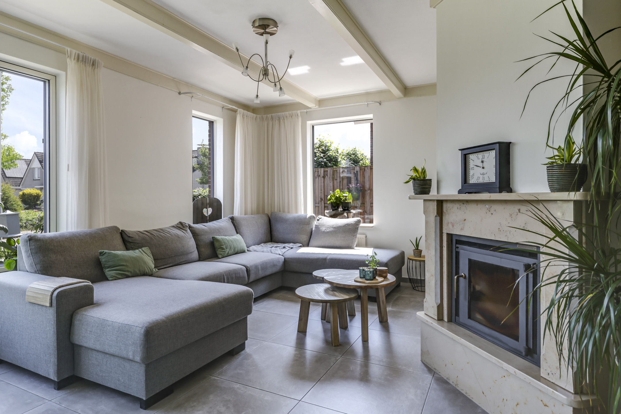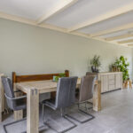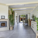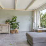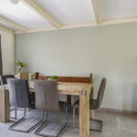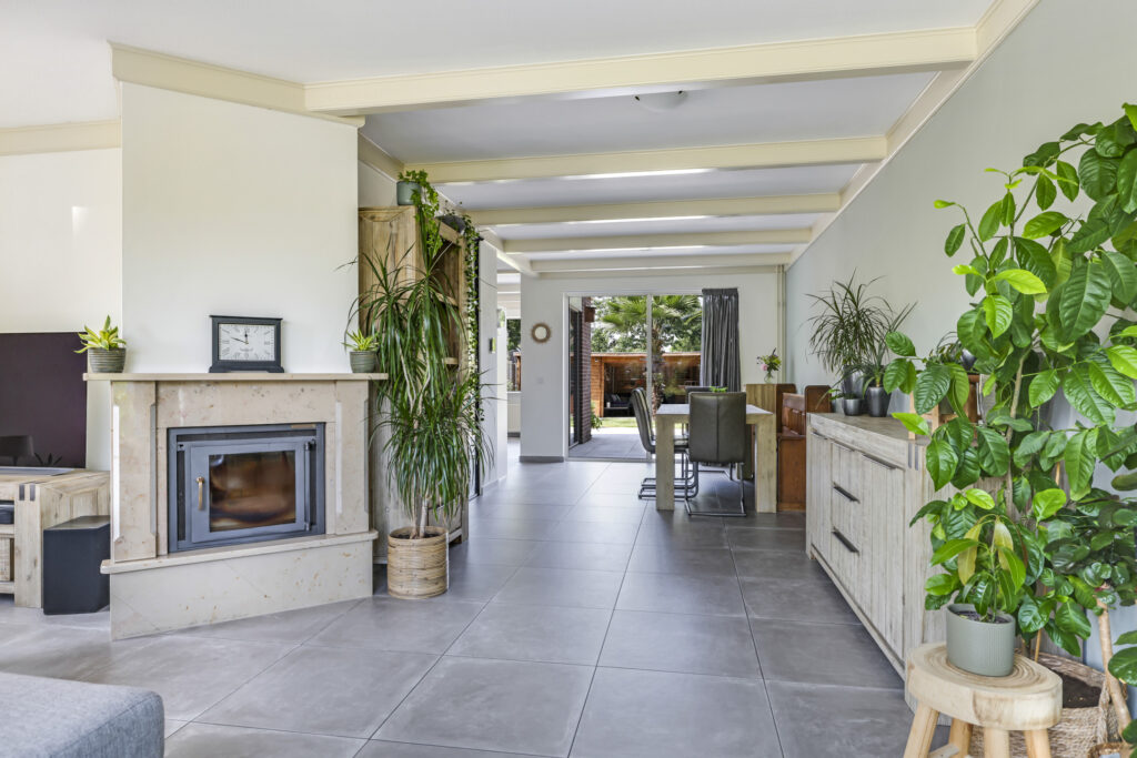 De woonkamer is aan de voorzijde gelegen en heeft een klassieke L-indeling die doorloopt tot aan de keuken aan de achterzijde. Doordat de woning van zichzelf al een mooie breedtemaat heeft (5,7m inpandig), voelt de woonkamer ruim aan. Dit ruimtelijke gevoel wordt versterkt door de grote ramen die voor veel lichtinval zorgen. Aan de voorzijde kun je een gezellige zithoek creëren met plaats voor een groot TV-scherm aan de wand. Centraal in de ruimte is een houtkachel ingebouwd. Koud hoef je het zeker niet te krijgen aangezien de plavuizen vloer (tegels 60×60 met betonlook) is voorzien van vloerverwarming. Opvallend is de brede overgang naar de keuken waar je met gemak een lange 6- tot 8-persoons eettafel kwijt kunt. Dubbele terrasdeuren geven direct toegang tot het buitenterras. Trendy detail is de zwartstalen deur naar de hal die tevens voor een leuke doorkijk zorgt.