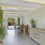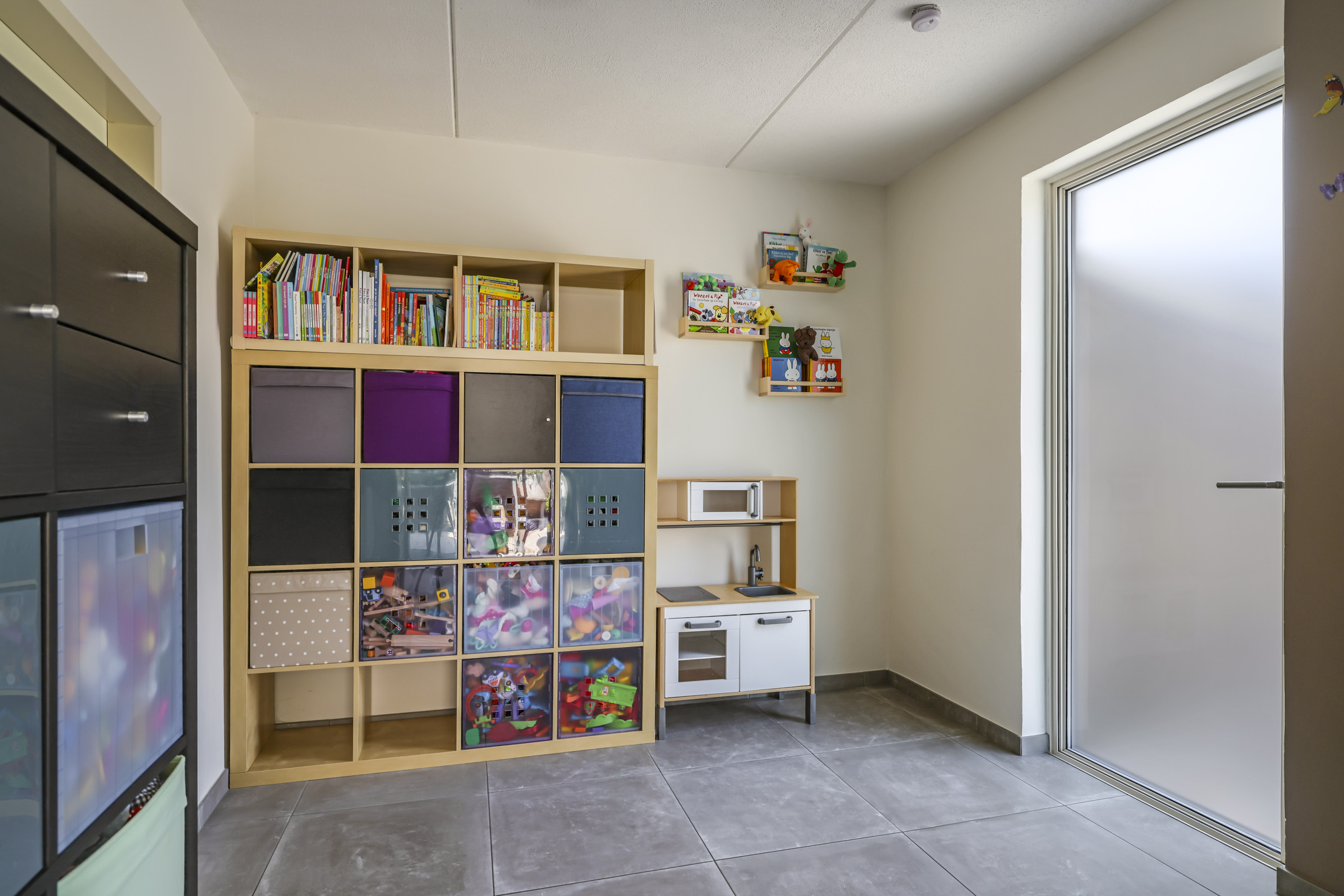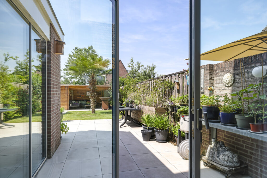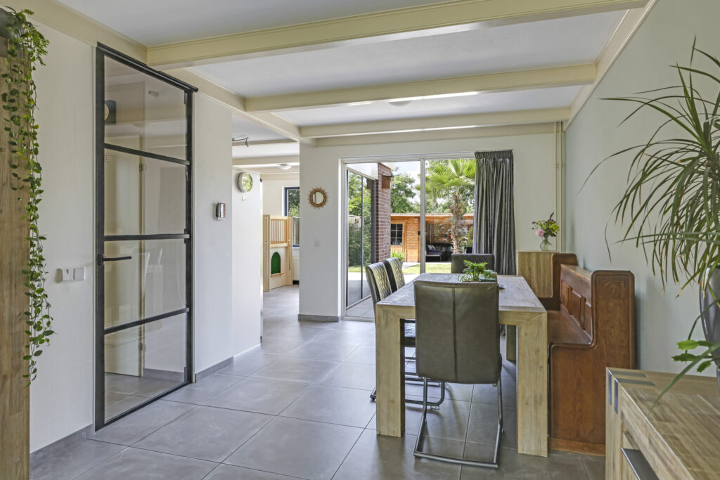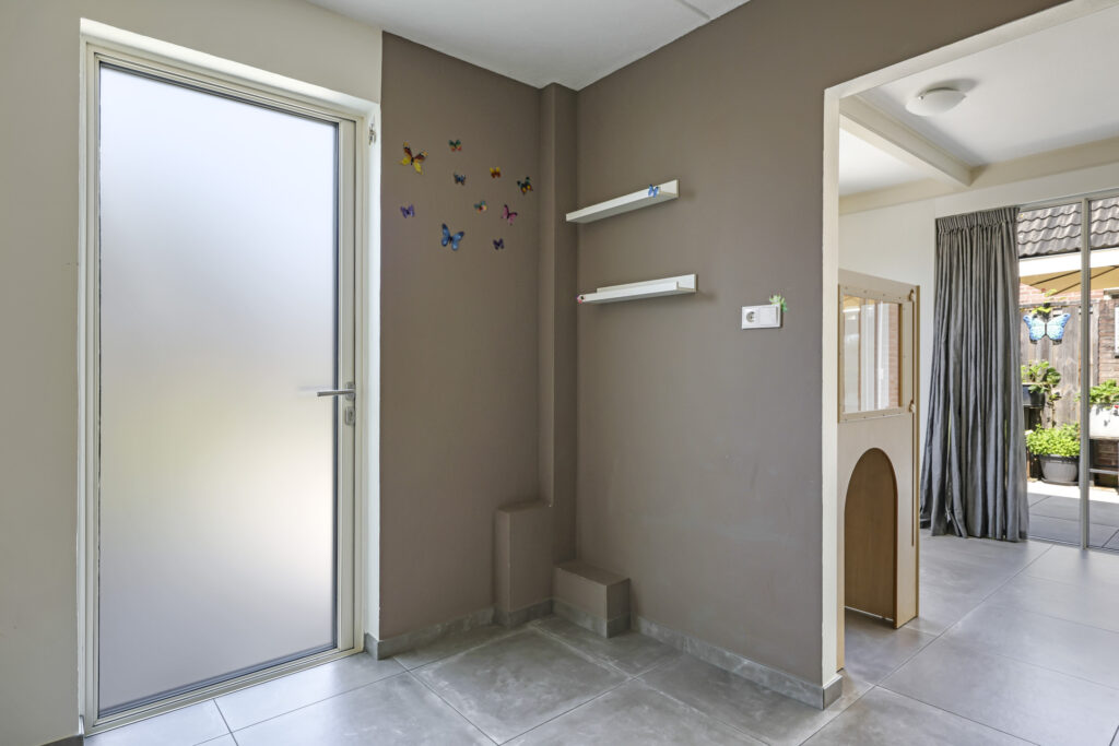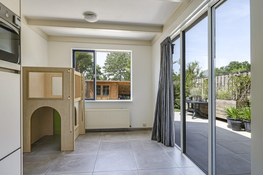 Vanuit de keuken is er een doorloop naar de voormalige garage. Deze ruimte is opgedeeld in een voor- en achtergedeelte die je beiden voor meerdere doeleinde kunt gebruiken. In de huidige setting wordt het voorste gedeelte gebruikt als inpandige berging c.q. stallingsruimte en het achterste gedeelte als speelruimte voor kinderen. Maar je kunt hier ook heel gemakkelijk een salon of praktijk aan huis creëren. De oorspronkelijke garagedeur is verwijderd en hier is een nieuwe pui met deur en glas voor in de plaats gekomen. De (stallings)ruimte heeft dus een eigen entree. Tevens is de ruimte verwarmd middels een radiator. Het achterste gedeelte zou je bijvoorbeeld ook kunnen gebruiken als bijkeuken of werkkamer. Hier biedt een tuindeur direct toegang tot het buitenterras.