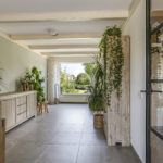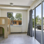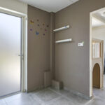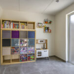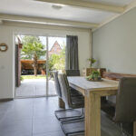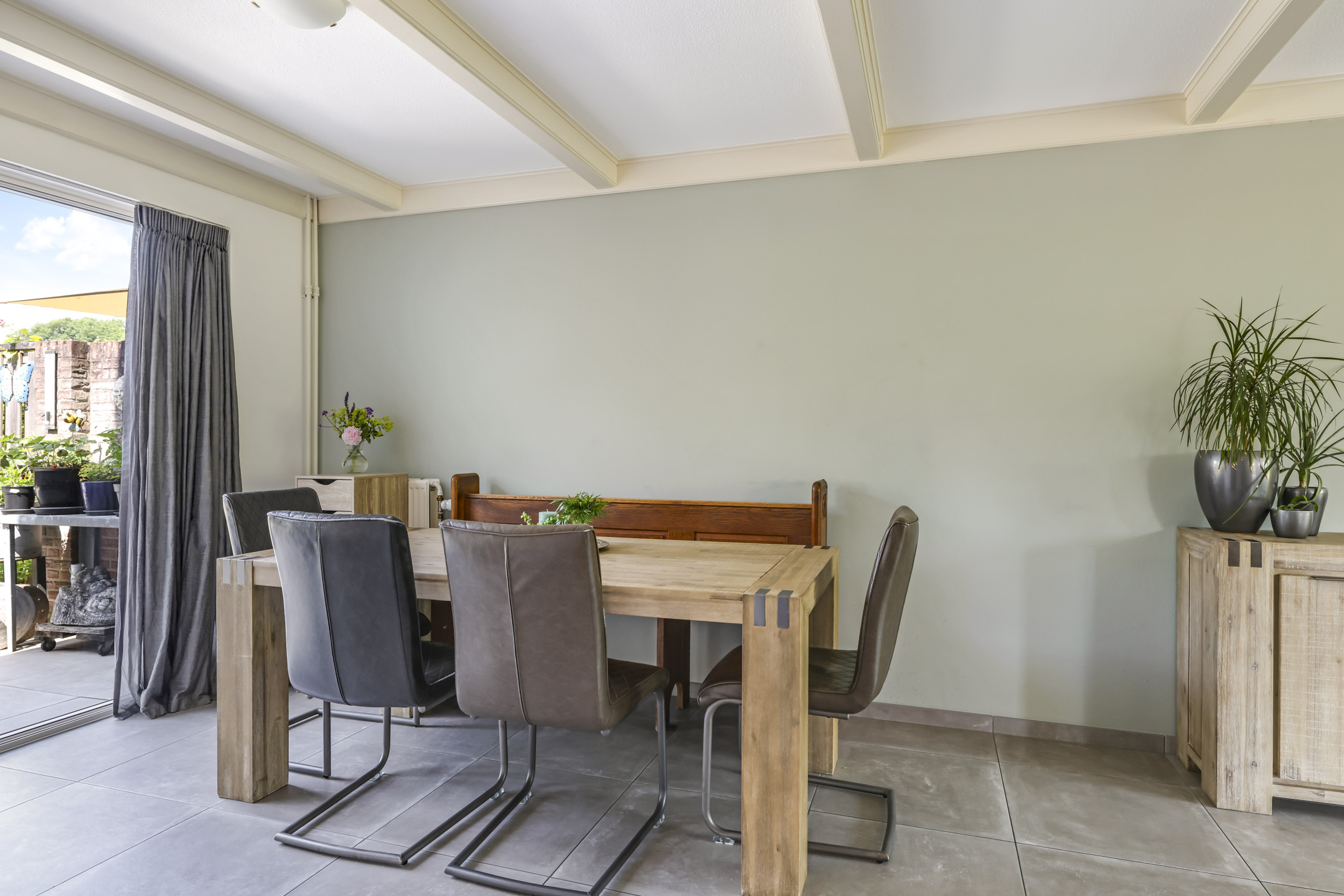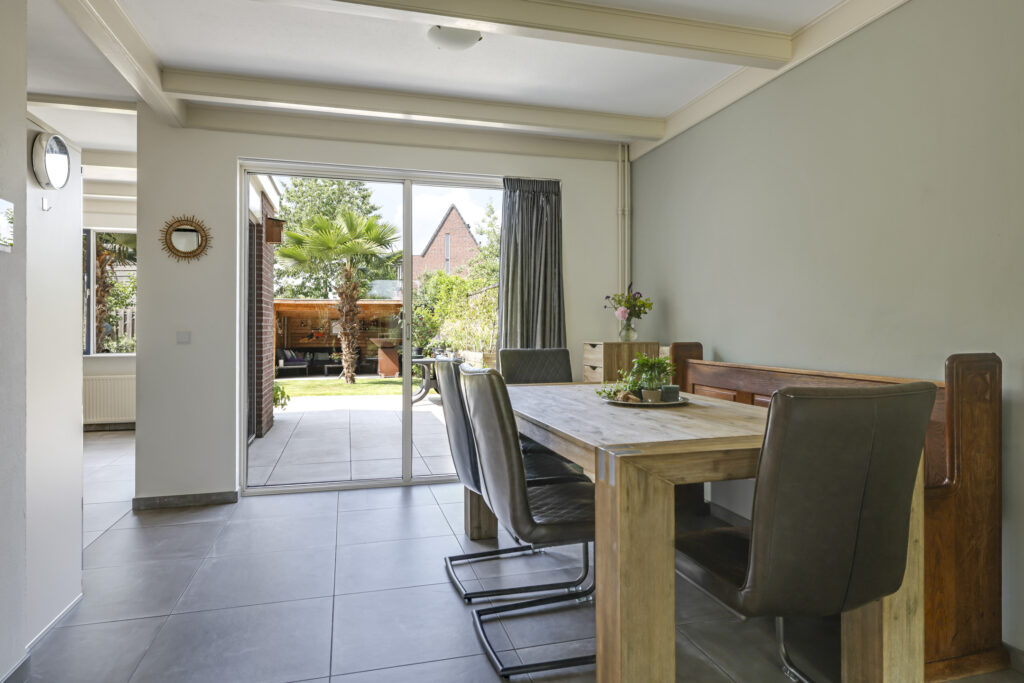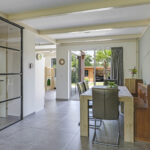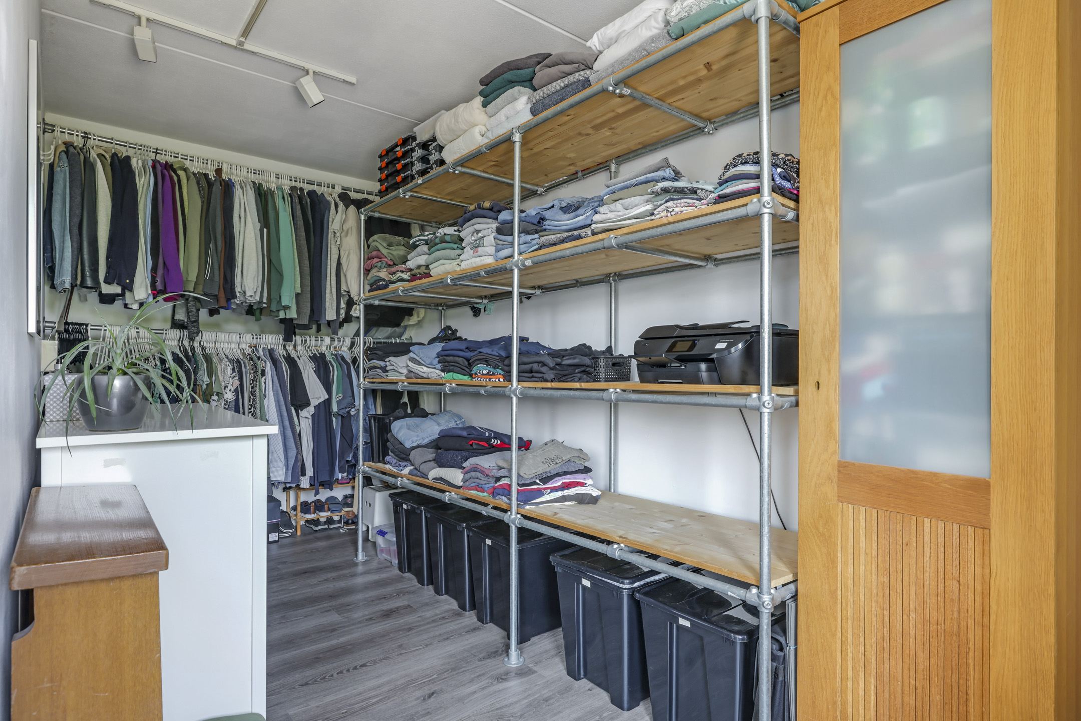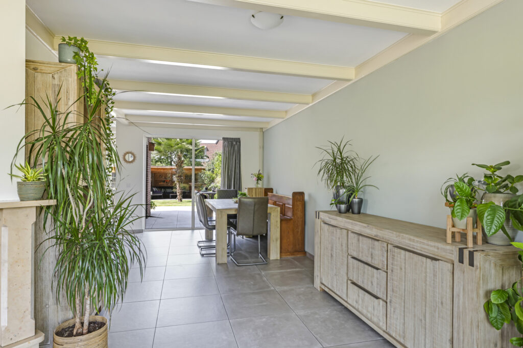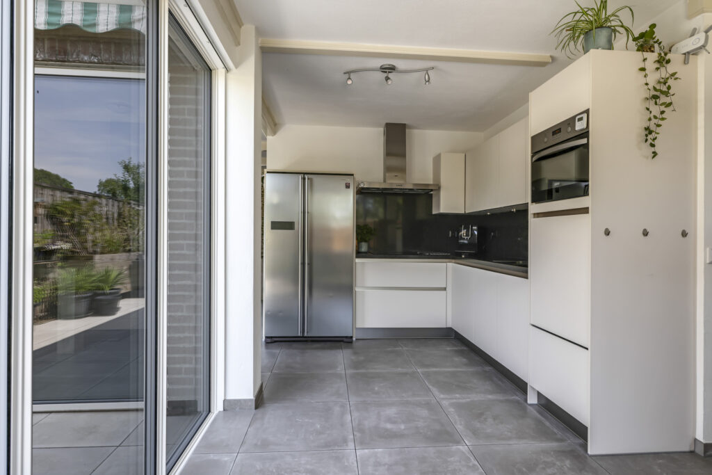 Vanuit de keuken is er een doorloop naar de voormalige garage. Deze ruimte is opgedeeld in een voor- en achtergedeelte die je beiden voor meerdere doeleinde kunt gebruiken. In de huidige setting wordt het voorste gedeelte gebruikt als inpandige berging c.q. stallingsruimte en het achterste gedeelte als speelruimte voor kinderen. Maar je kunt hier ook heel gemakkelijk een salon of praktijk aan huis creëren. De oorspronkelijke garagedeur is verwijderd en hier is een nieuwe pui met deur en glas voor in de plaats gekomen. De (stallings)ruimte heeft dus een eigen entree. Tevens is de ruimte verwarmd middels een radiator. Het achterste gedeelte zou je bijvoorbeeld ook kunnen gebruiken als bijkeuken of werkkamer. Hier biedt een tuindeur direct toegang tot het buitenterras.