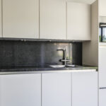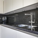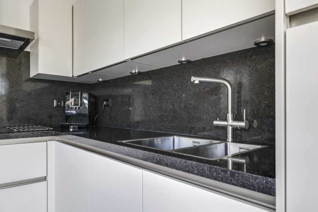 Moderne inbouwkeuken met o.a. een werkblad van composiet