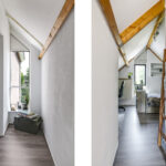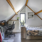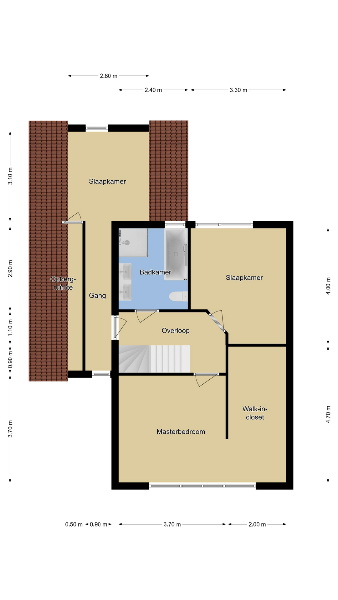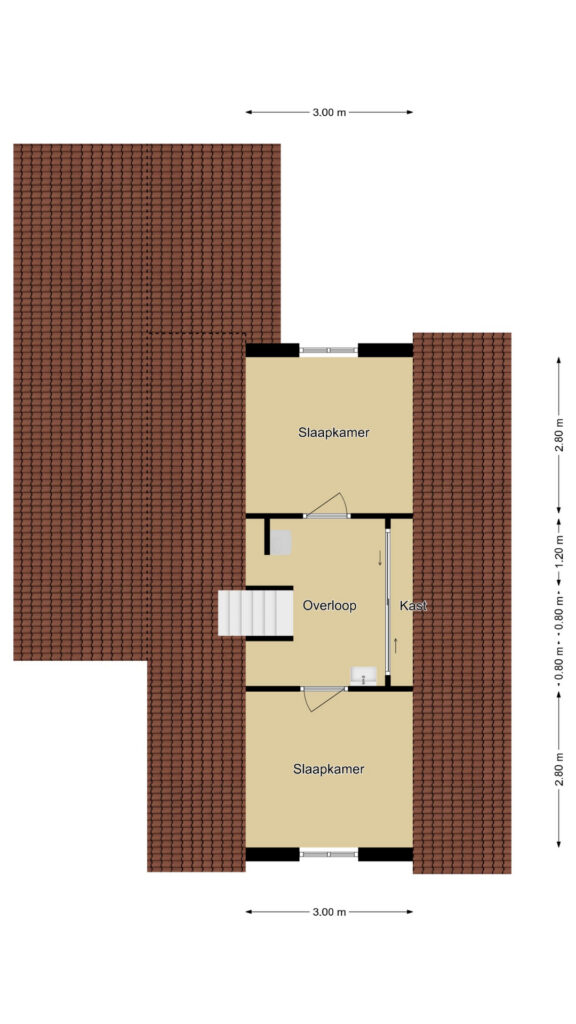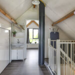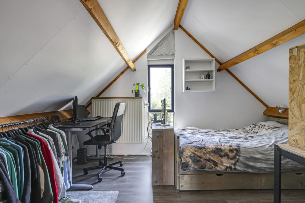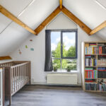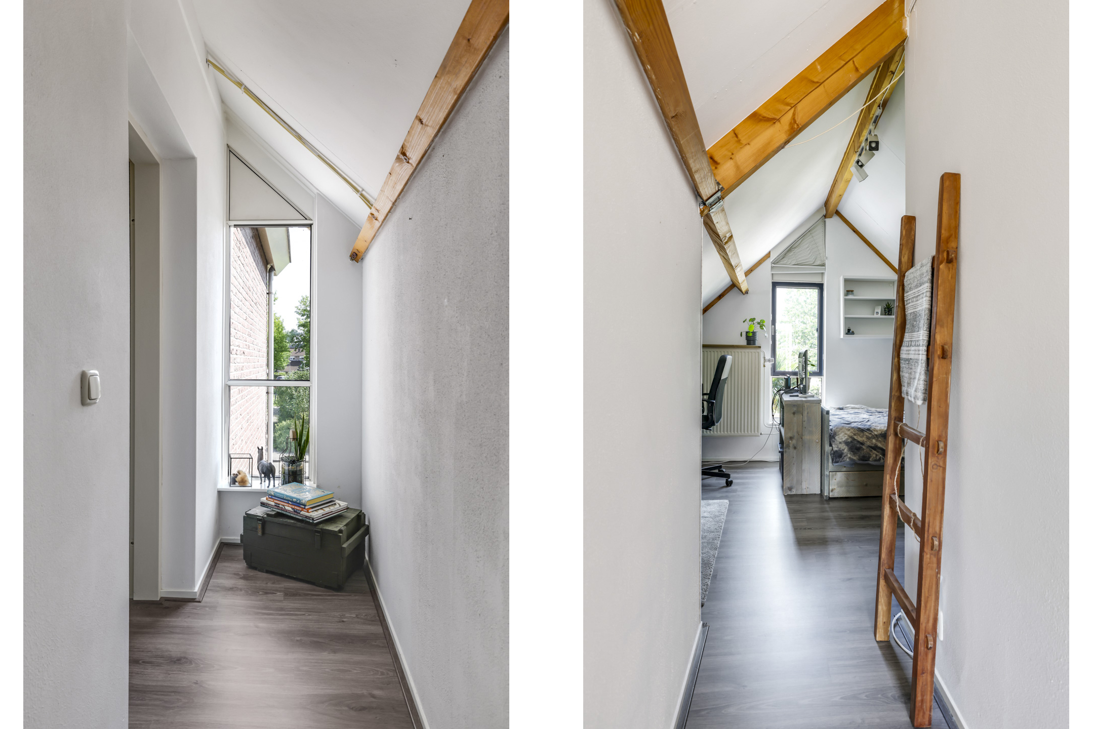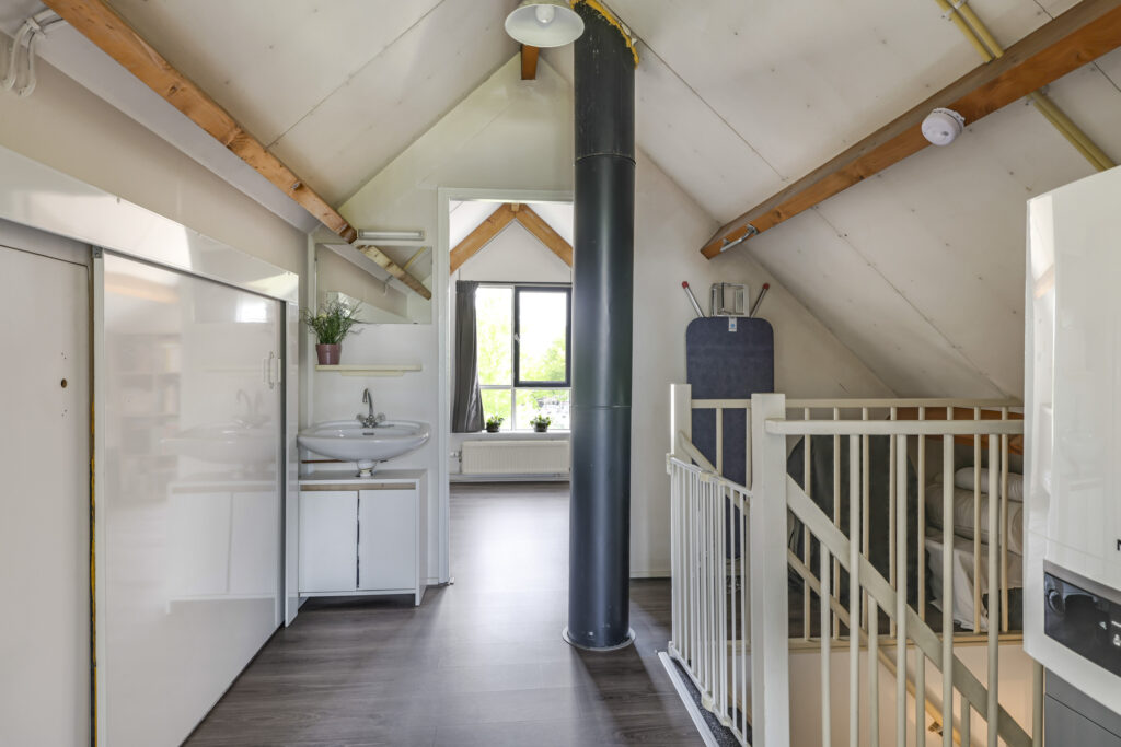 Een 2e vaste trap brengt je naar de 2e verdieping. Deze woonlaag biedt ruimte aan nog eens 2 volwaardige slaapkamers en een overloop. Deze slaapkamers zijn beiden even groot en hebben eveneens het ruimtelijke gevoel tot in de 2,7 meter hoge nok. Vaak wanneer de 2e verdieping is opgedeeld in verschillende ruimte, is de overloop erg klein. Dit in tegenstelling tot deze woning. Hier biedt de overloop ruimte aan de CV-ketelopstelling, een wastafel en een vaste schuif/kastenwand onder het schuine dakvlak. Handig wanneer je toch spullen als koffers, een winterdekbed en kerstballen wil opbergen.
