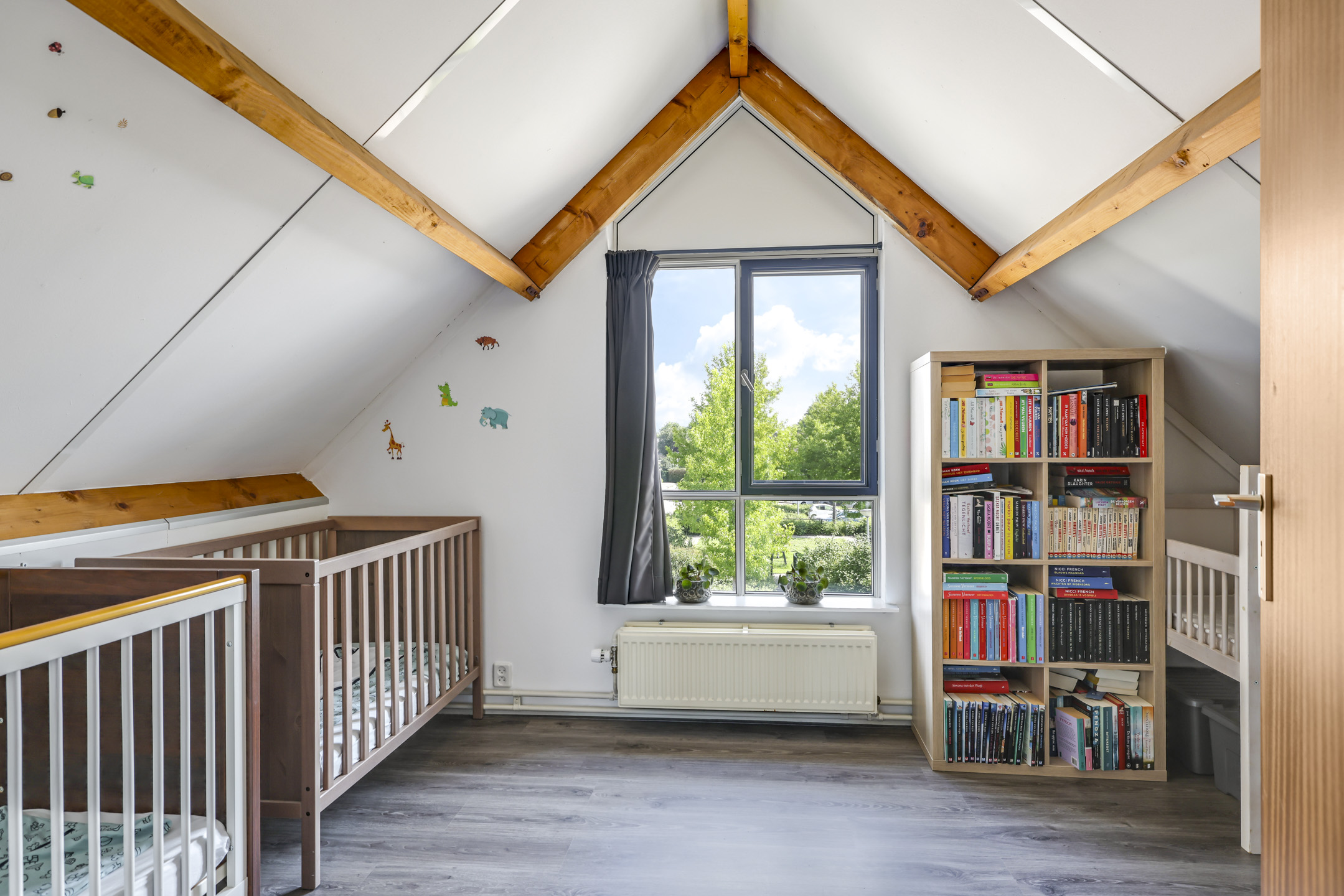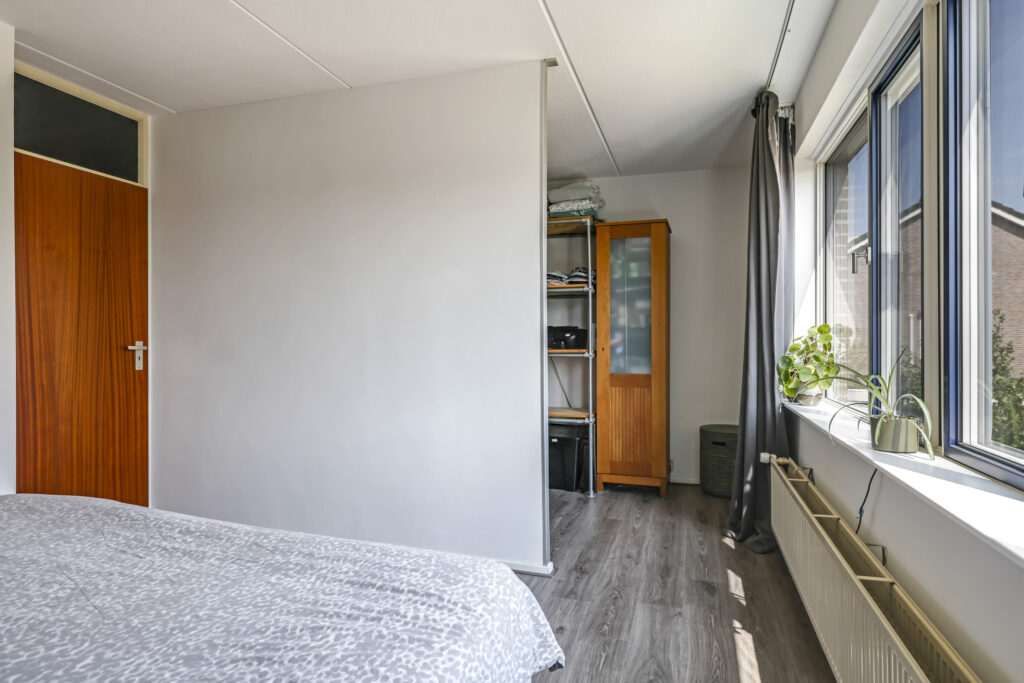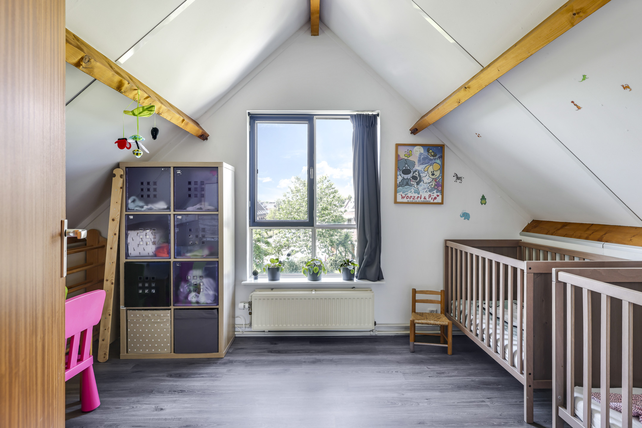Via een hardhouten trapopgang in de hal bereiken we de overloop op de 1e verdieping. Van origine had de woning op deze woonlaag 3 slaapkamers en een extra kamer boven de garage. Echter, doordat de 2 slaapkamers aan de voorzijde bij elkaar zijn getrokken, is er een royale masterbedroom met walk-in-closet ontstaan. Je kunt hier met gemak een groot 2-persoonsbed en een uitgebreide garderobe kwijt. De 2e slaapkamer is eveneens volwaardig te noemen. Verrassend is de 3e slaapkamer die boven de voormalige garage is gelegen. Deze kamer ligt helemaal op zichzelf en heeft aan de achterzijde een eigen kap met een nok die op 2,6 meter hoog ligt. Dit zorgt voor een speels effect.