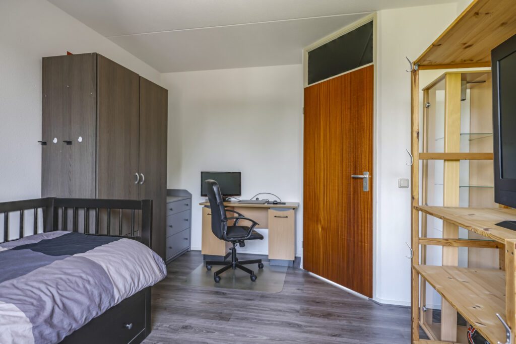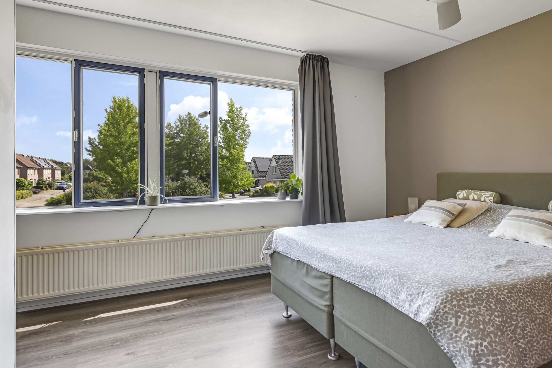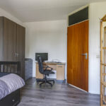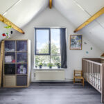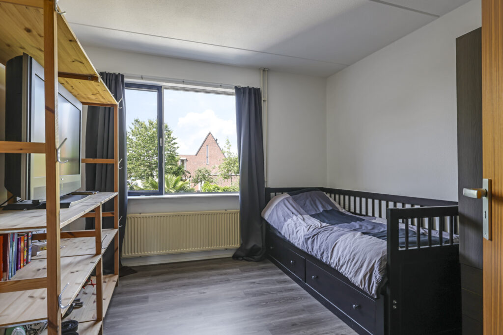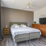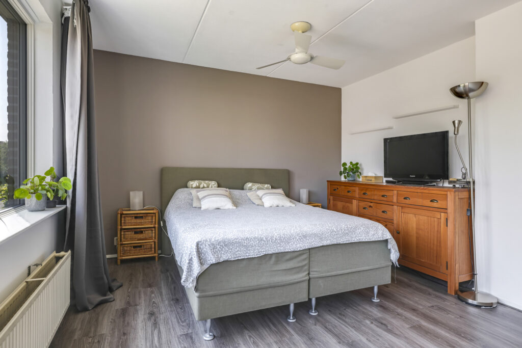 Via een hardhouten trapopgang in de hal bereiken we de overloop op de 1e verdieping. Van origine had de woning op deze woonlaag 3 slaapkamers en een extra kamer boven de garage. Echter, doordat de 2 slaapkamers aan de voorzijde bij elkaar zijn getrokken, is er een royale masterbedroom met walk-in-closet ontstaan. Je kunt hier met gemak een groot 2-persoonsbed en een uitgebreide garderobe kwijt. De 2e slaapkamer is eveneens volwaardig te noemen. Verrassend is de 3e slaapkamer die boven de voormalige garage is gelegen. Deze kamer ligt helemaal op zichzelf en heeft aan de achterzijde een eigen kap met een nok die op 2,6 meter hoog ligt. Dit zorgt voor een speels effect.