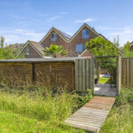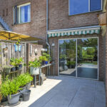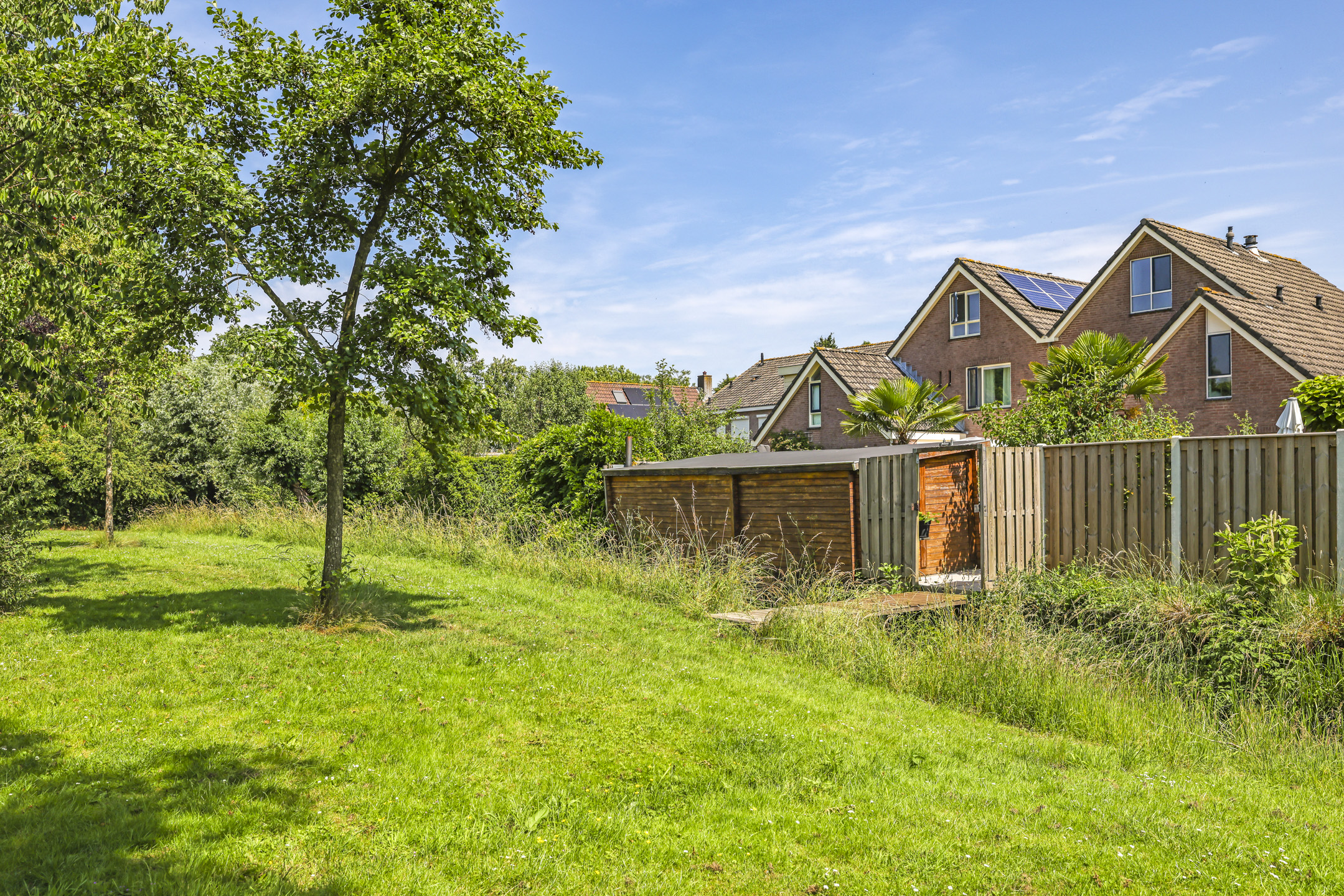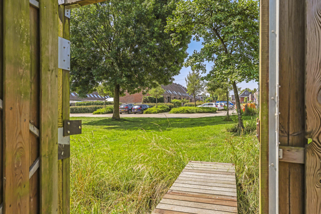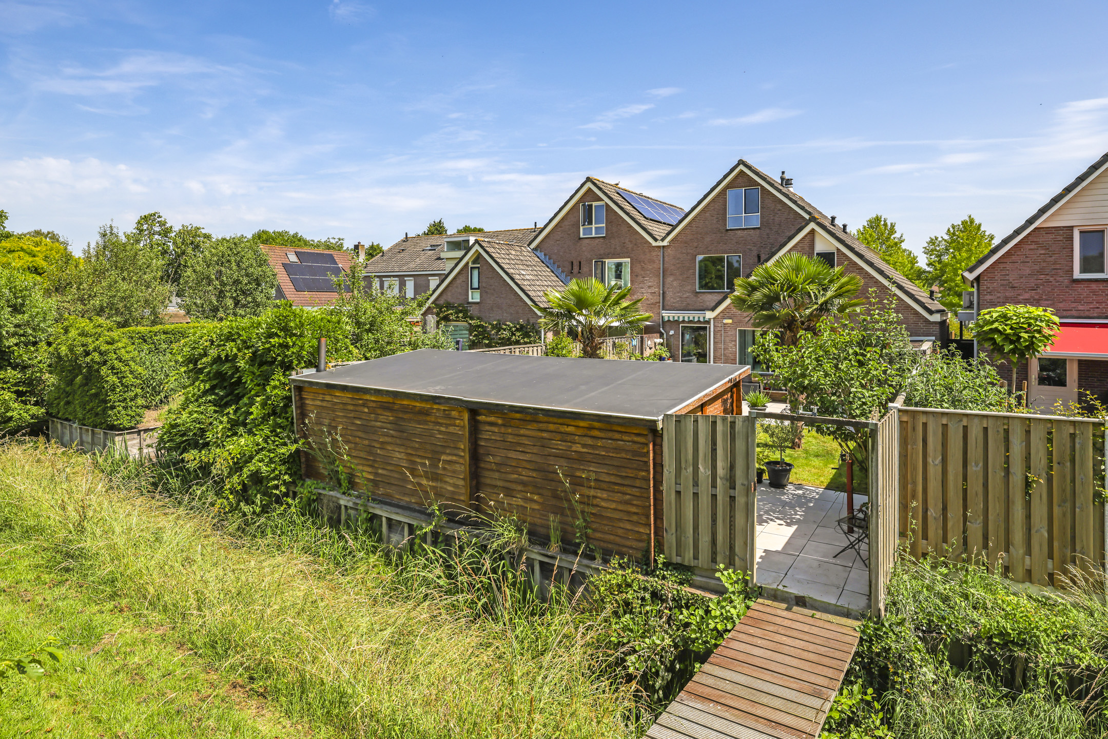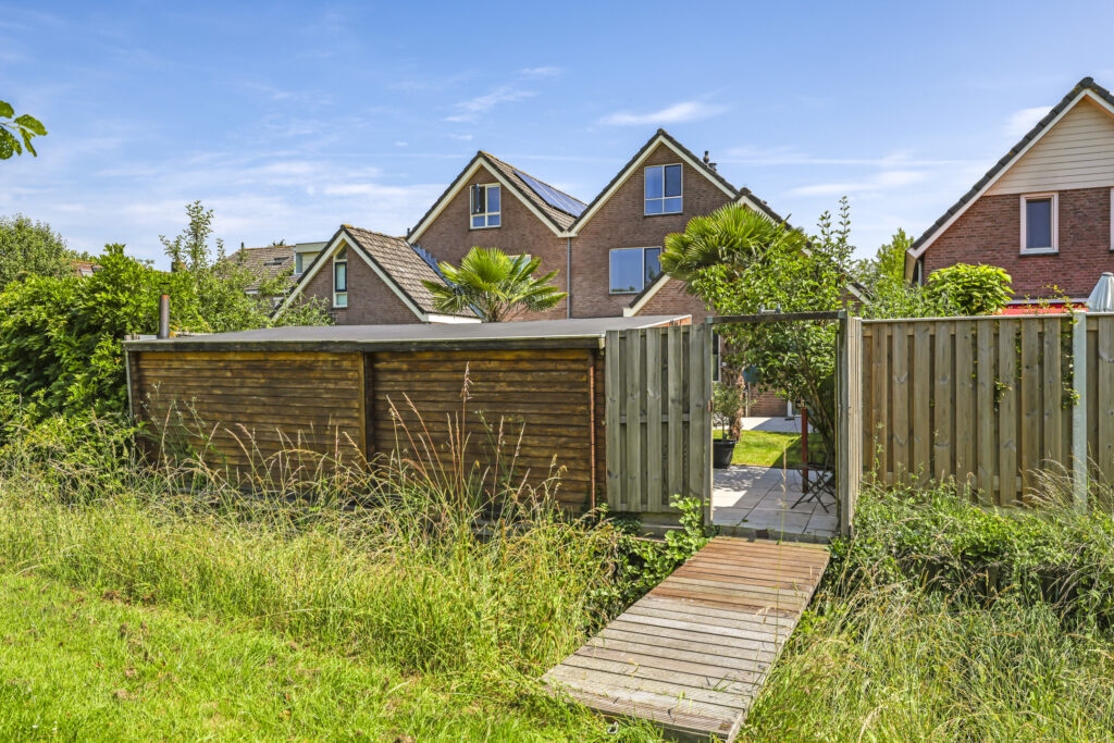 Eén van de grote pluspunten van deze gezinswoning is de achtertuin. Deze ligt niet alleen bijzonder vrij maar heeft ook een mooie diepte (ca. 16m) en is net even iets breder dan gemiddeld (ca. 10m). Bovendien ligt de tuin bijzonder gunstig, namelijk op het zuid/westen. Doordat de tuin aan de achterzijde aan een sloot en groenvoorziening grenst, heb je geen directe achterburen. Daardoor is er nagenoeg geen inkijk terwijl je wel wegkijkt op het groen van bomen. Leuk element is de ‘ophaalbrug’ over de afgelegen sloot. Hierdoor kun je de achtertuin ontsluiten naar bijvoorbeeld de speelweide op de Dijkgraaf.