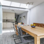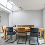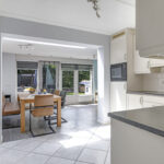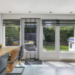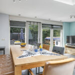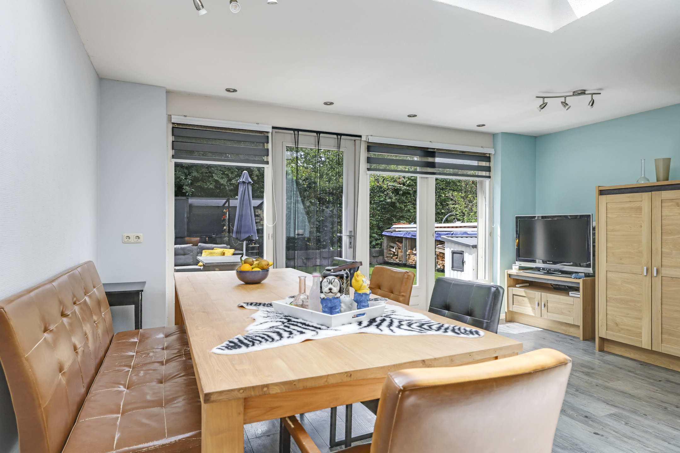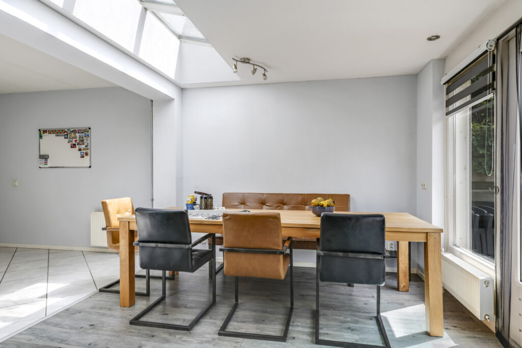 Aan de achterzijde is de woning uitgebouwd waardoor hier aanzienlijk meer leefruimte is ontstaan. De eethoek hoeft nu niet meer in de keuken te staan en je hebt hier dan ook meer dan voldoende ruimte voor een grote 6-persoons eettafel en een werkhoek. Opvallend is de lichtstraat waardoor je veel lichtinval krijgt.
