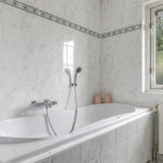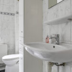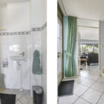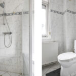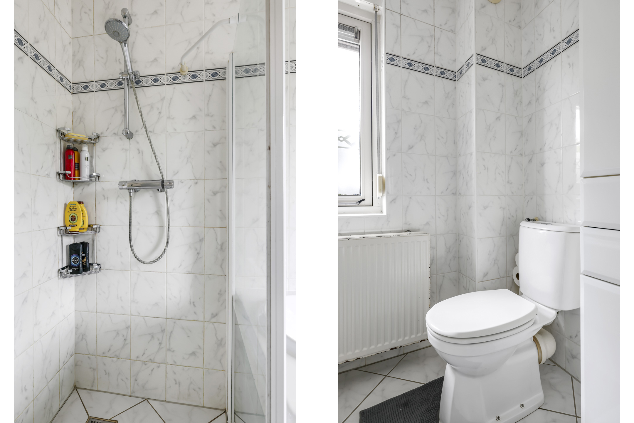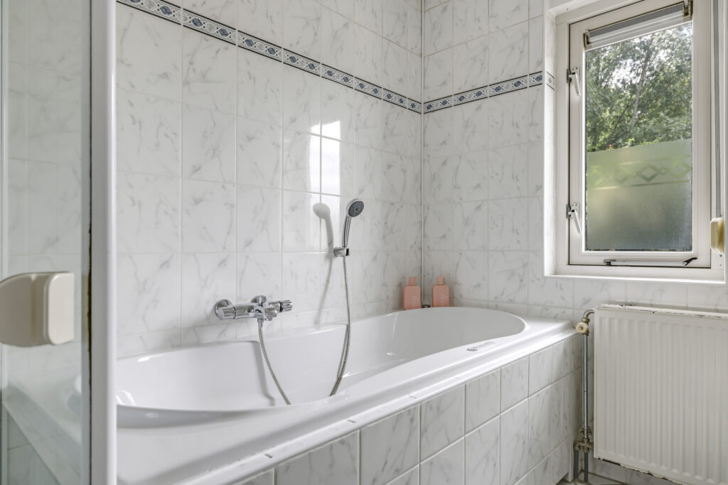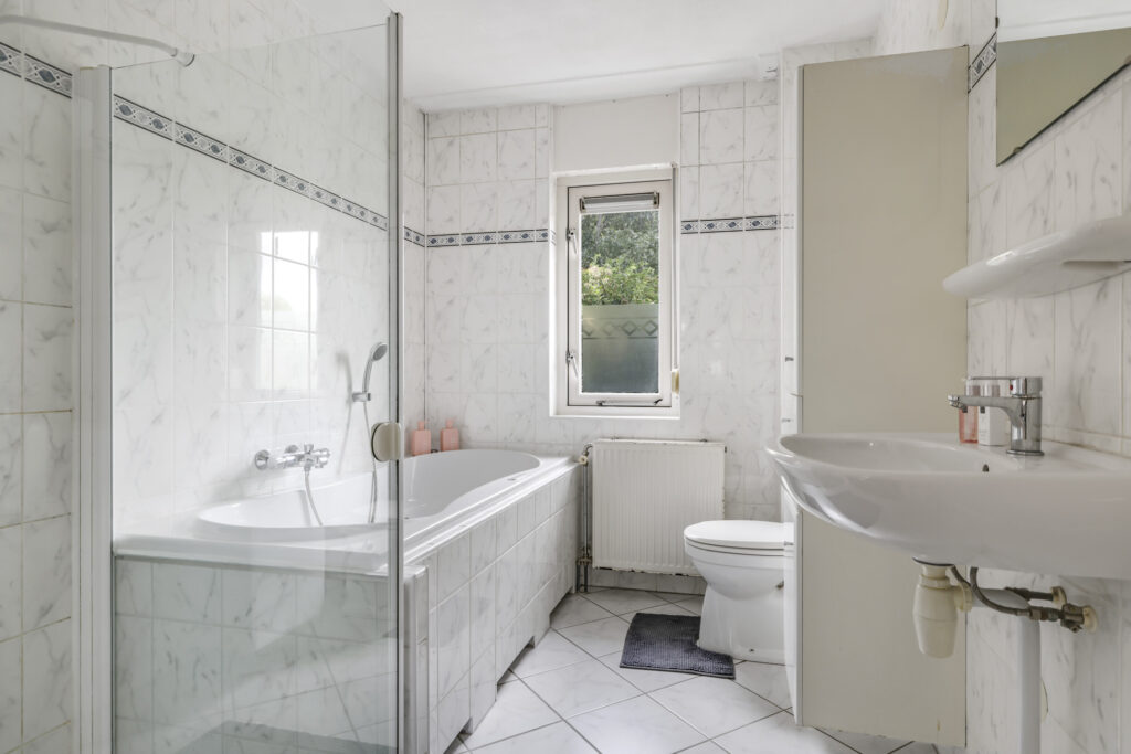 De badkamer is eveneens ruim opgezet en daar is dankbaar gebruik van gemaakt. Het sanitair bestaat uit een ligbad, een separate douchecel, een 2e toilet en een wastafel. Naast de wastafel tref je nog een hoge toiletkast aan. Het tegelwerk is in een neutrale, lichte kleurstelling uitgevoerd. Een raam zorgt voor de nodige lichtinval en ventilatiemogelijkheid. Ventileren kan overigens ook middels de mechanische ventilatie (MV).