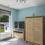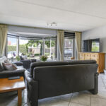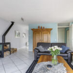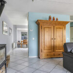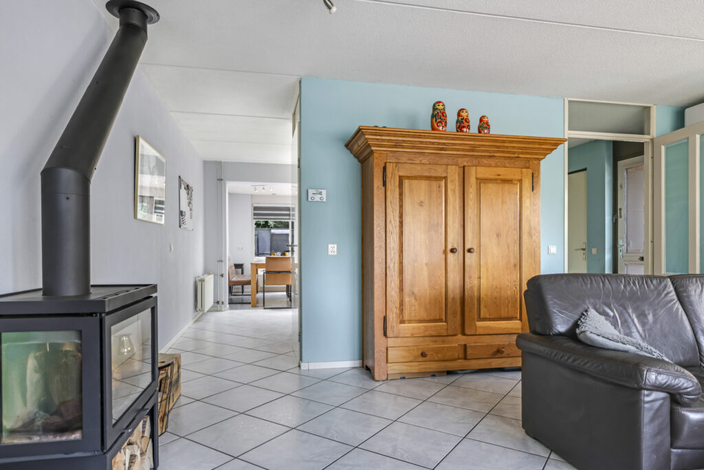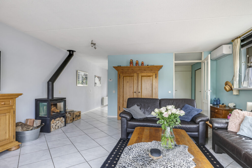 De woonkamer heeft een fijn leefklimaat. Dit komt mede door de prettige lichtinval van onder meer de erker aan de voorzijde en het extra zijgevelraam. De plavuizen vloer voelt aangenaam aan door de aanwezige vloerverwarming. Tegen de lange wand is een houtkachel geplaatst wat voor veel warmte en sfeer zorgt. Om koel te blijven in de zomer is er een airco aanwezig.