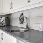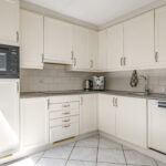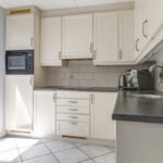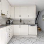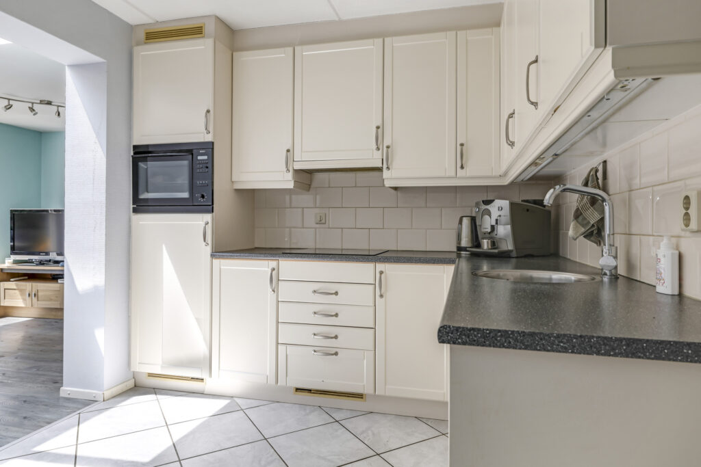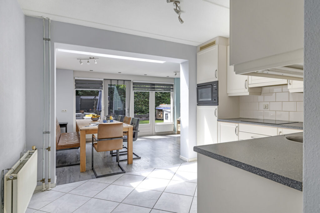 Vanuit de woonkamer loop je door naar de keuken aan de achterzijde. Hier vinden we een keukenblok in een hoekopstelling met neutrale kleurstelling. Alle wenselijke inbouwapparatuur is aanwezig, zijnde een 4-pits inductiekookplaat, een afzuiger, een koelkast, een combi-oven/magnetron en een vaatwasser. Door de uitbouw heb je tevens in de keuken meer ruimte gekregen. Direct naast de keuken is een trapkast aanwezig waar je de nodige voorraad kwijt kan.