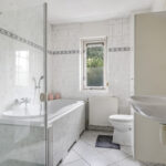 Badkamer met ligbad, douche, wastafel en 2e toilet.