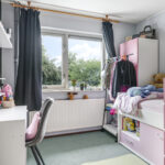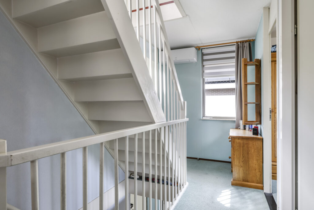 Via de hal en trapopgang bereiken we de 1e verdieping. Opvallend is het grote zijgevelraam die voor een aangename lichtinval zorgt. Een doorlopende laminaatvloer op de overloop schakelt 3 volwaardige slaapkamers met elkaar. Elke kamer is praktisch in te delen en met respectievelijk 12m2, 8m2 en 8m2 zit er geen kleine kamer tussen. De wanden zijn glad afgewerkt en daardoor eenvoudig in de gewenste kleur te sausen. De ramen zijn v.v. horren waardoor insecten geen kans krijgen. En niet te vergeten de airconditioning op de overloop waardoor je in de zomers de kamers ook lekker koel kunt houden.