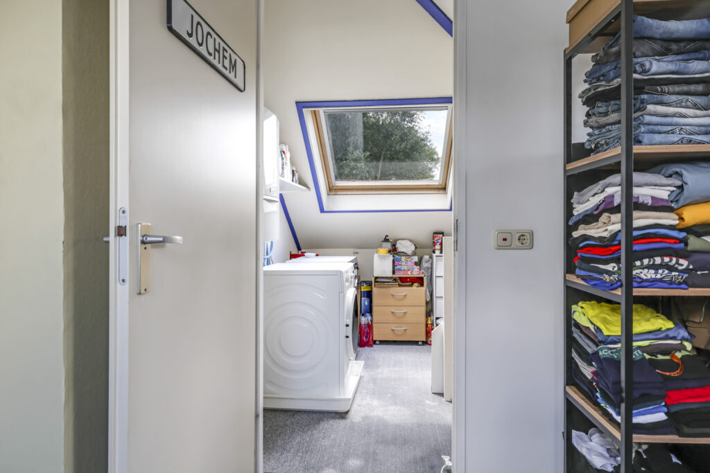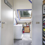 Ook de voorzolder heeft een groot dakvenster. Dit is vooral prettig om te kunnen ventileren aangezien je hier de opstelling voor de wasmachine en de wasdroger terugvindt. Naast de trapopgang tref je nog de nodige bergruimte.