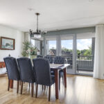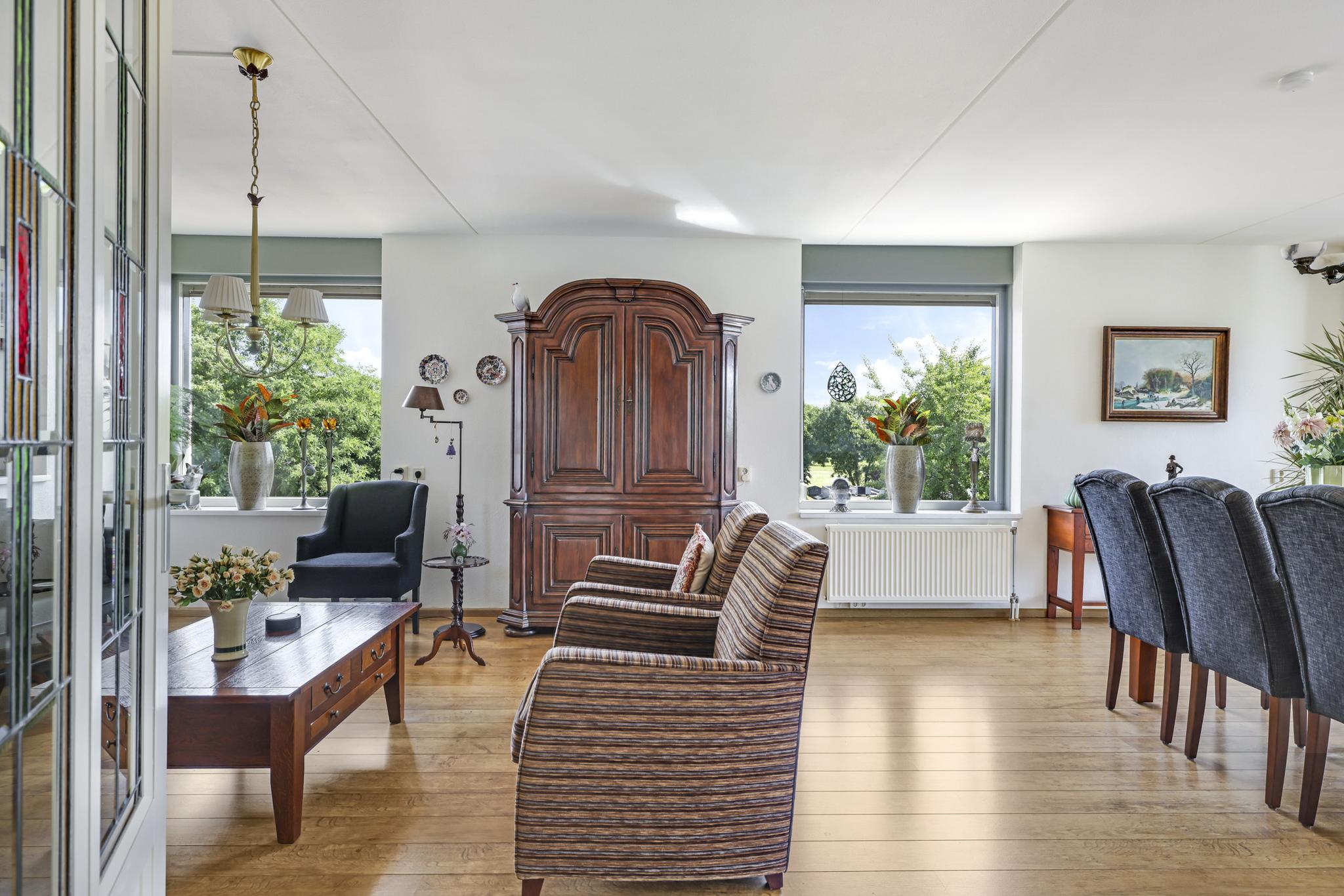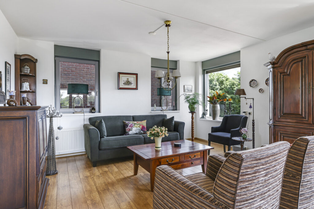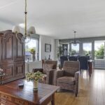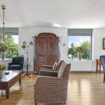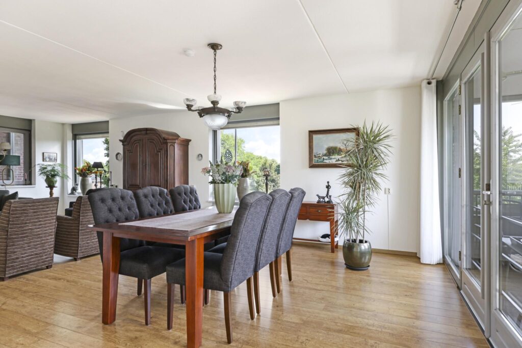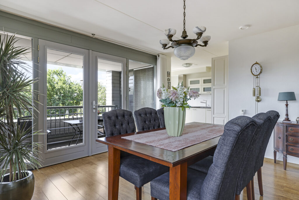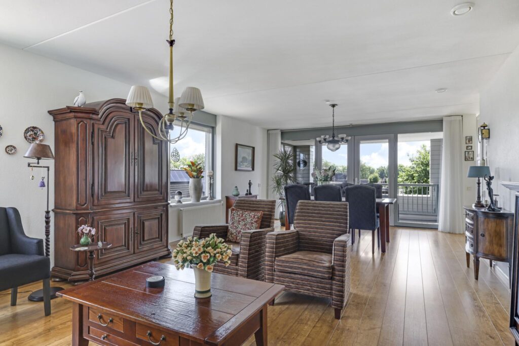 De woonkamer voelt prettig en sfeervol aan. Dit komt door de ruime opzet en de vele raampartijen die voor veel lichtinval en uitzicht zorgen. Bovendien zijn deze ramen gunstig op de zon georiënteerd. Om die reden zijn er ook screens (zonwering) aangebracht. Het vele glas biedt veel vrijheid vanwege het vrije uitzicht terwijl het geen enkele inkijk geeft. De vloer is afgewerkt met een V-groef laminaatvloer wat voor een verzorgde en warme uitstraling zorgt. Opvallend zijn de dubbele deuren naar het balkon waardoor je de woonkamer éénvoudig bij het buitenleven betrekt.