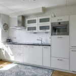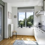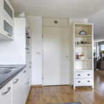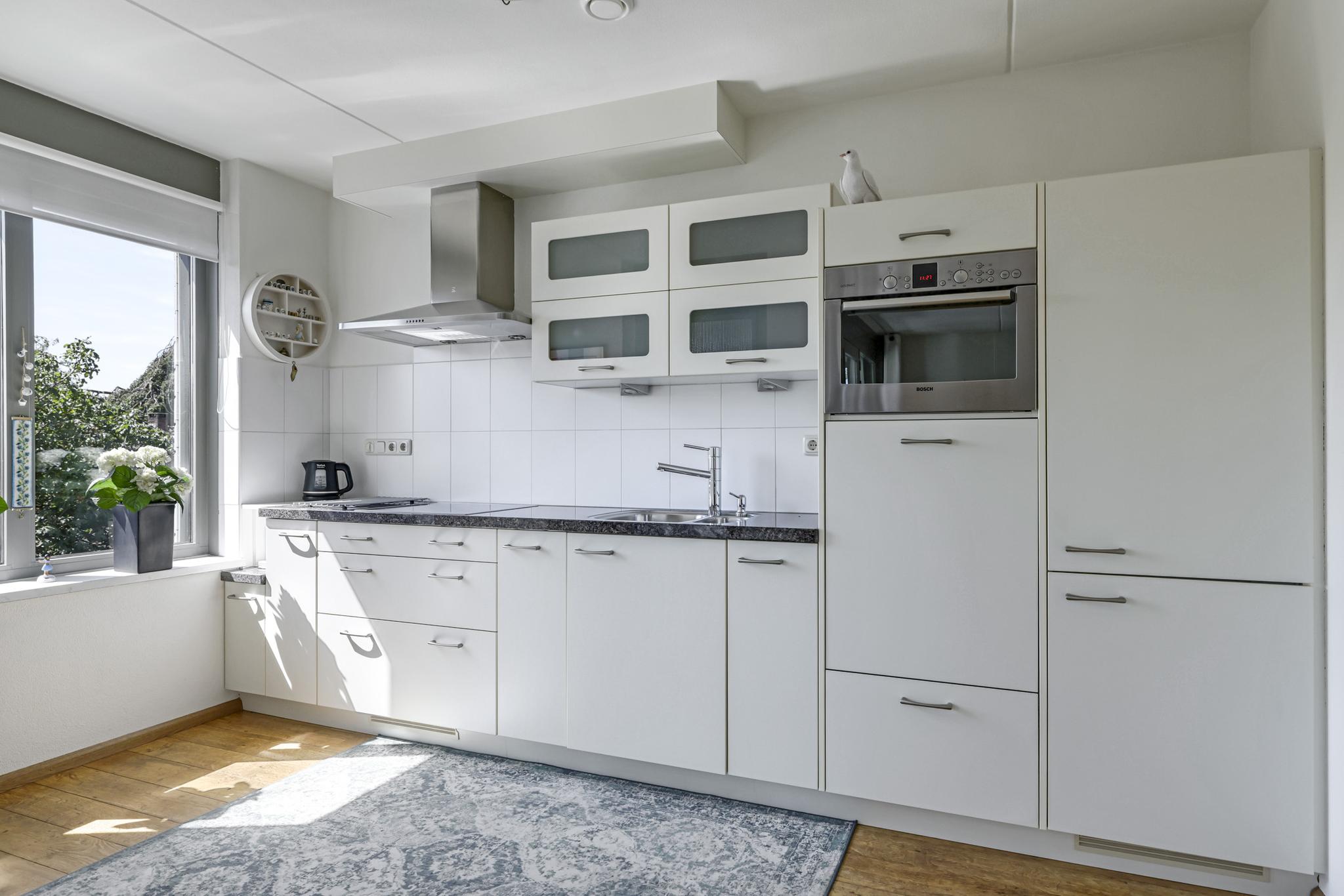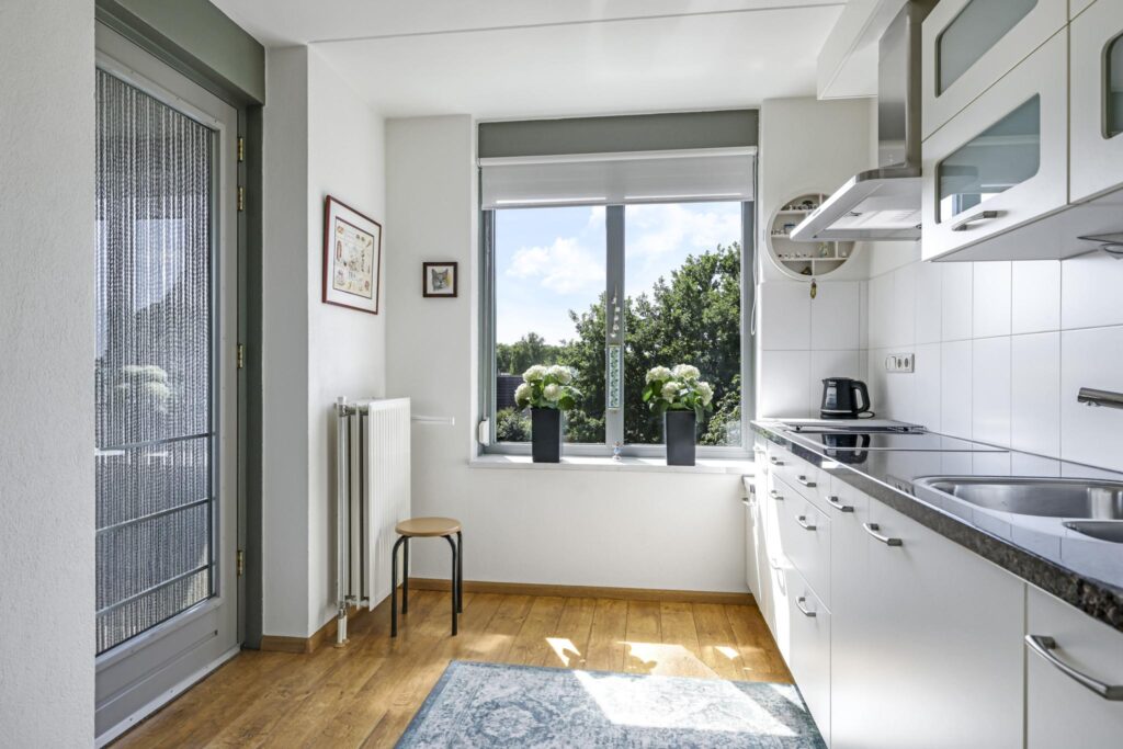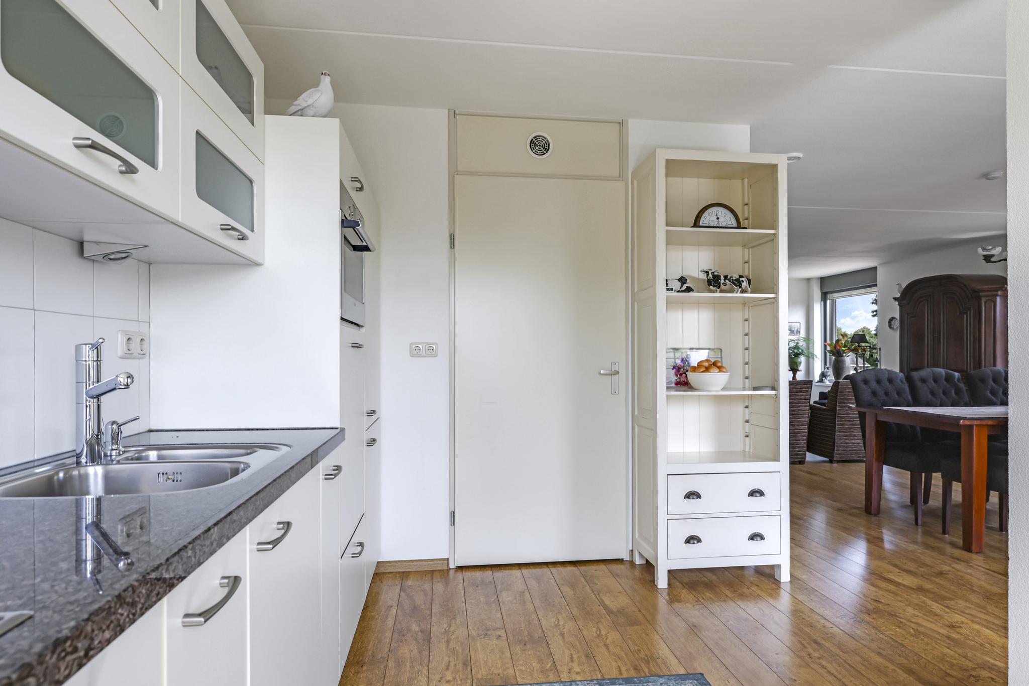 De keuken heeft een open karakter naar de woonkamer toe en is eveneens ruim van opzet. De keukenopstelling is neutraal en degelijk te noemen waarbij een granieten werkblad voor een luxe-uitstraling zorgt. De inbouwapparatuur bestaat uit een vaatwasser ‘op hoogte’, een koel/vriescombi, een 4-pits inductie kookplaat en een afzuigschouw. Handige bovenkastjes zorgen voor extra opbergruimte voor een uitgebreid servies.