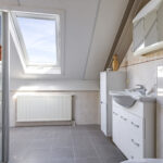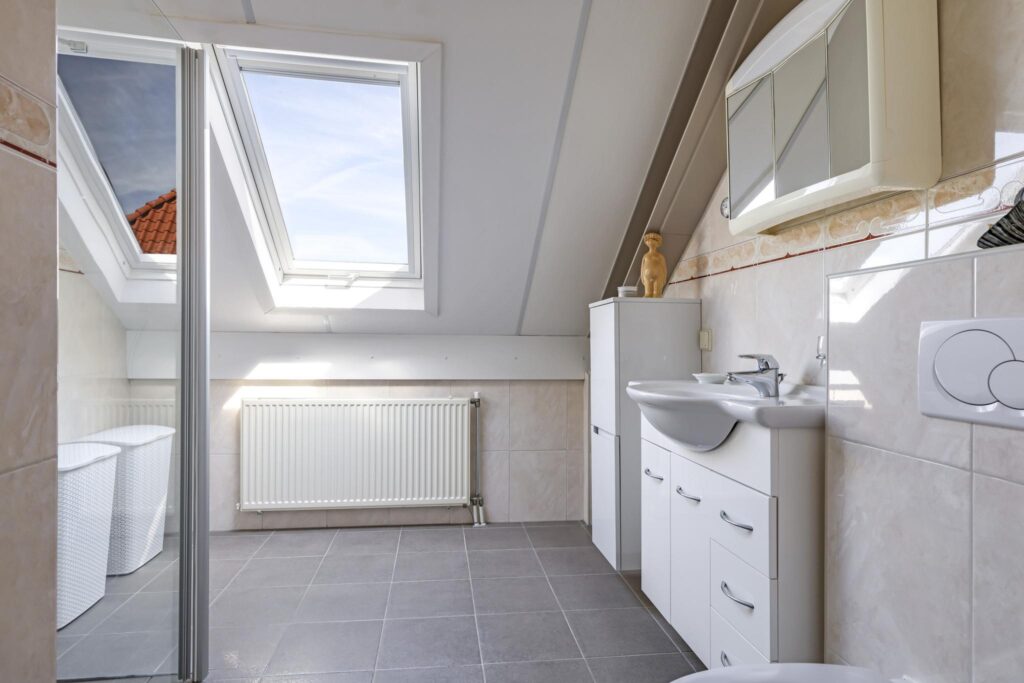 Het zal je niet verbazen dat ook de badkamer goed bemeten is. De badkamer is neutraal afgewerkt en ingedeeld met een comfortabele inloopdouche (met thermostaatkraan en drainafvoer), een wastafelmeubel en een 2e toilet. Indien gewenst is er ook ruime voor het plaatsen van een ligbad, zonder dat meteen de gehele badkamer heringedeeld hoeft te worden. Ook hier zorgt een dakvenster voor het nodige daglicht. Overigens is er ook mechanische ventilatie geïnstalleerd (WTW-ventilatie).