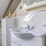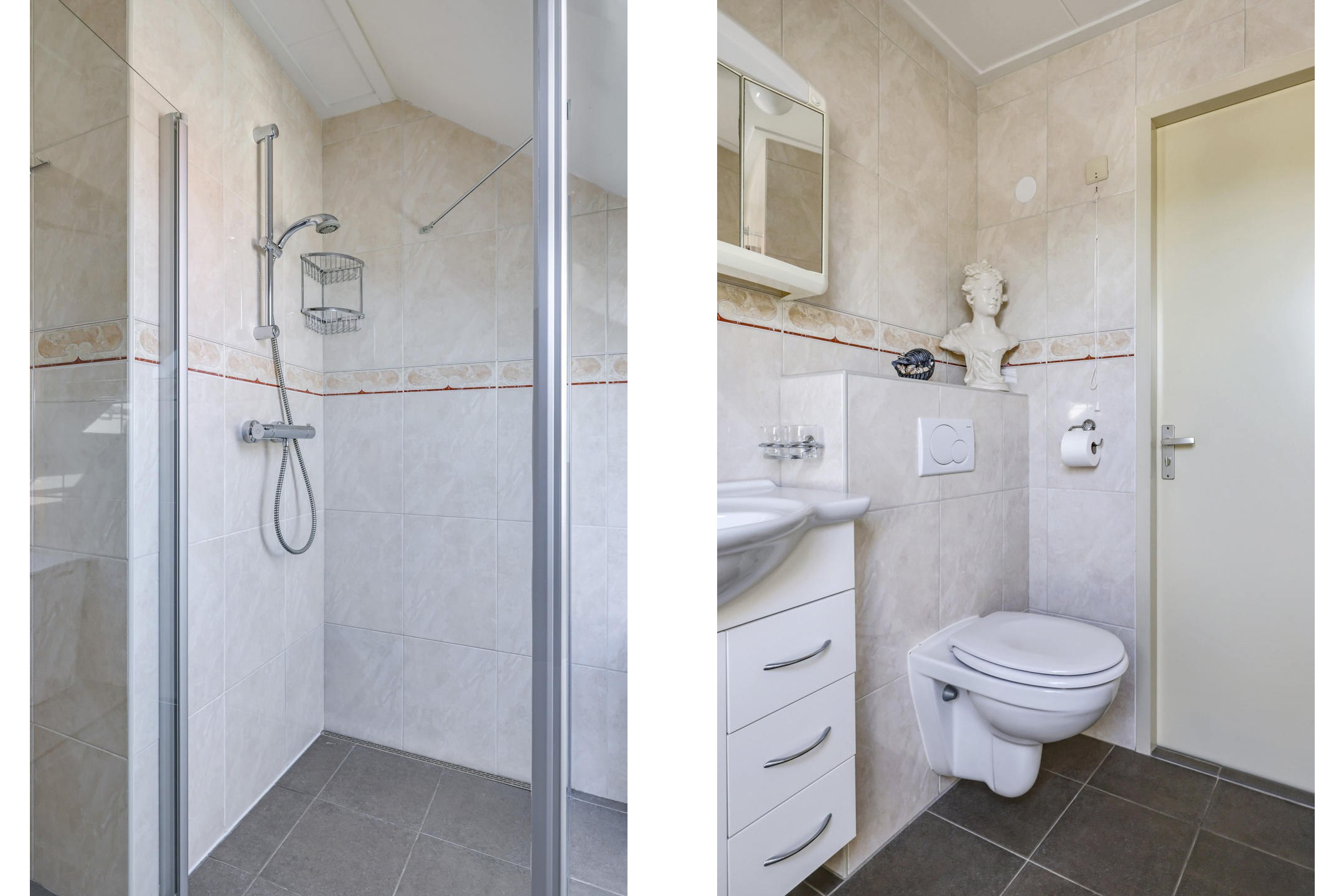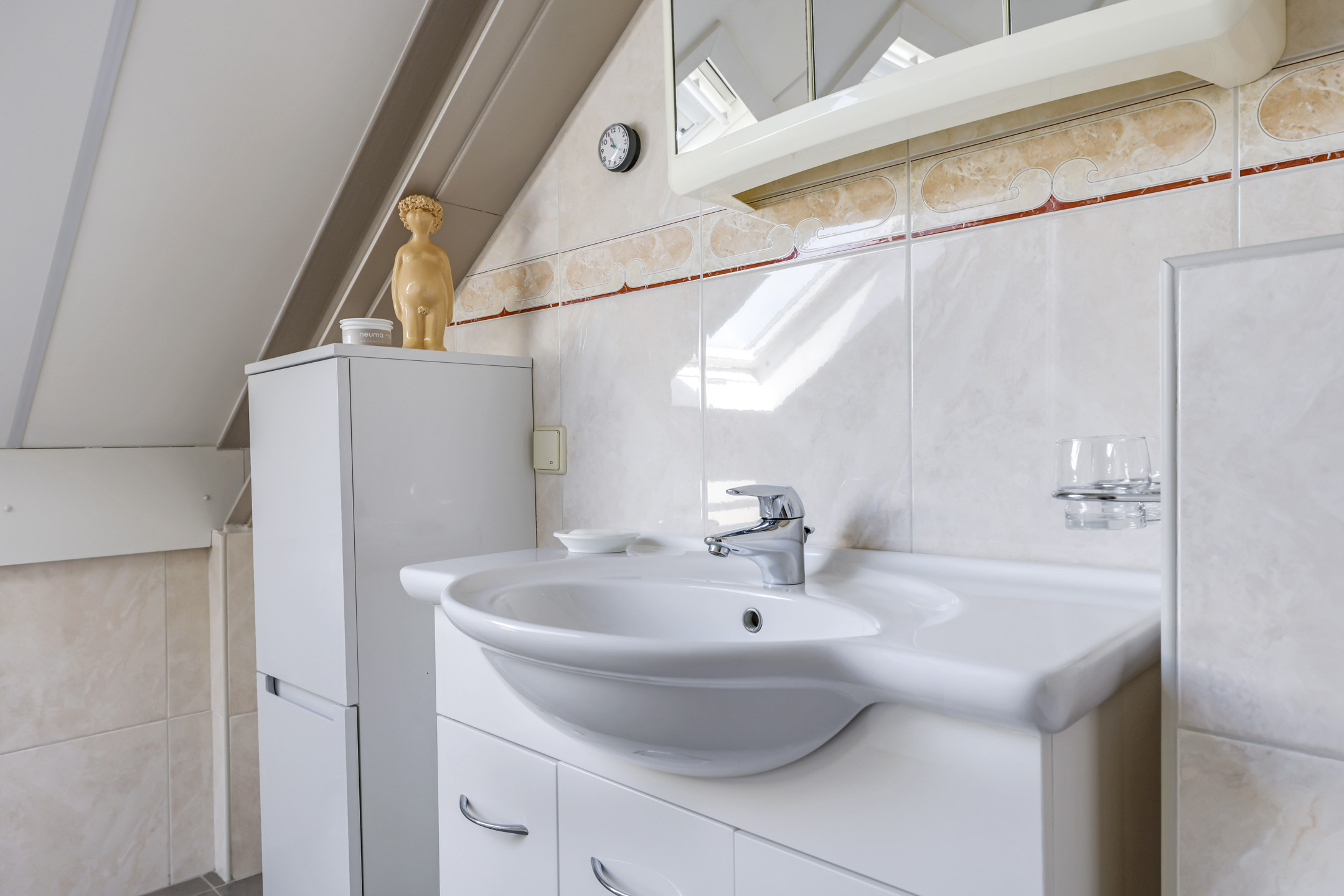 Badkamer met inloopdouche, 2e toilet, wastafelmeubel en dakvenster.