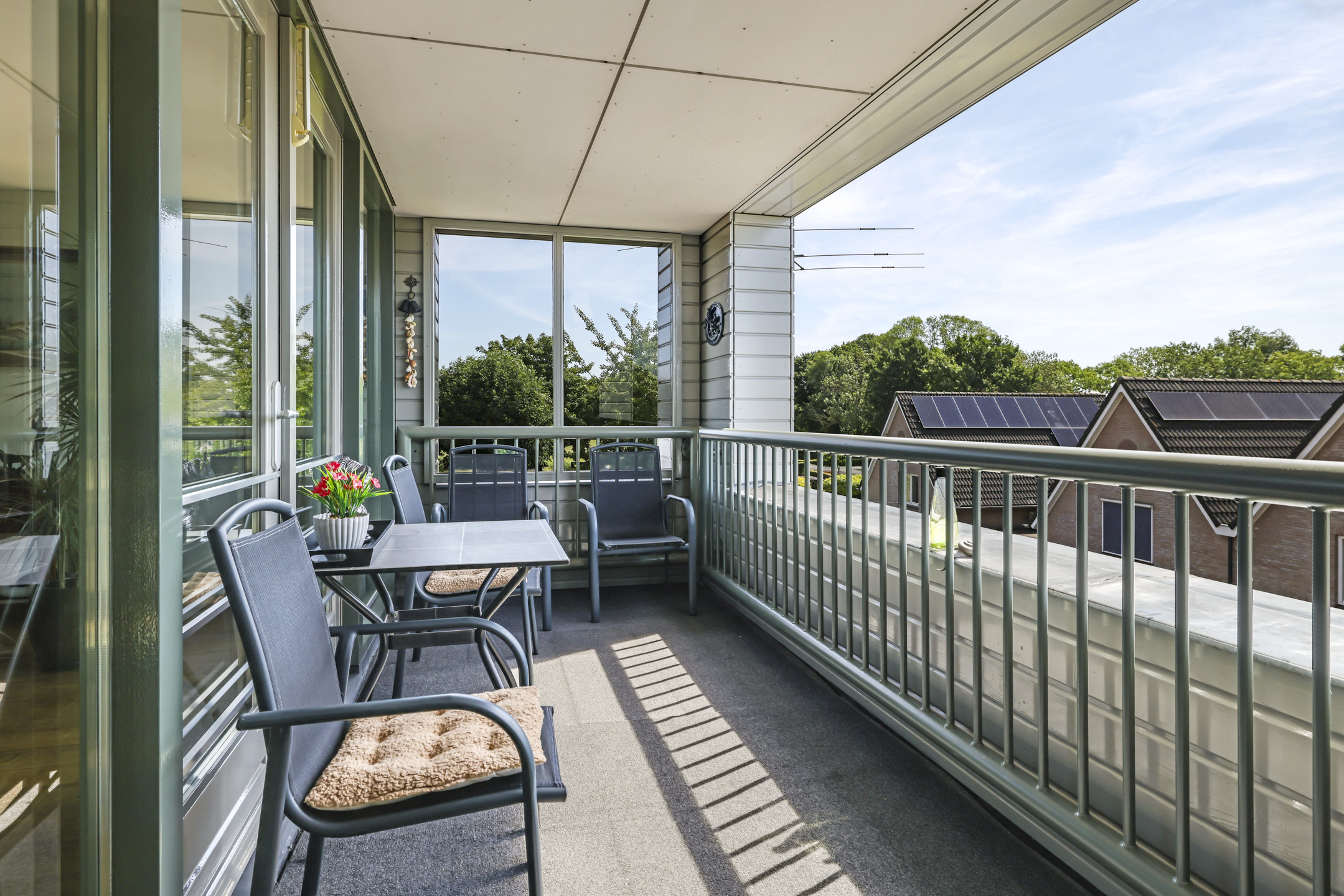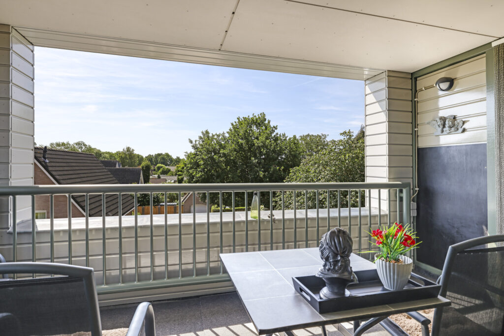 Vanuit de woonkamer én keuken is het inpandige balkon te bereiken. Doordat er glas aan de korte zijde is geplaatst, kun je hier ook heerlijk uit de wind zitten, terwijl je lekker van het zonnetje geniet. En doordat het balkon inpandig is gelegen, zit je hier altijd droog. Het formaat is goed te noemen (1,9m x 4,5m) waardoor je prima om een tafel heen kunt zitten. Opvallend is het panoramische uitzicht waardoor je vrij en groen weg kijkt.