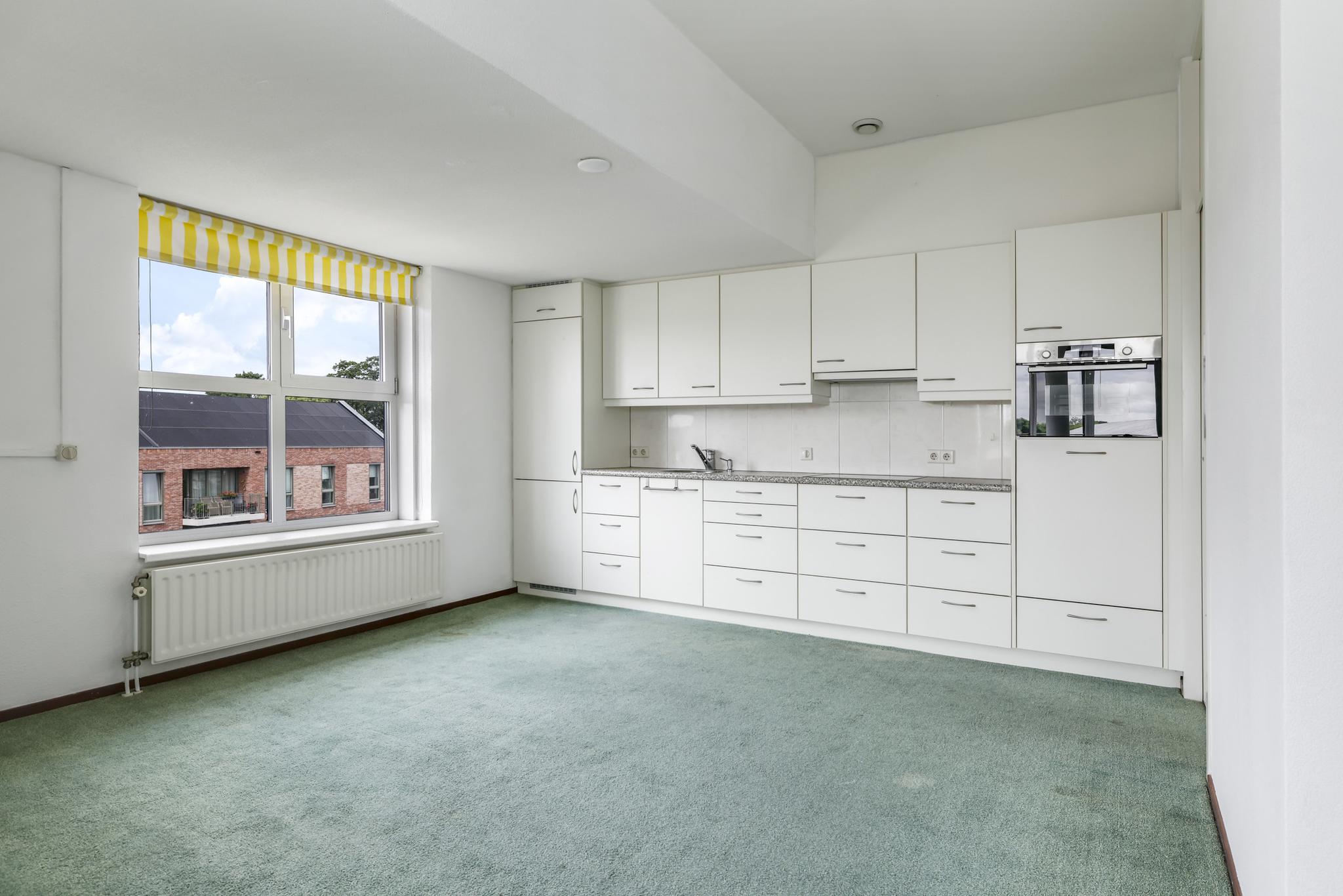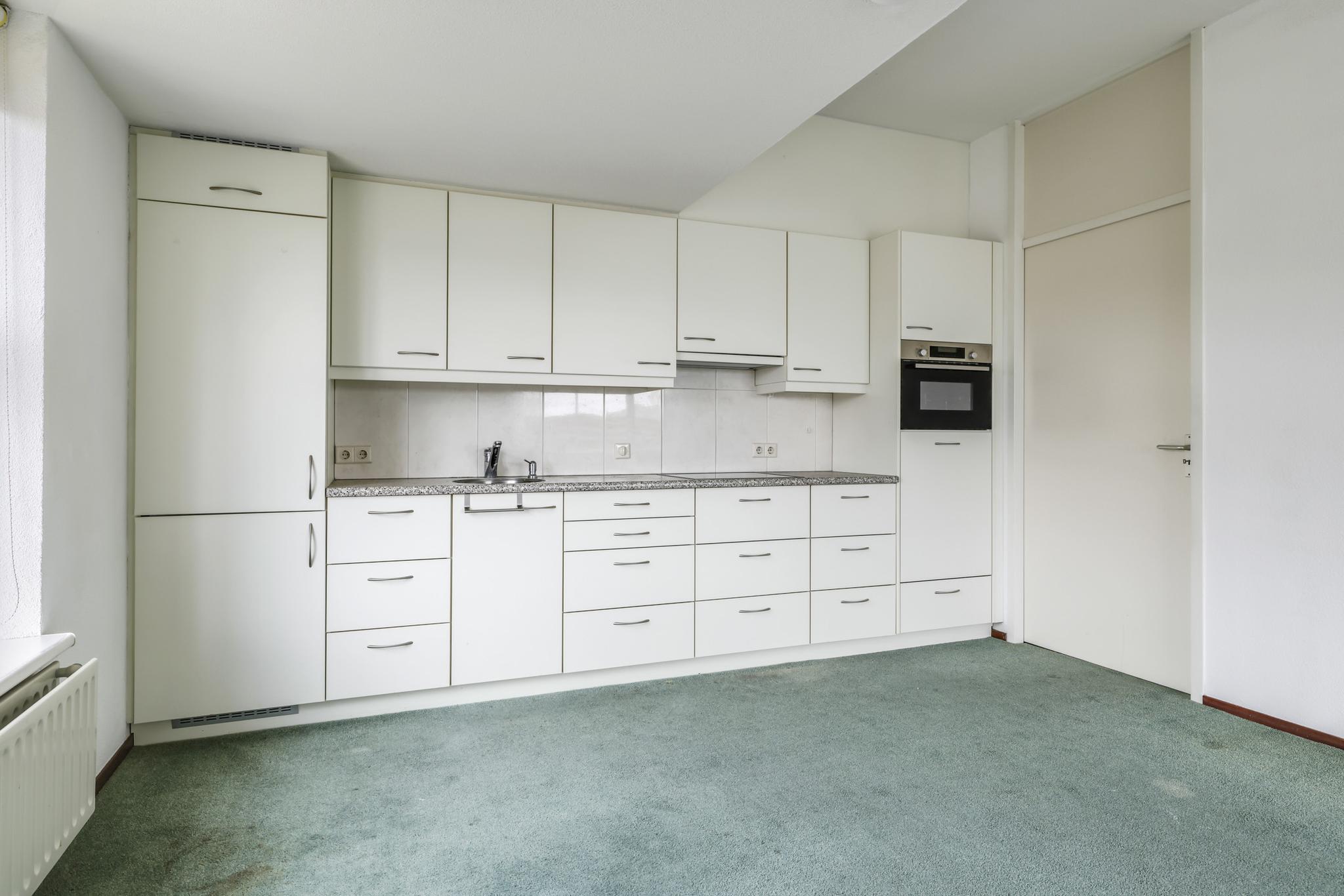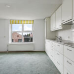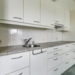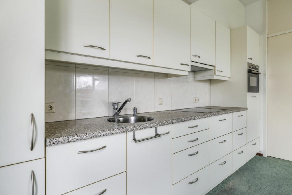 De witte keuken sluit perfect aan op de woonkamer en is neutraal en functioneel. Alle gebruikelijke inbouwapparatuur is aanwezig zoals een vaatwasser op hoogte, een combi-oven, een keramische kookplaat, een afzuiger en een koel/vriescombi. Door de open verbinding met de woonkamer blijft het sociale aspect van het wonen behouden. Tevens is de keuken groot genoeg voor het plaatsen van een (ontbijt)tafel. Mogelijk houdt u hierdoor meer ruimte over in de woonkamer voor andere meubelstukken.