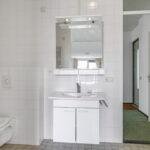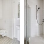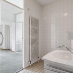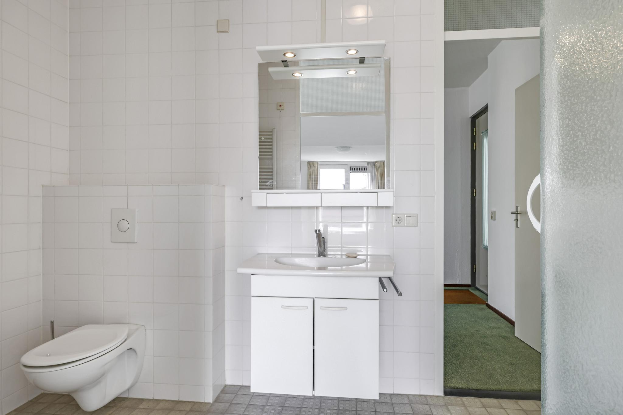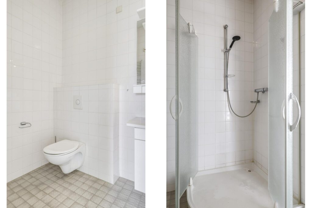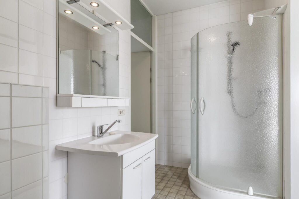 De badkamer is fris en degelijk afgewerkt met witte wandtegels en beschikt over een moderne douchecabine met glazen wand. Het zwevende toilet en het witte wastafelmeubel geven de badkamer een tijdloze uitstraling. Boven het wastafelmeubel is een grote spiegel met erboven spotverlichting geplaatst. Een handige handdoekradiator zorgt voor extra comfort.