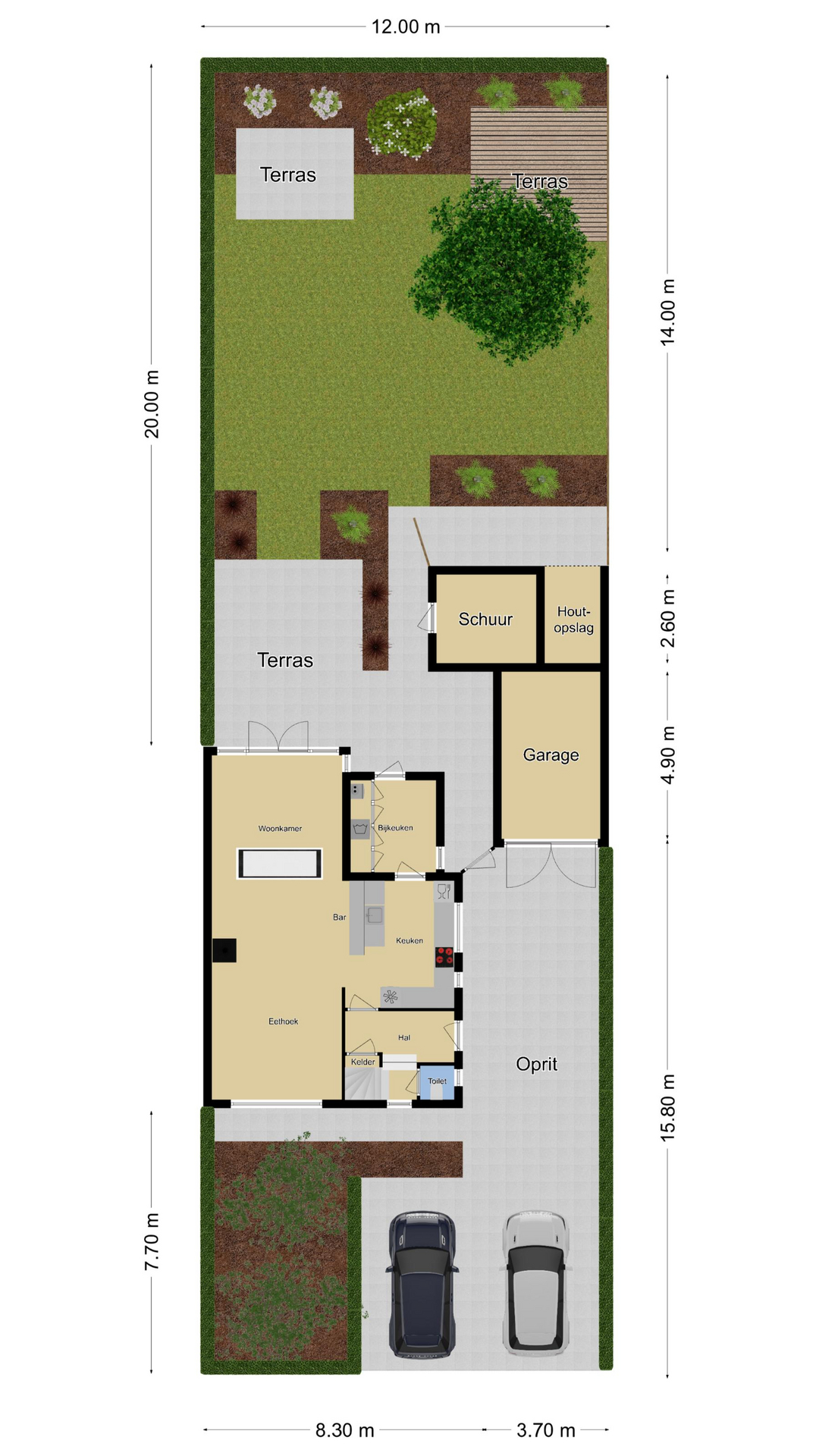 Er is een achterom aanwezig waarbij een zeer degelijke poort de achtertuin afsluit met de oprit. Naast de woning ligt een comfortabele oprit van bijna 4 meter breed waardoor je gemakkelijk kunt in- en uitstappen. Er is plek voor 3 tot 4 auto’s, maar de oprit is ook groot genoeg voor een caravan of camper. Overigens hoef je elkaar niet in de weg te staan aangezien de oprit aan de voorzijde is verbreed en je naast elkaar kunt parkeren. Noemsenswaardig zijn de gebakken klinkers in visgraatmotief gelegd waarbij de oprit wordt ‘afgekaderd’ door kaseien en spotverlichting. Wanneer je in het donker thuis komt, kun je hier alleen maar van genieten…
