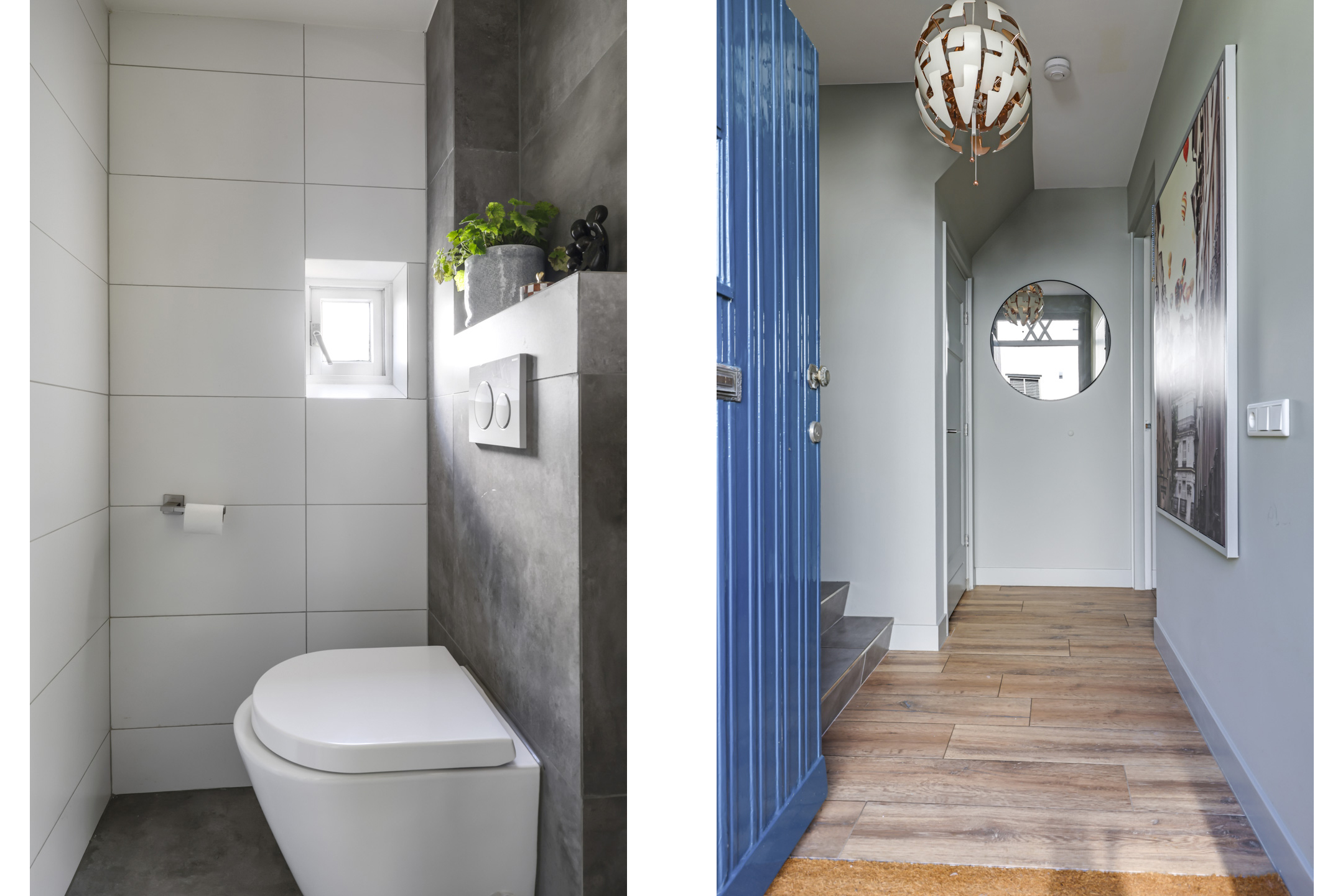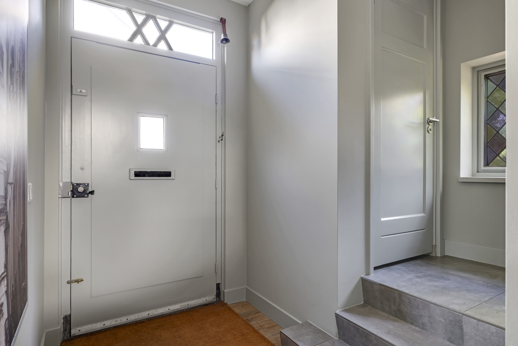 De hoofdentree zit natuurlijk gewoon bij de voordeur aan de zijkant van het huis. Leuk detail is de originele voordeur met ouderwetse trekbel. En ook de glas-in-lood ramen zullen gelijk in het oog springen. En niet te vergeten de stijlvolle paneeldeuren die je door de hele woning nog terug vindt. De authentieke trapopgang (bordestrap) is nog mooi intact gebleven, net zoals de verdiepte kelderkast. Zelfs het toilet heeft een speels karakter en is gemoderniseerd met een zwevend wandcloset.