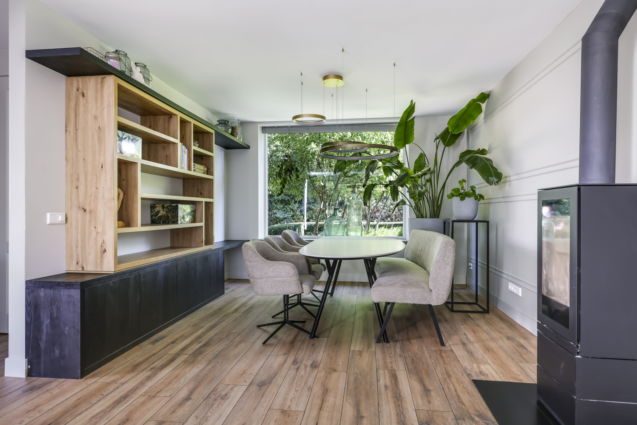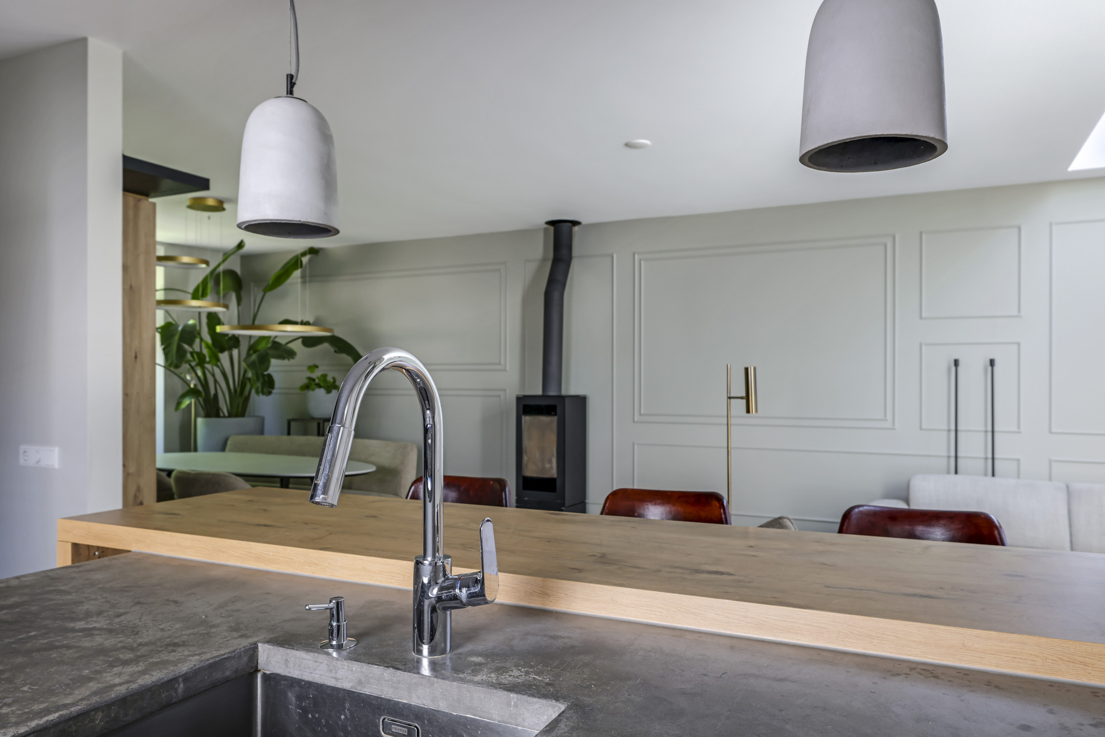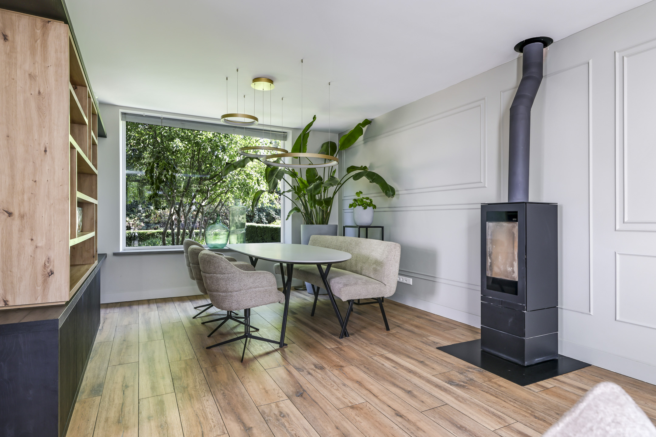Loop je hier de woonkamer in, dan kan het niet anders dan dat je verrast zult zijn over ruimte en de woonsfeer. De woonkamer is al breder dan gemiddeld en dan is er ook nog eens een aanbouw aangezet. Hierdoor kun je verschillende zithoeken creëren en hoef je niet te twijfelen of dat die grote hoekbank of lange eettafel wel past. De styling is perfect op elkaar afgestemd waaronder veel strak stucwerk met sierlijsten op de lange wand. De plavuizen vloer met houtlook is voorzien van vloerverwarming (radiatoren zijn verwijderd) en centraal in de ruimte is een gezellige houtkachel geplaatst. Wandcontactdozen zijn verlaagd en uitgebreid en om een TV ‘draadloos’ aan de wand te bevestigen zijn de aansluitingen in de muur weggewerkt. Noemenswaardig is het detail van het hoekraam van de aanbouw waarbij de hoekstijl ontbreekt. En ook is de lichtstraat in het plafond een echte eye-catcher die bovendien voor een prettige lichtinval zorgt. Dubbele deuren geven je de mogelijkheid om het buitenterras eenvoudig bij de woonkamer te betrekken.