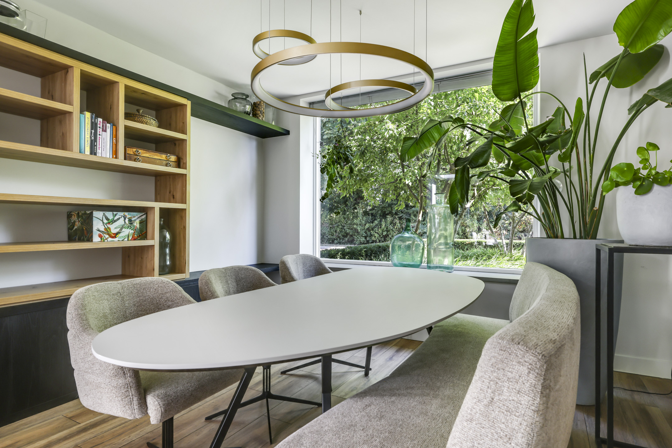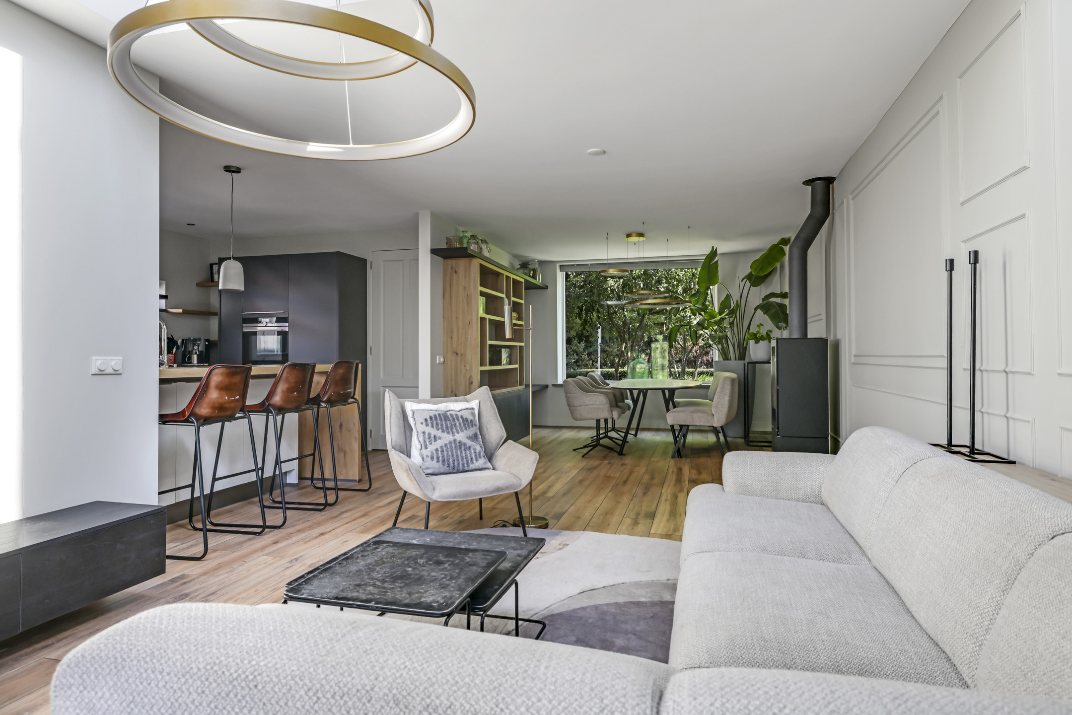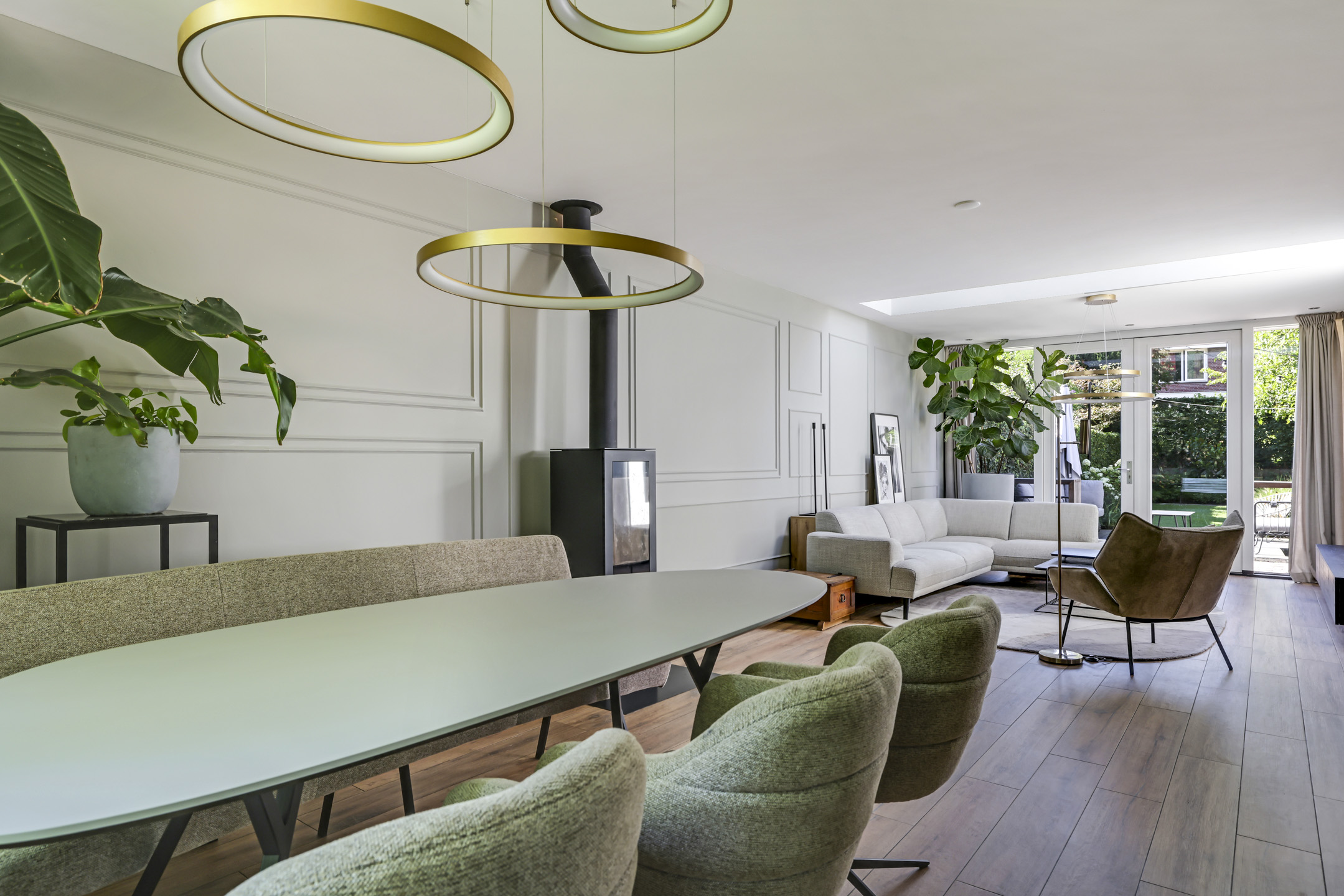Loop je hier de woonkamer in, dan kan het niet anders dan dat je verrast zult zijn over ruimte en de woonsfeer. De woonkamer is al breder dan gemiddeld en dan is er ook nog eens een aanbouw aangezet. Hierdoor kun je verschillende zithoeken creëren en hoef je niet te twijfelen of dat die grote hoekbank of lange eettafel wel past. De styling is perfect op elkaar afgestemd waaronder veel strak stucwerk met sierlijsten op de lange wand. De plavuizen vloer met houtlook is voorzien van vloerverwarming (radiatoren zijn verwijderd) en centraal in de ruimte is een gezellige houtkachel geplaatst. Wandcontactdozen zijn verlaagd en uitgebreid en om een TV ‘draadloos’ aan de wand te bevestigen zijn de aansluitingen in de muur weggewerkt. Noemenswaardig is het detail van het hoekraam van de aanbouw waarbij de hoekstijl ontbreekt. En ook is de lichtstraat in het plafond een echte eye-catcher die bovendien voor een prettige lichtinval zorgt. Dubbele deuren geven je de mogelijkheid om het buitenterras eenvoudig bij de woonkamer te betrekken.