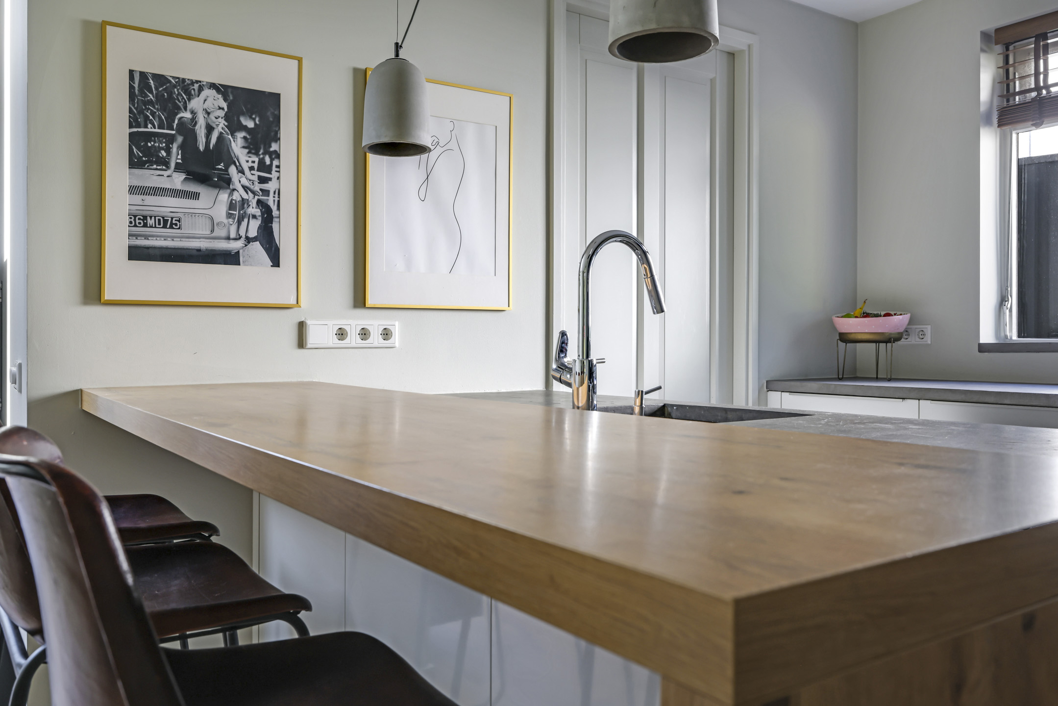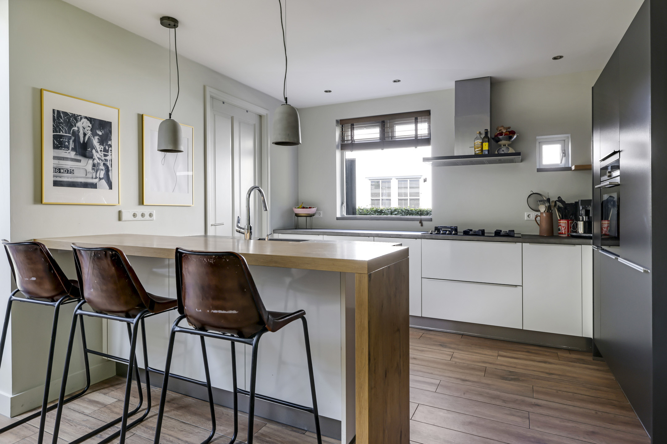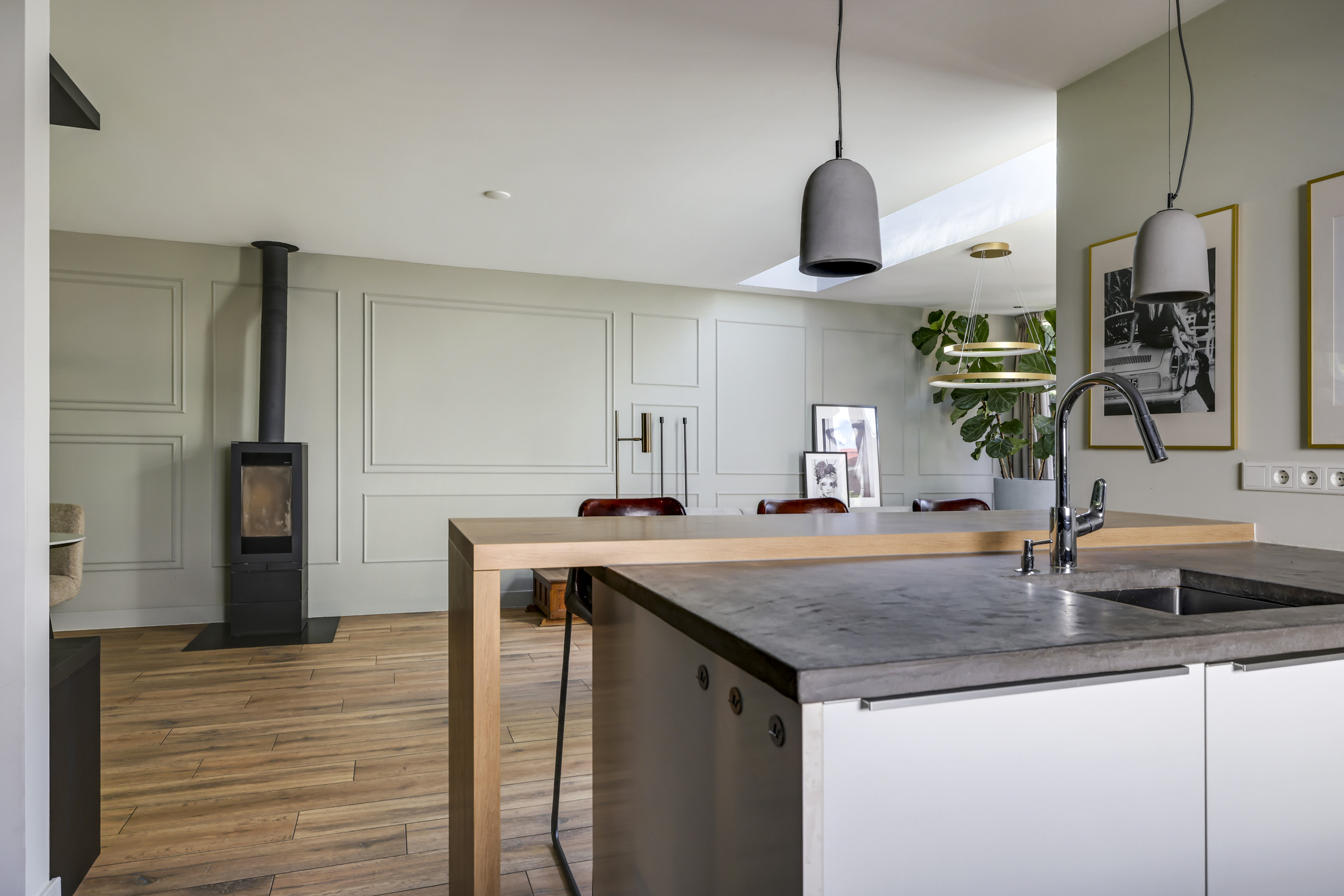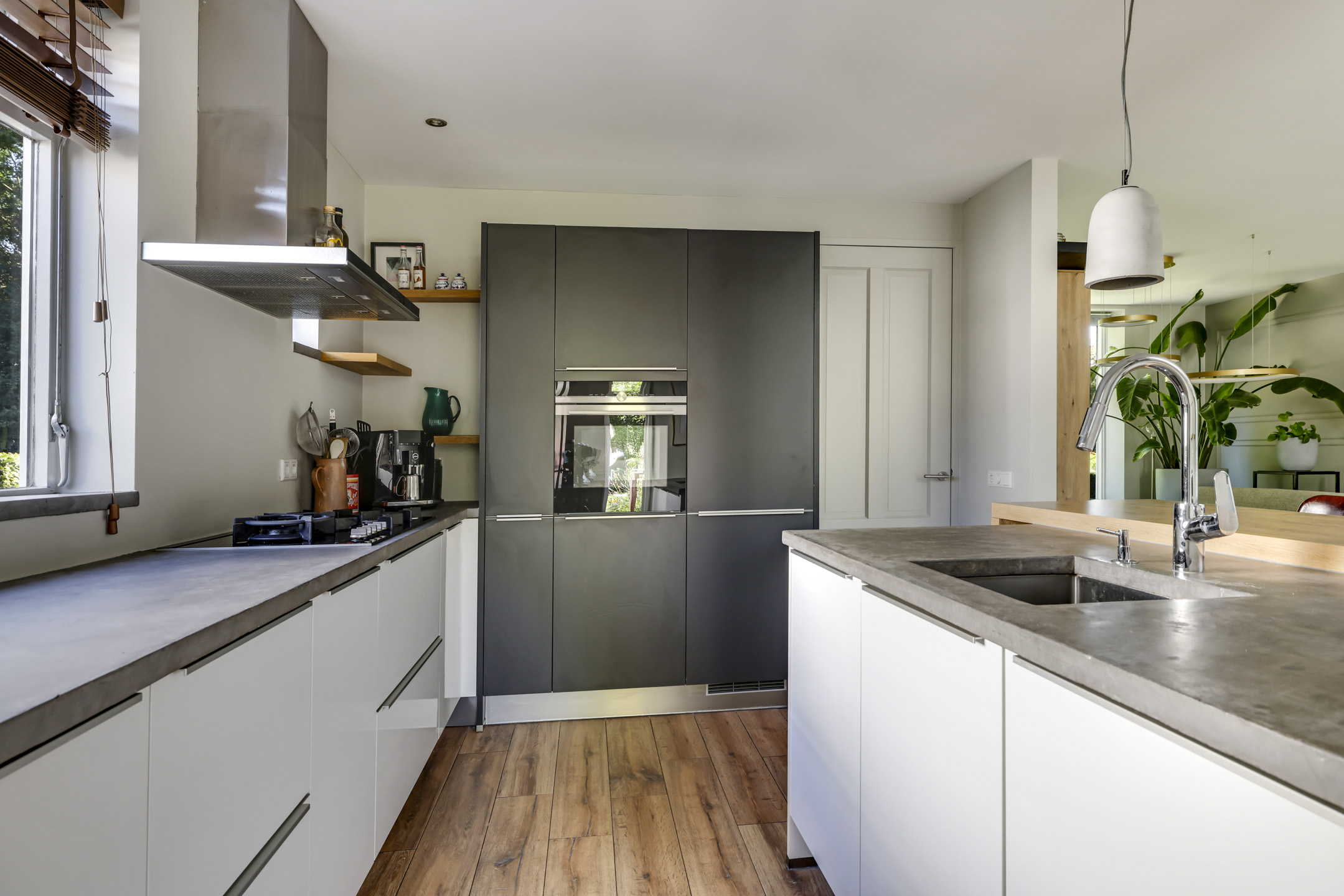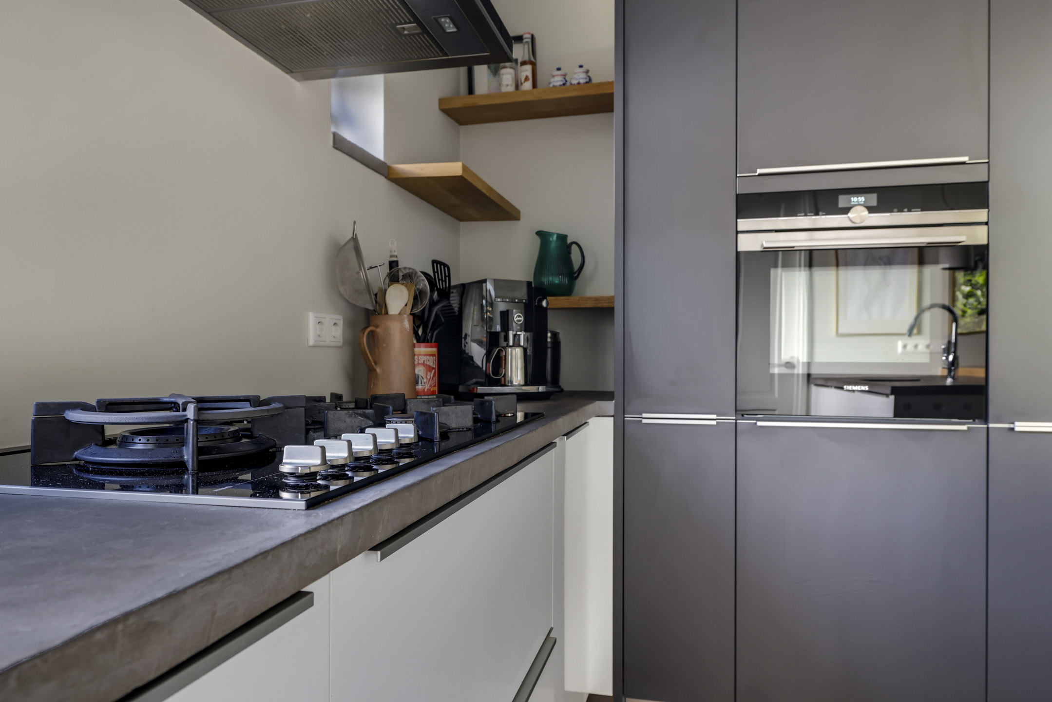 De keuken heeft een open karakter met de woonkamer en zorgt voor een speelse indeling. Er is gekozen voor een eilandopstelling (schiereiland) met bar waar je met krukken aan kunt zitten. Net als de vensterbanken is ook het aanrechtblad éénduidig uitgevoerd in betonciré. In combinatie met de hoogglans witte fronten zorgt dit voor een modern en trendy uitstraling. De inbouwapparatuur bestaat uit een vaatwasser, een brede 5-pits gas-op-glas kookplaat met afzuigschouw erboven, een koelkast en een grote combi-oven/magnetron. Een luxe Le-man slede zorgt ervoor dat je de hoekkast optimaal kunt benutten. En waar goed over nagedacht is, zijn de inbouwspots en de lichtpunten. Hierdoor kun je naar wens sfeervolle hanglampen boven het eiland ophangen.