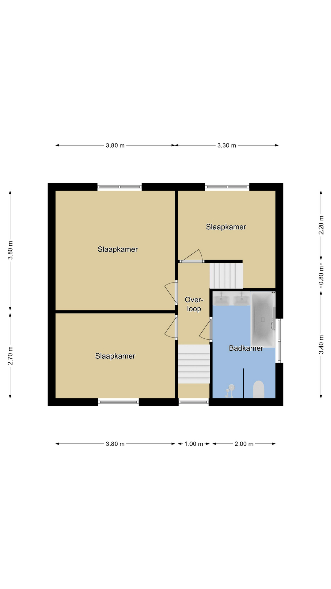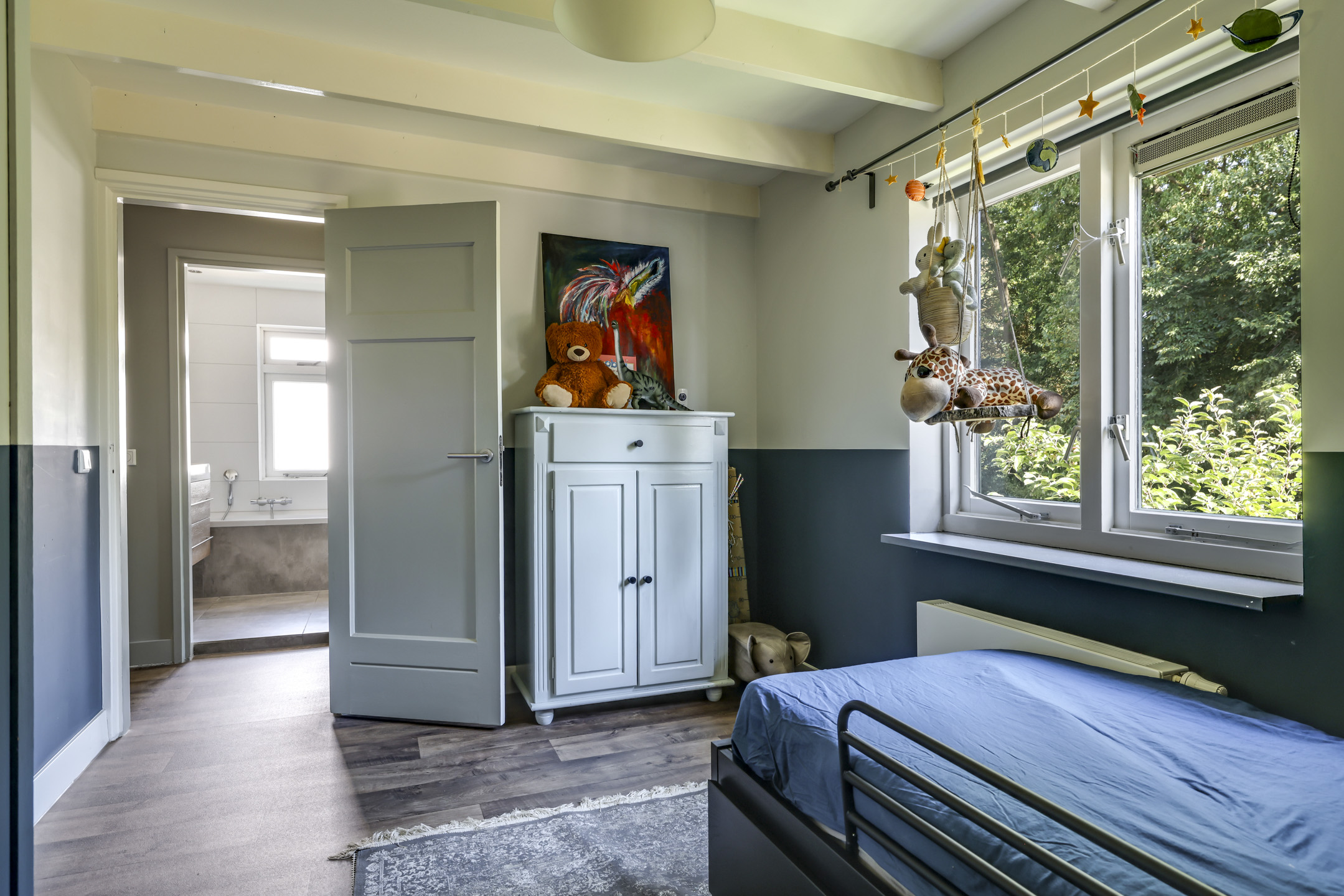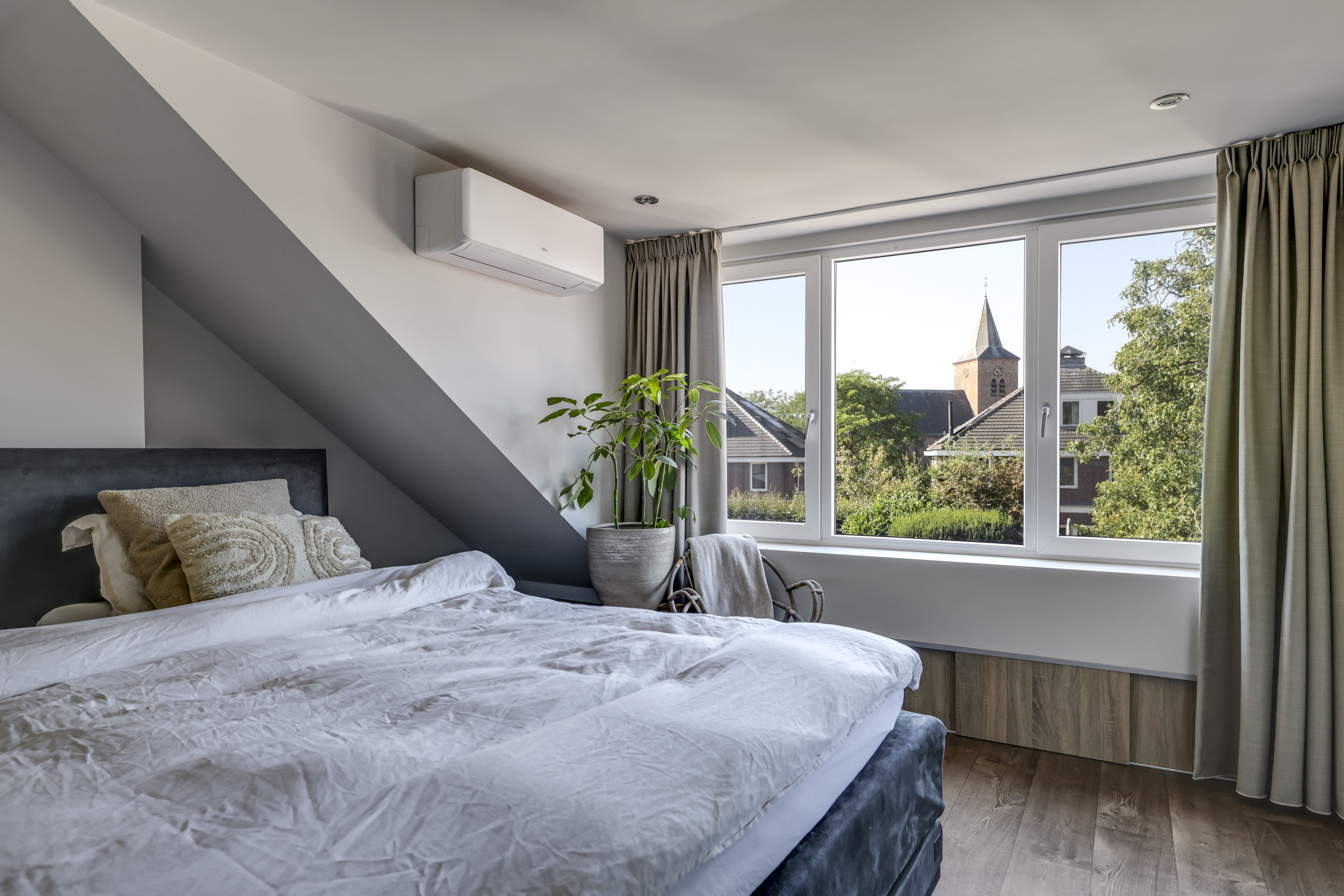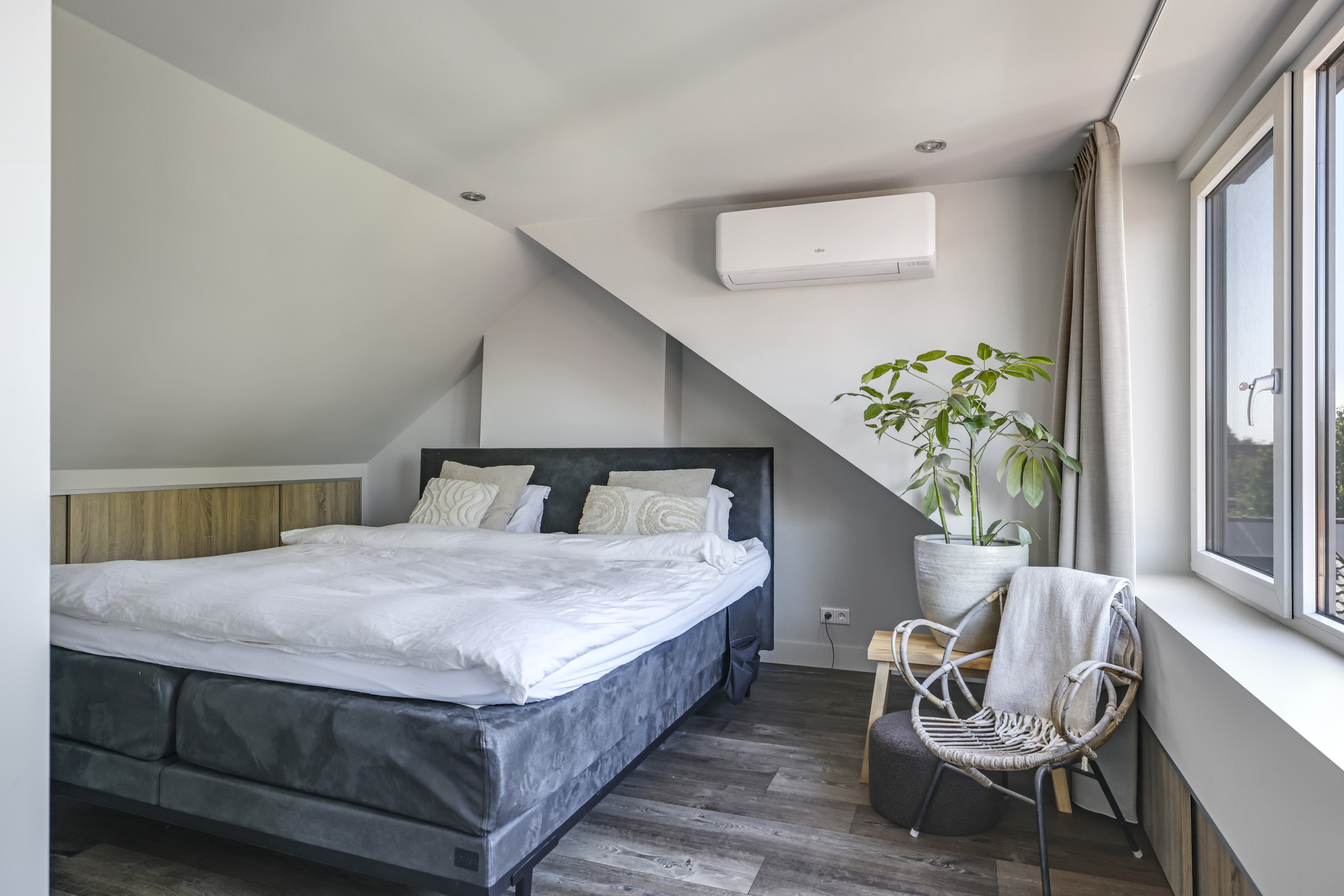 Deze verdieping telt dus 3 volwaardige slaapkamers waarvan 2 grote en een middelgrote kamer. De kamers zijn respectievelijk 14m2, 10m2 en 8m2 groot en dan zie je ook weer die uitzonderlijke breedtemaat van de woning terug. Er zijn geen schuine dakvlakken waardoor de kamers optimaal te benutten zijn. De wanden zijn strakgestuct, er zijn extra wandcontactdozen aangebracht (en verlaagd) en het plafond bestaat uit een fraai balkenplafond. Ook is er aandacht besteed aan het kozijnwerk met nieuw isolatieglas. En mocht het op een zomerdag (te) warm worden, dan gebruik je de airconditioning op de overloop om het aangenaam te maken.