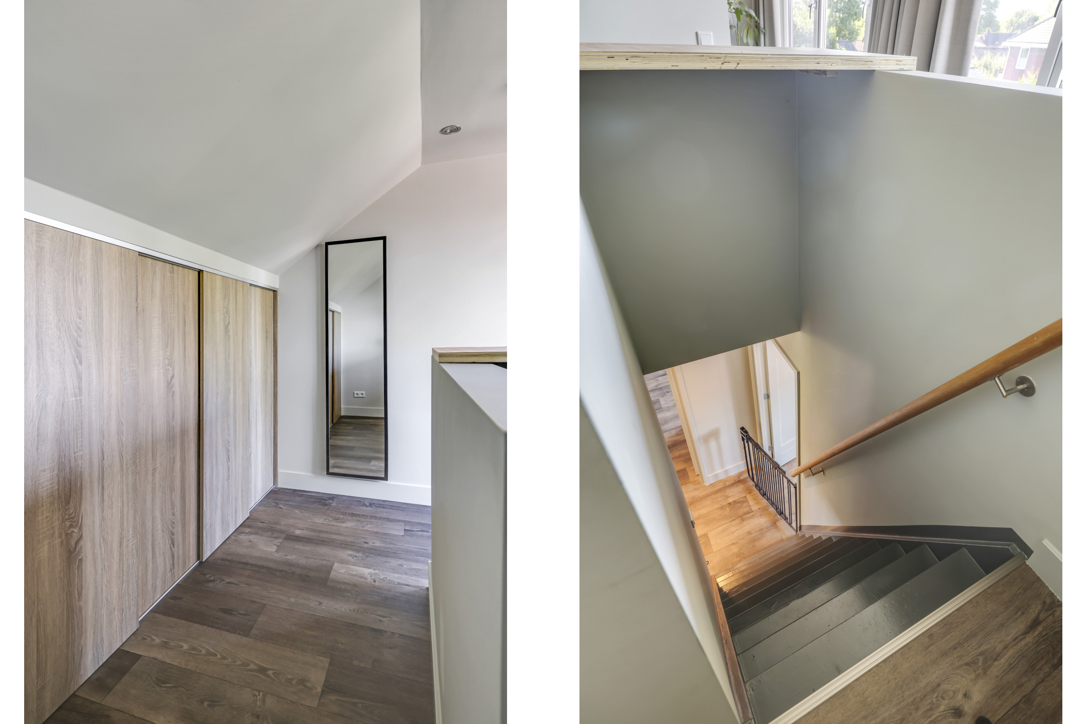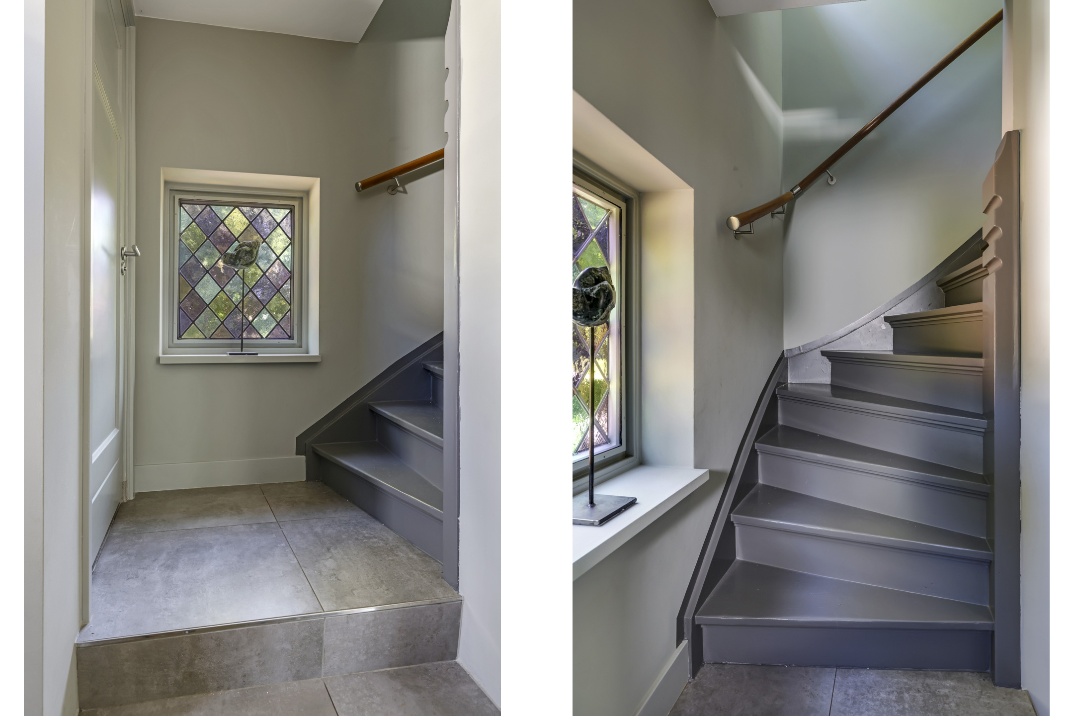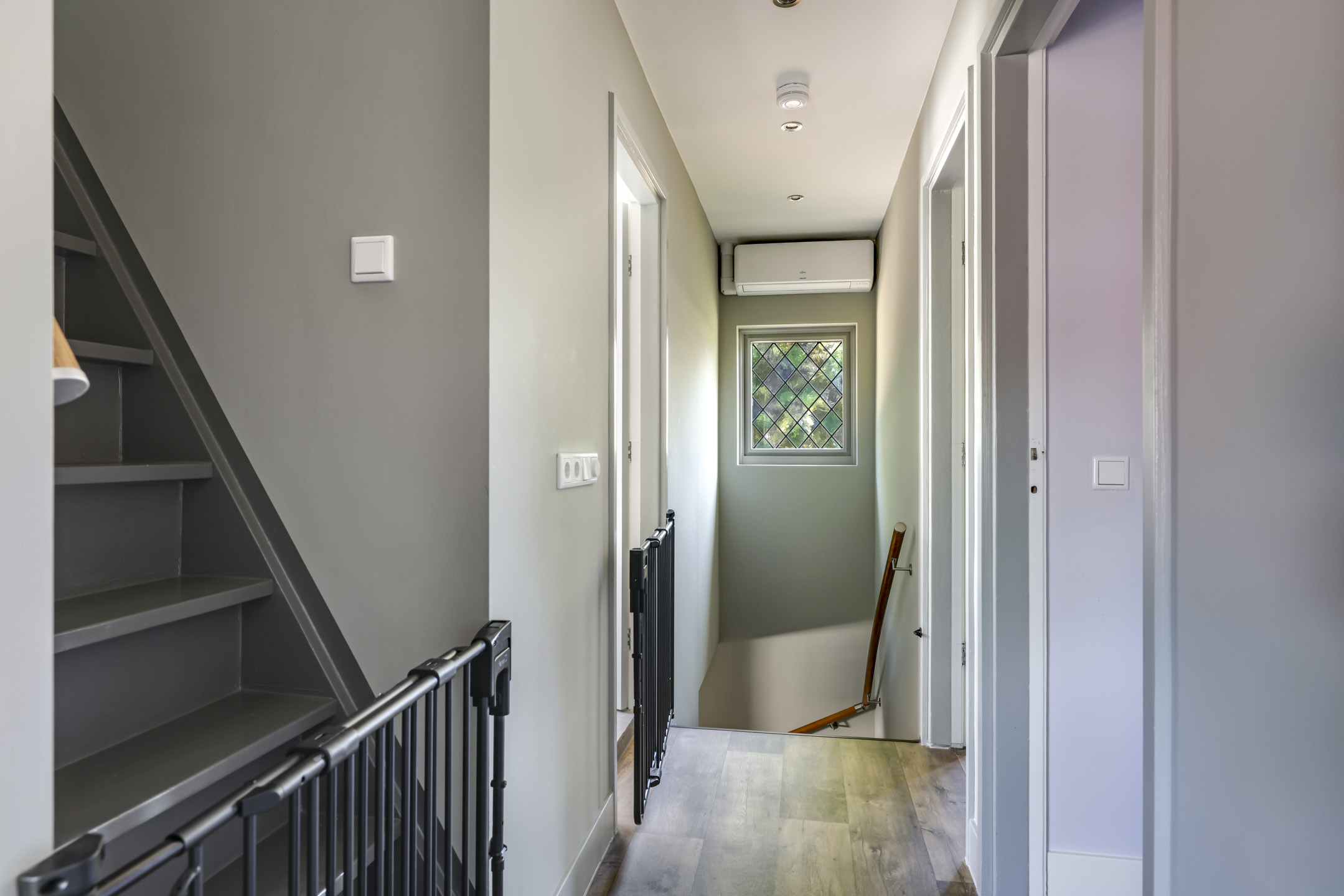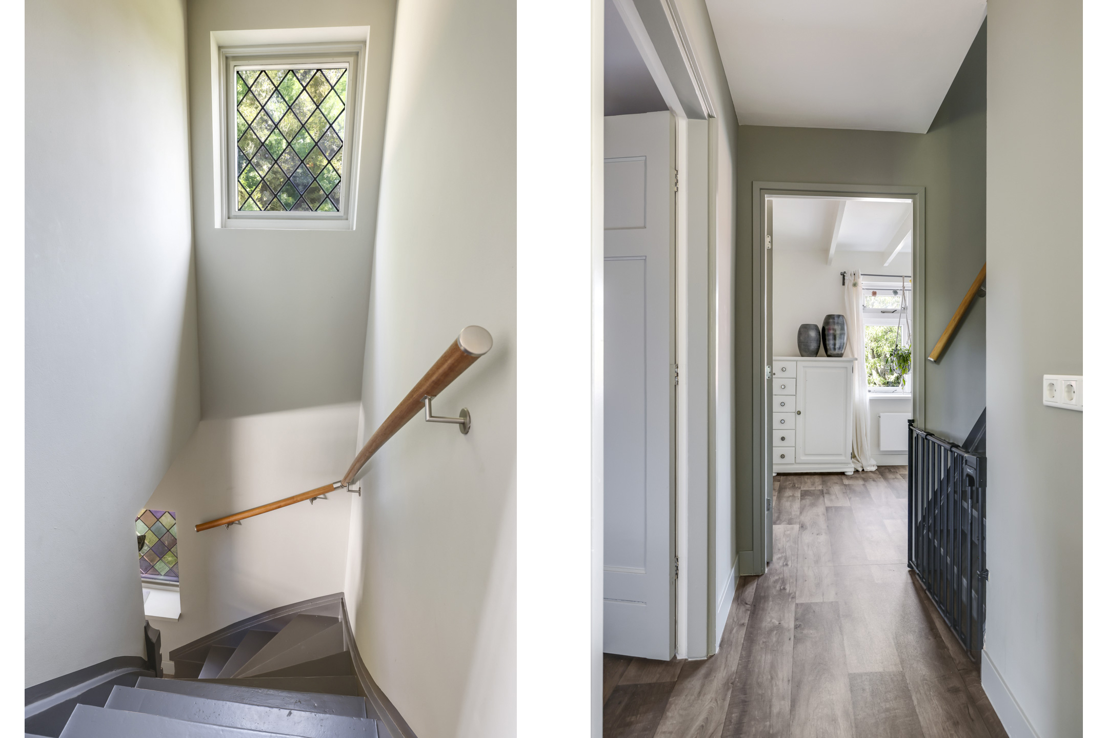 De overloop schakelt 3 slaapkamers en de badkamer aan elkaar. En de oorspronkelijke vlizotrap naar zolder is vervangen door een volwaardige vaste trap naar de 2e verdieping. Het glas-in-loodraam zorgt voor daglicht op de overloop terwijl dimbare inbouwspots voor het kunstlicht in de avonduren zorgt. Wellicht goed om te weten, is dat de verdiepingsvloer een massief constructie betreft. Dit voelt degelijk aan en is minder gehorig naar de begane grond.