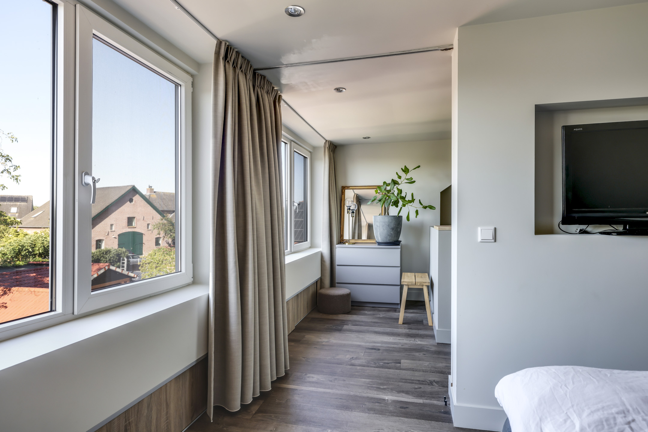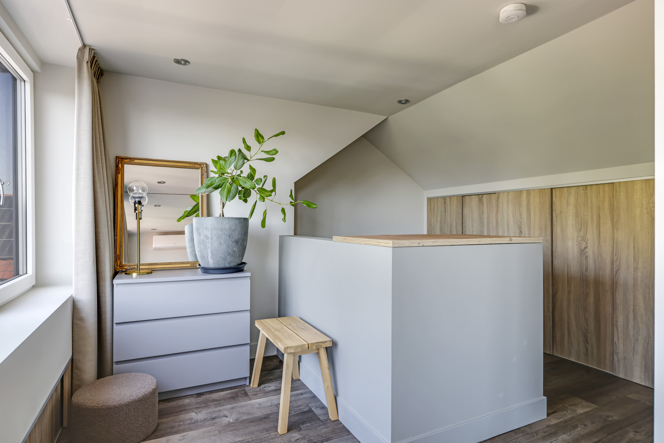 De bovenste woonlaag is misschien wel de meest verrassende. Dit komt mede door de breedtemaat van meer dan 7 meter en de maximaal grote dakkapel die is geplaatst. Het hoogwaardige afwerkingsniveau van de begane grond en 1e verdieping gaat op deze woonlaag gewoon door met strak stucwerk, inbouwspots en knieschot schuifpanelen die voor extra opbergruimte zorgen. De 4e slaapkamer is thans in gebruik als ouderslaapkamer. Er is een heuse masterbedroom gecreëerd met extra wandcontactdozen (ook naast het bed), data-aansluiting en een nis voor een TV. De dakkapel zorgt voor veel extra ruimte en is in kunststof uitgevoerd. Draai/kiepramen bieden de ideale ventilatiemogelijkheid.