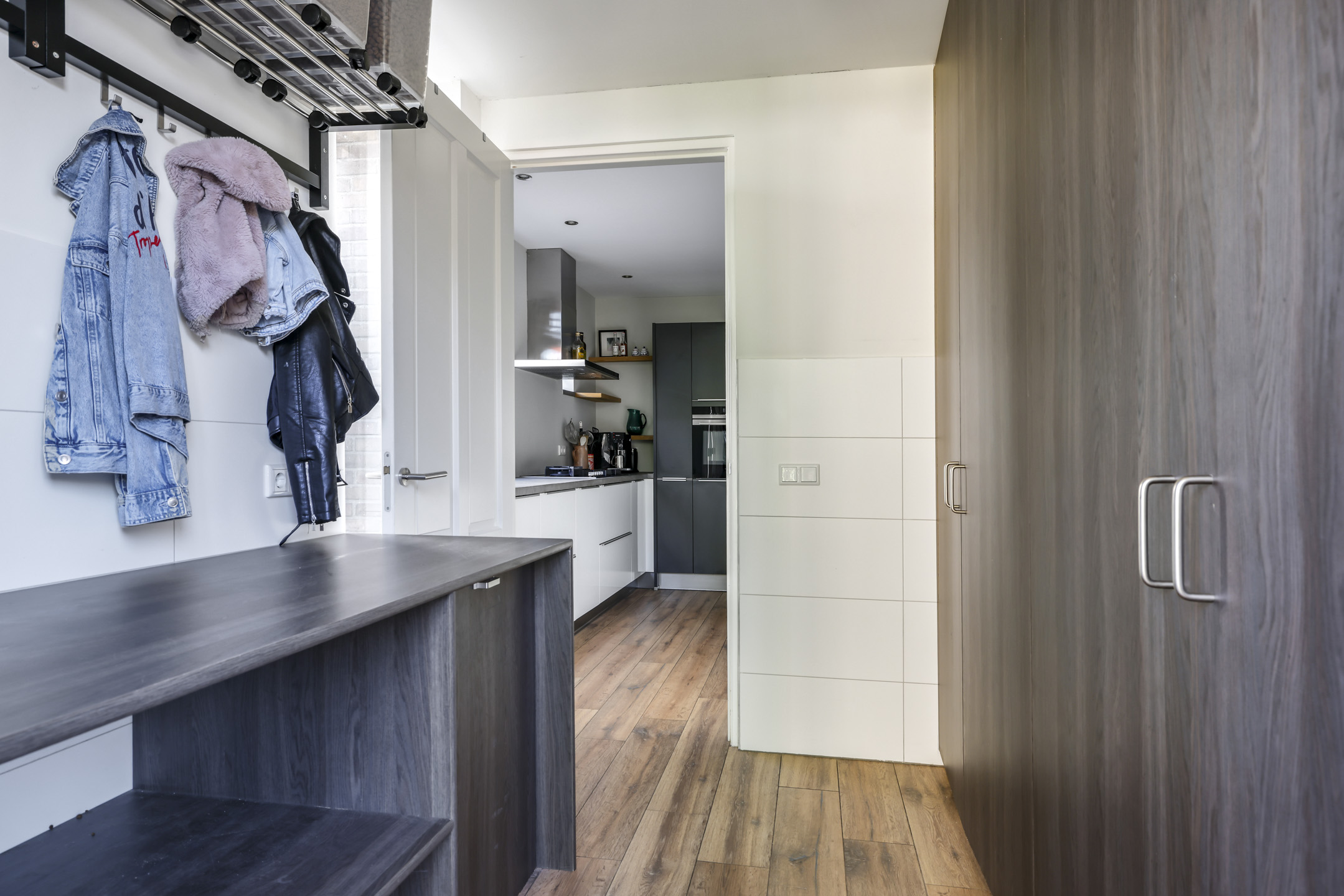 Vanuit de keuken is er een doorloop naar de bijkeuken. Deze ruimte is met name erg praktisch en ontbreekt vaak bij een 2-kapper. Er is een kastenwand met extra werkblad ingebouwd met aansluitingen voor een wasmachine en wasdroger. Daarbij is ook de aanwezige gootsteen erg handig. De CV-ketel is keurig in de kastenwand weggewerkt, evenals de verdeler van de vloerverwarming. Wat verder opvalt is de raampui die doorloopt tot aan de vloer. Wellicht dat je deze bijkeuken ook als een hal/entree gaat zien aangezien je hier eenvoudig vanaf de oprit en tuin naar binnen loopt. Dit kan ook zeker met kinderen en/of huisdieren erg fijn zijn.