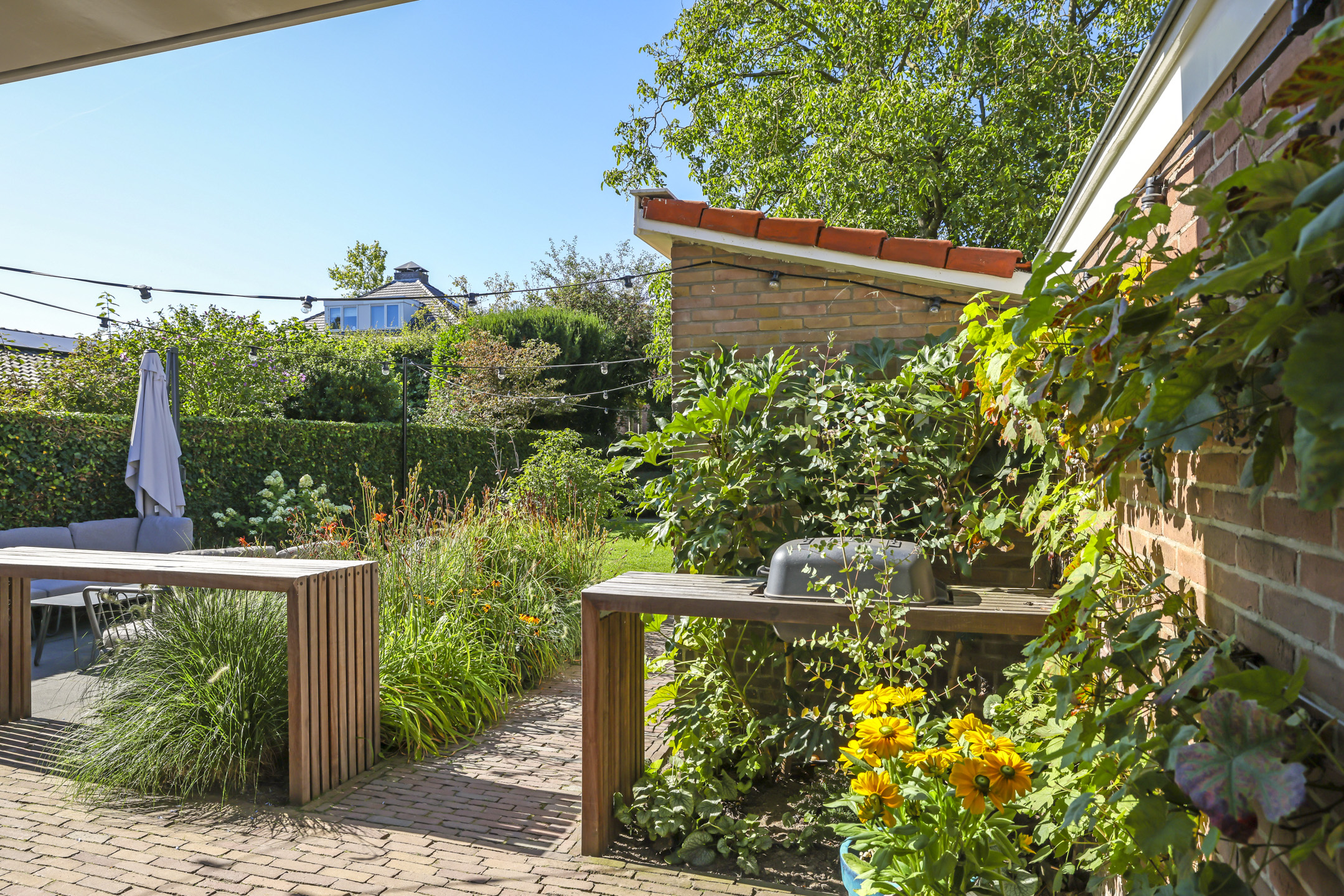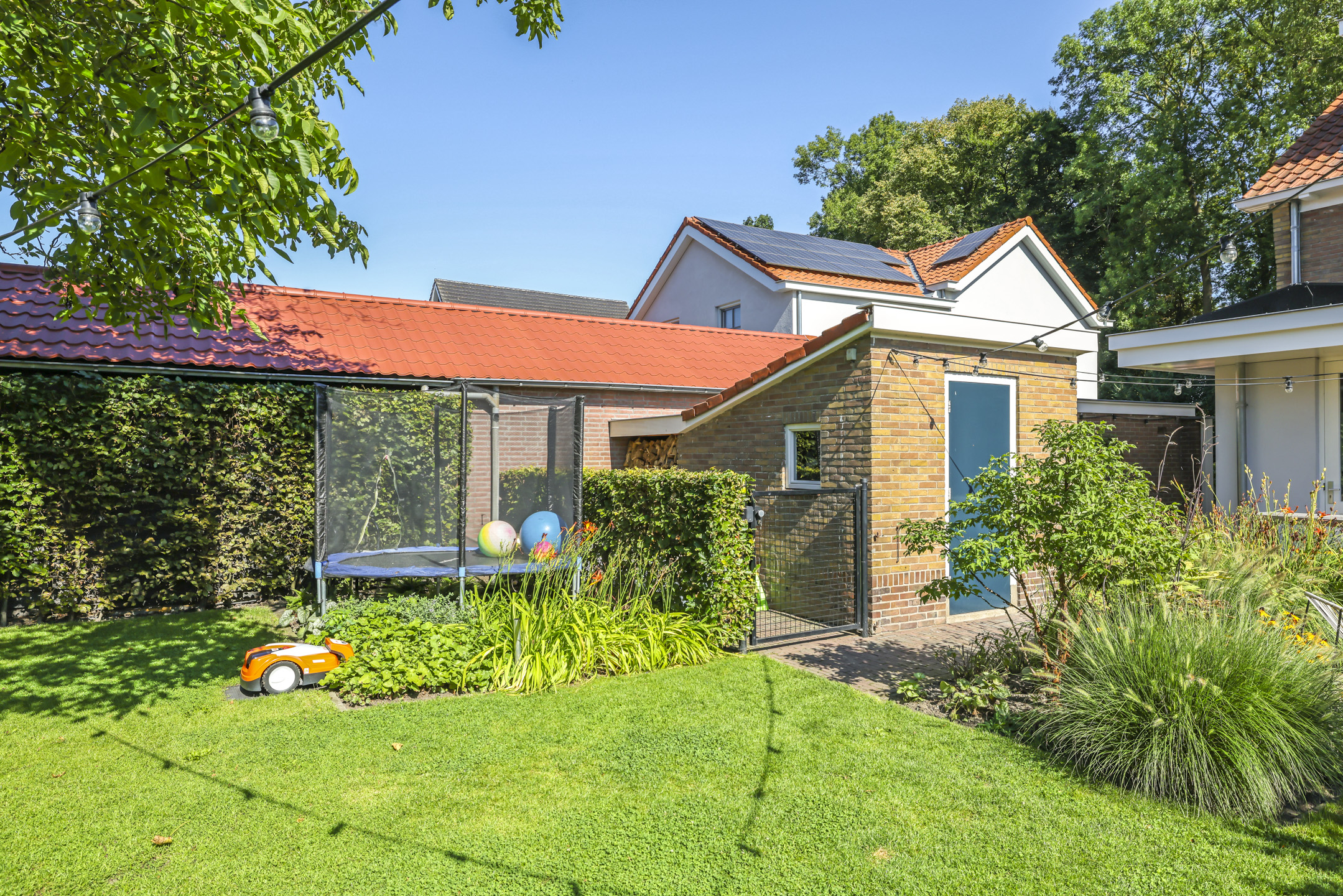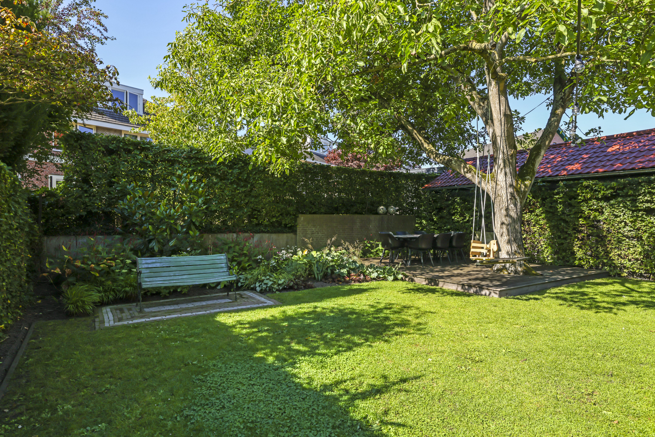 Ben je een tuinliefhebber, dan zal deze achtertuin zeker aanspreken. Dit is het huis van een hovenier en dat zie je gelijk aan de veelzijdigheid, vakkundigheid en materiaalgebruik waarmee de tuin is aangelegd. Het terras bij de achtergevel is fraai aangelegd met 60×60 tegels en gebakken klinkers. Borders zijn gevuld met verschillende soorten bloemen, planten en grassen wat in de zomer voor een kleurrijk geheel zorgt. Om de tuin in de zomer ook mooi groen te houden, is er een bewateringssysteem aangelegd met nevelsproeiers en druppelslangen. Een robotmaaier houdt het gazon kort. Diverse grondspots zorgen ervoor dat diverse bomen in de tuin in de donkere avonduren mooi uitgelicht worden. Iconisch daarvoor is de volwassen notenboom achterin de tuin.