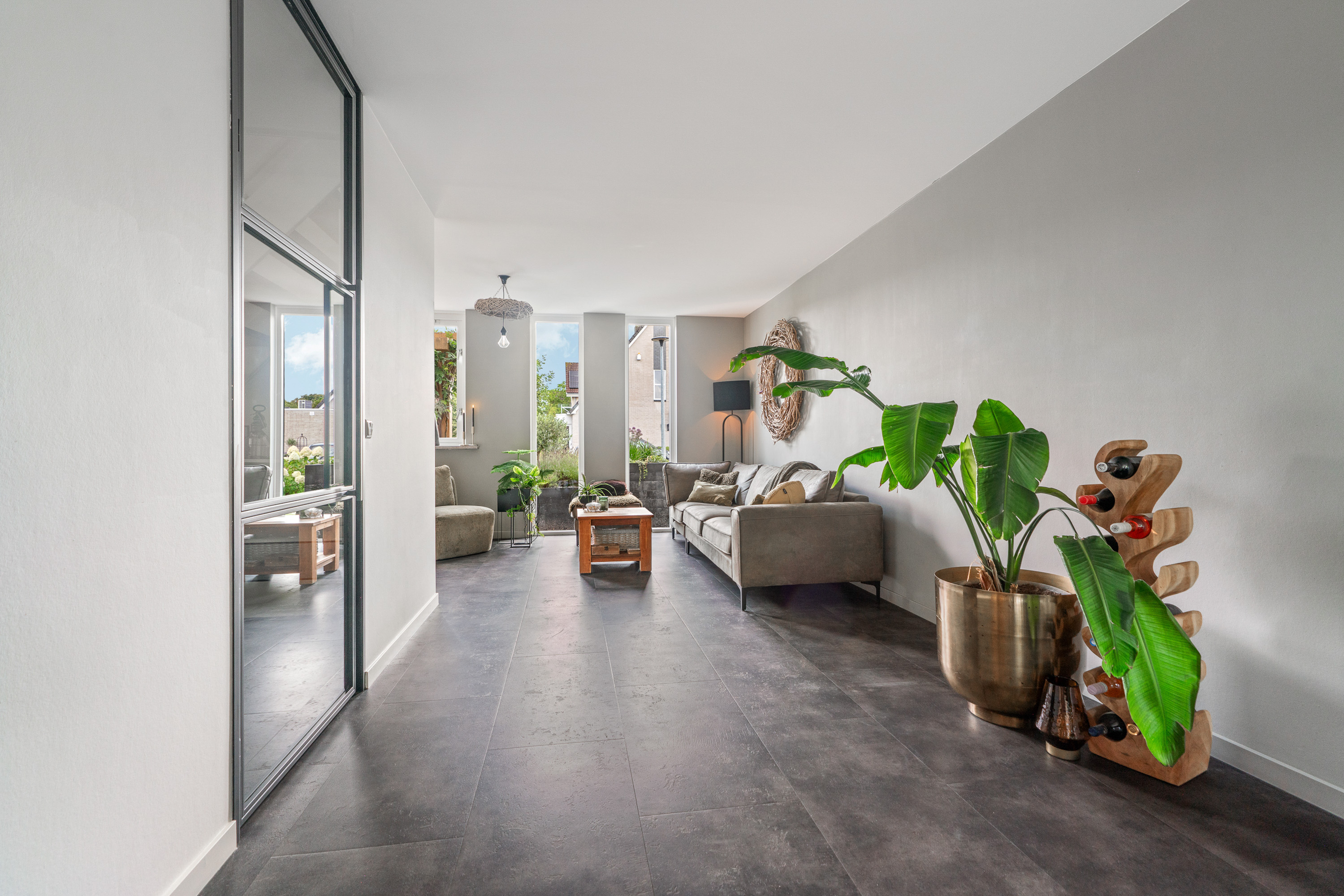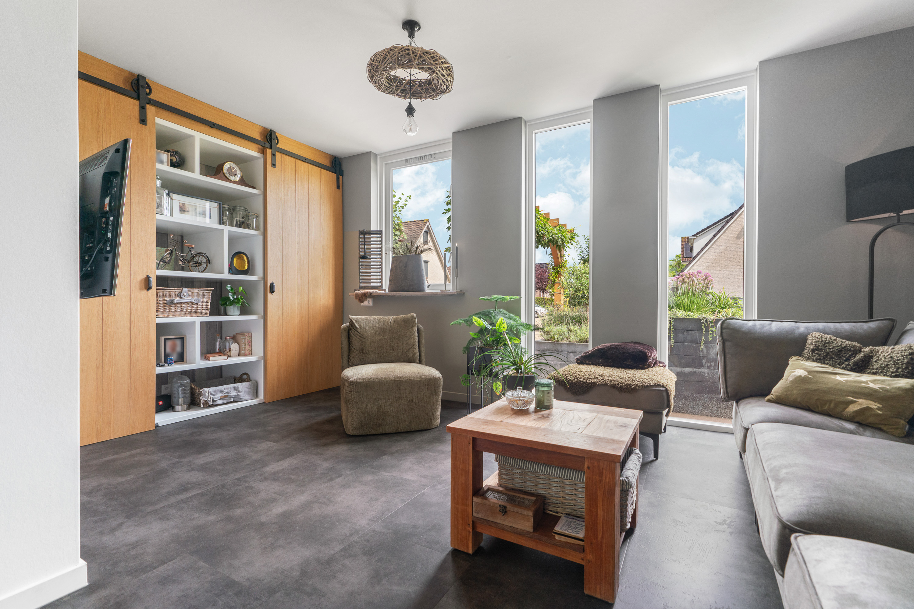 De woonkamer heeft een gezellige beleving hetgeen wordt gecreëerd door de algehele aankleding en afwerking. Het meest in het oog springend zijn toch wel de eikenhouten schuifdeuren met robuuste zwartstalen geleider. In het midden is een nis gecreëerd en voorzien van bijbehorende wandplanken. Achter één van de schuifpanelen zou je een TV kunnen plaatsen/ophangen. Speelse ramen tot aan de vloer zorgen voor een fijne lichtinval en speels karakter. De wanden en het plafond zijn strak gestuct waarbij wandcontactdozen zijn vervangen en uitgebreid. De vloer is bekleed met PVC en voorzien van vloerverwarming. Hierdoor konden de radiatoren weggelaten worden. Erg trendy is de zwartstalen deur tussen de woonkamer en de hal. Dit zorgt tevens voor een open karakter en meer daglicht in de hal.