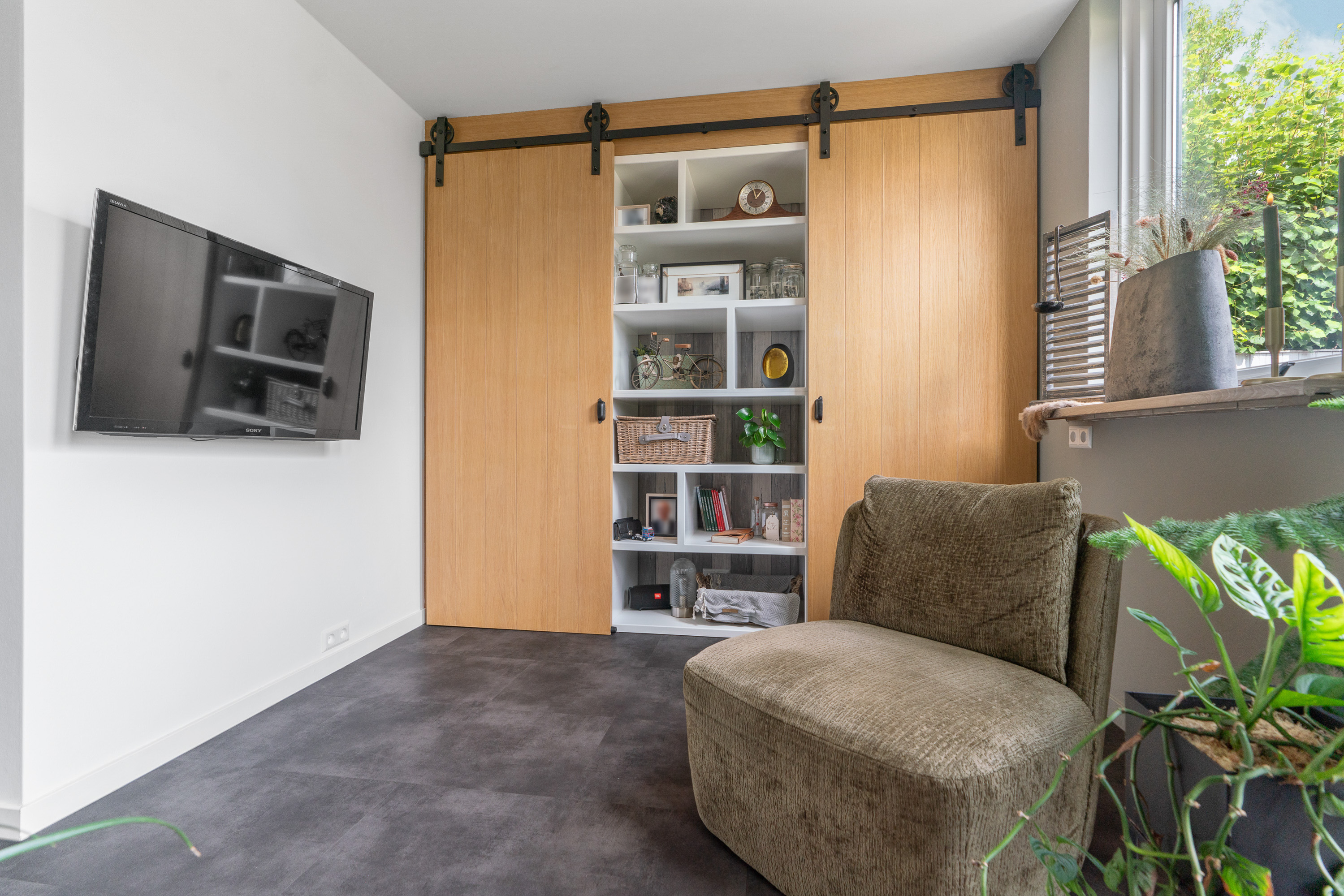 Woonkamer met maatwerk kastenwand