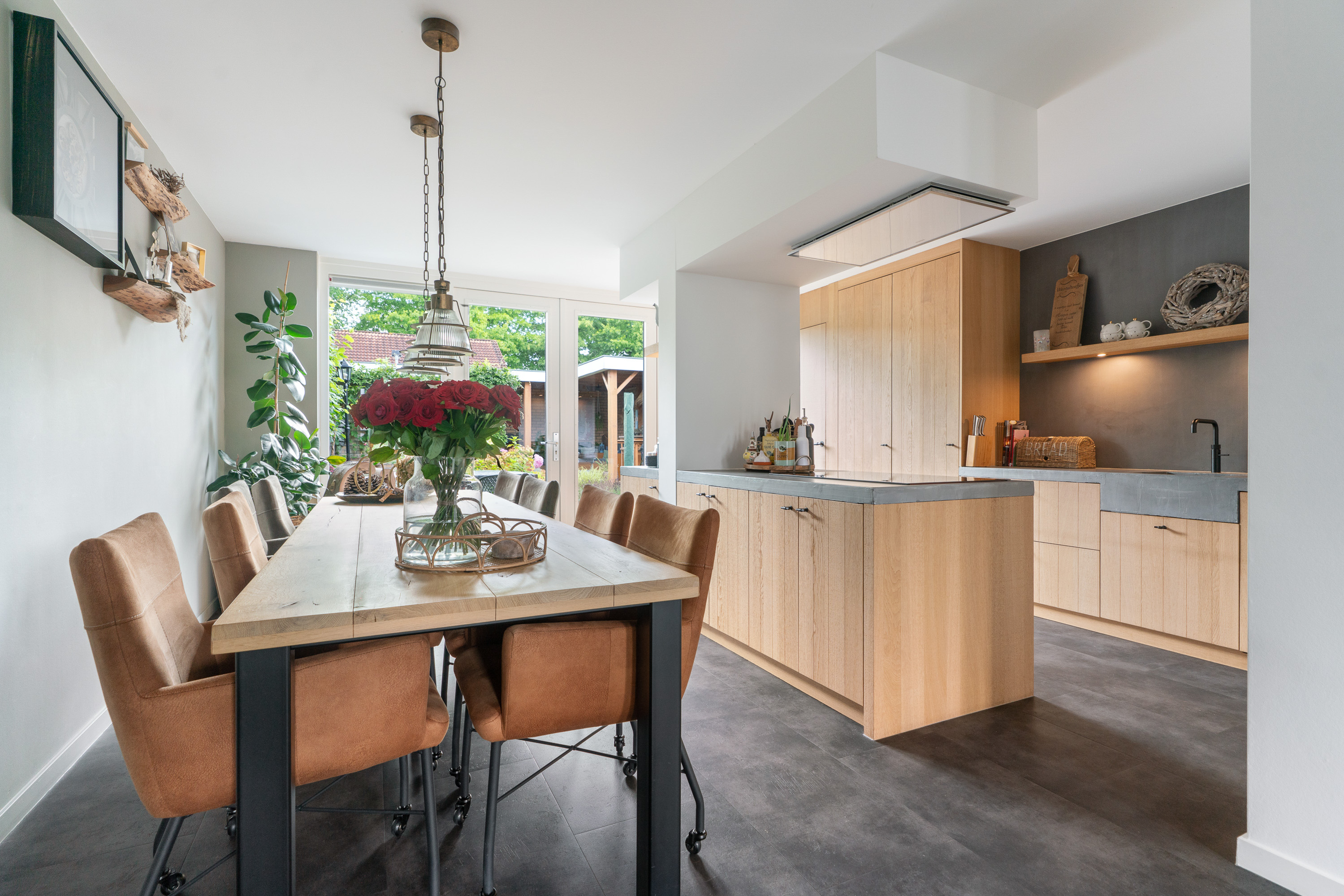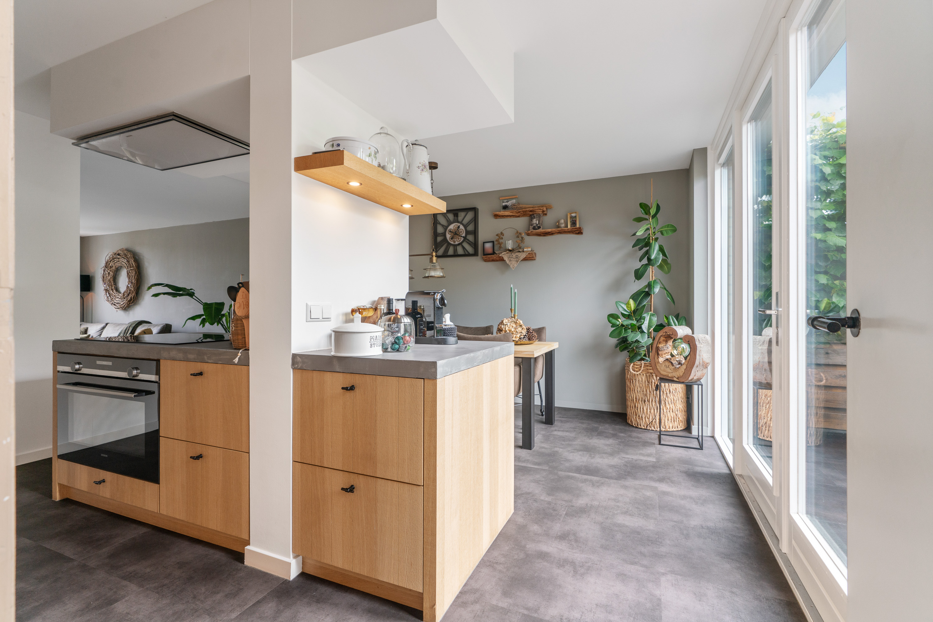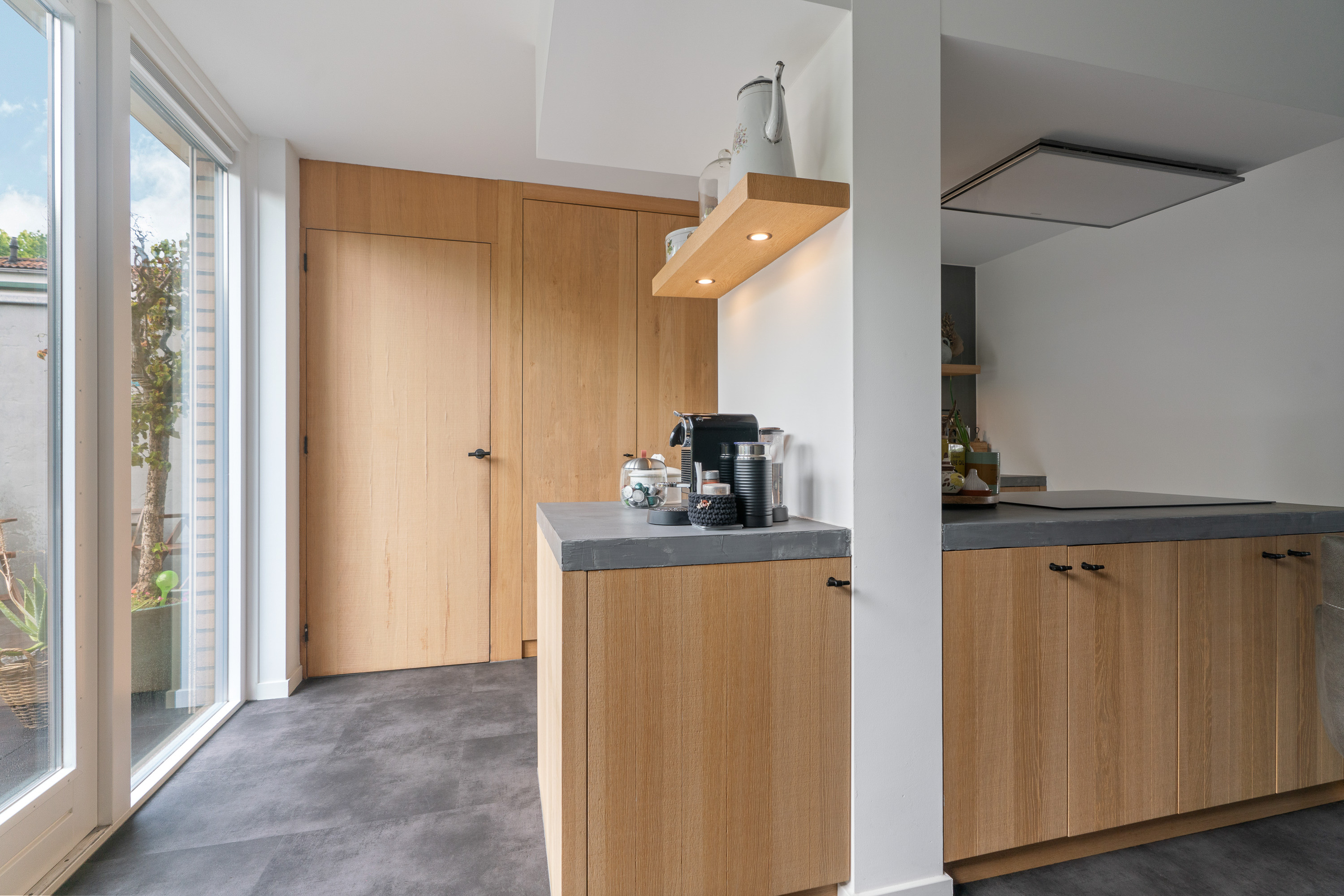 Tijdens het realiseren van de aanbouw aan de achterzijde van de woning, heeft de woning ook een compleet nieuwe keuken geplaatst. En daar is niet op bezuinigd gezien de luxe opstelling, de gekozen inbouwapparatuur en het materiaalgebruik. De fronten zijn uitgevoerd in massief eikenhout. In combinatie met een ‘betonlook’ werkblad geeft dit een bijzonder stijlvolle uitstraling aan de keuken. Fraai detail is dat de gootsteen één geheel vormt met het werkblad. De inbouwapparatuur bestaat uit een brede inductie kookplaat met erboven een afzuigunit die strak in het plafond is gestuct. Onder de kookplaat vind je een evenzo brede heteluchtoven (90cm breed) van Siemens. In de hoge kastenwand is nog een grote koelkast ingebouwd. Tevens kun je hier een uitgebreid servies kwijt. Erg verrassend is de ‘onopvallende’ deur die als één geheel toegang geeft tot de inpandige garage. En mocht je een koffieliefhebber zijn, dan vind je aan de andere kant van de pilaar een hele fijne ‘koffiecorner’ waar je je koffiemachine kwijt kunt.