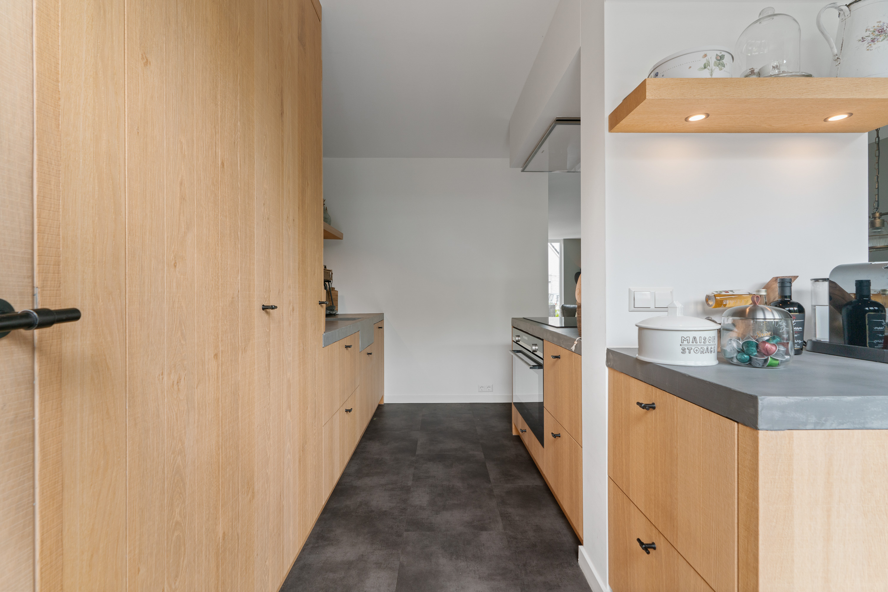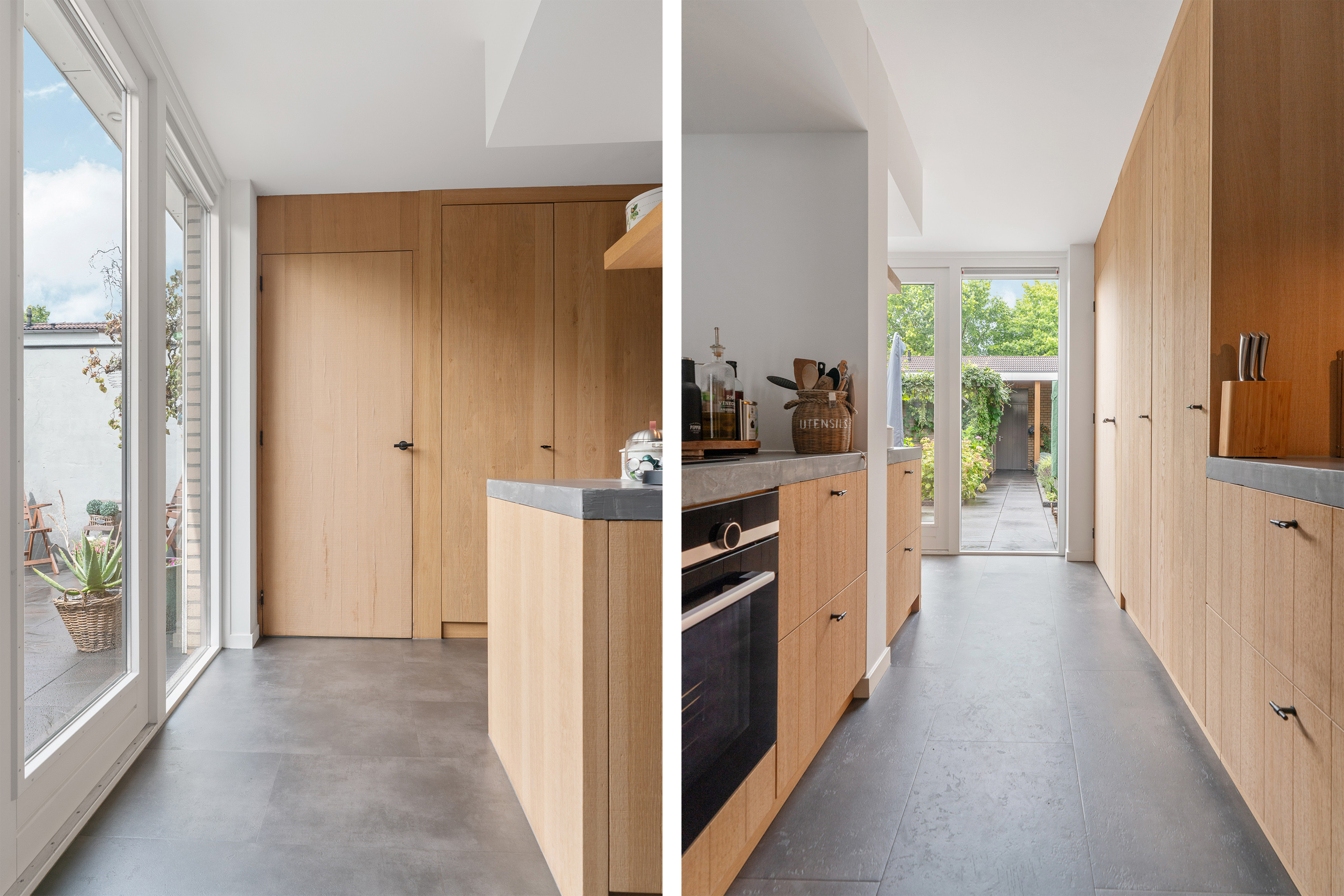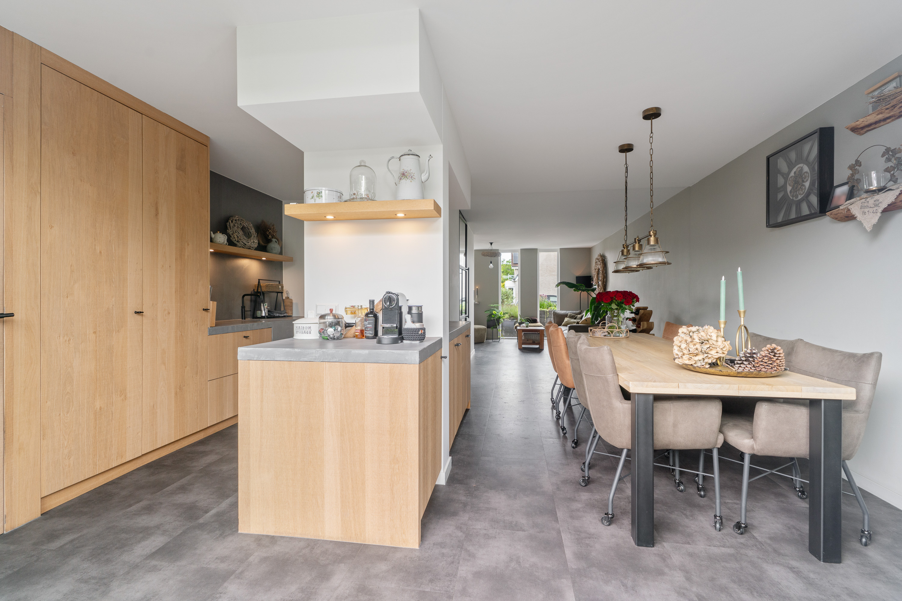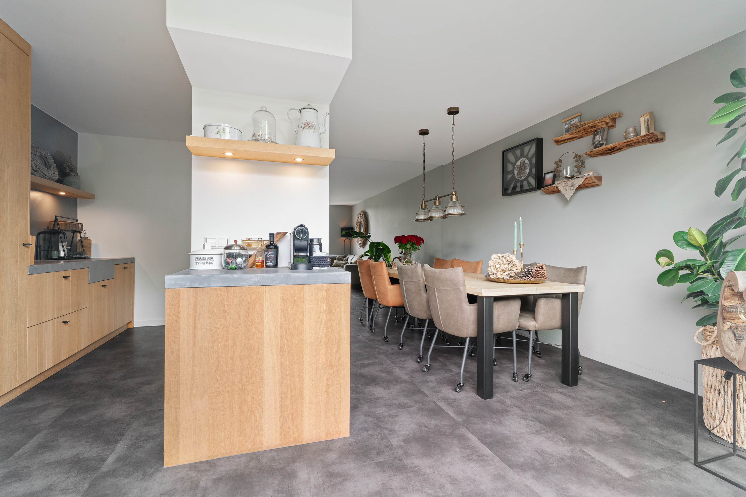 Tijdens het realiseren van de aanbouw aan de achterzijde van de woning, heeft de woning ook een compleet nieuwe keuken geplaatst. En daar is niet op bezuinigd gezien de luxe opstelling, de gekozen inbouwapparatuur en het materiaalgebruik. De fronten zijn uitgevoerd in massief eikenhout. In combinatie met een ‘betonlook’ werkblad geeft dit een bijzonder stijlvolle uitstraling aan de keuken. Fraai detail is dat de gootsteen één geheel vormt met het werkblad. De inbouwapparatuur bestaat uit een brede inductie kookplaat met erboven een afzuigunit die strak in het plafond is gestuct. Onder de kookplaat vind je een evenzo brede heteluchtoven (90cm breed) van Siemens. In de hoge kastenwand is nog een grote koelkast ingebouwd. Tevens kun je hier een uitgebreid servies kwijt. Erg verrassend is de ‘onopvallende’ deur die als één geheel toegang geeft tot de inpandige garage. En mocht je een koffieliefhebber zijn, dan vind je aan de andere kant van de pilaar een hele fijne ‘koffiecorner’ waar je je koffiemachine kwijt kunt.