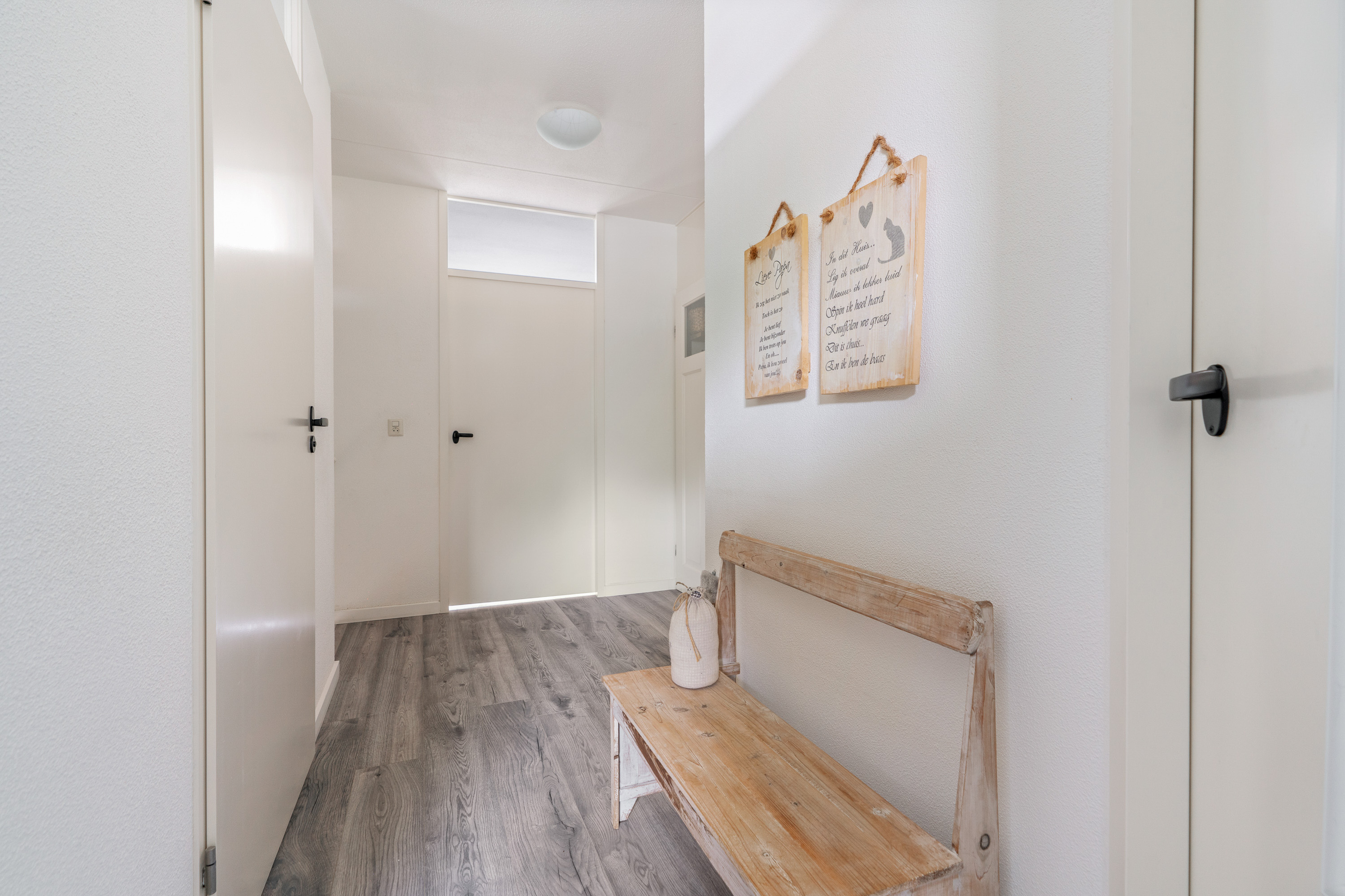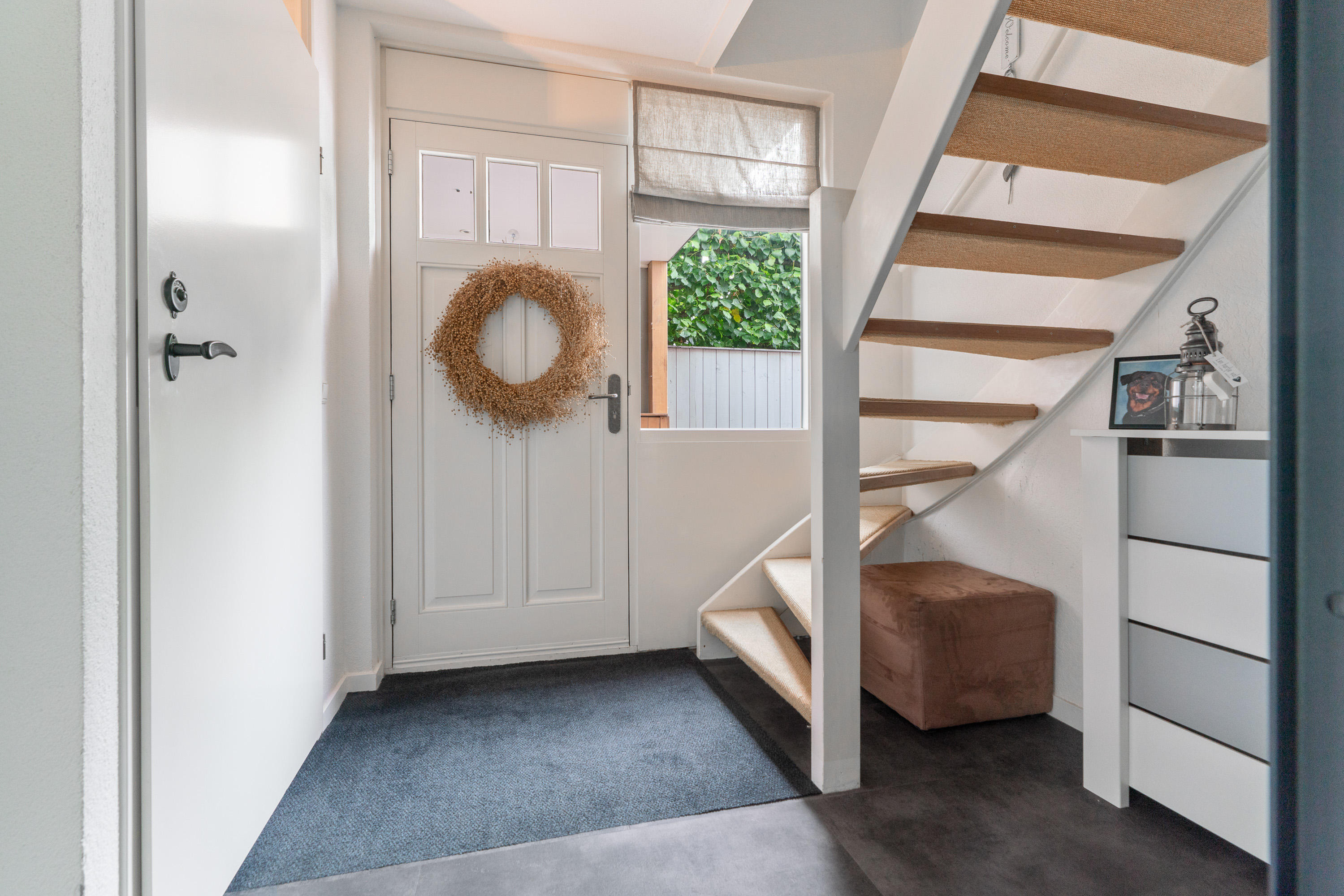 Hal/entree met veel glas, meterkast, toilet, garderobe onder de trap en trapopgang