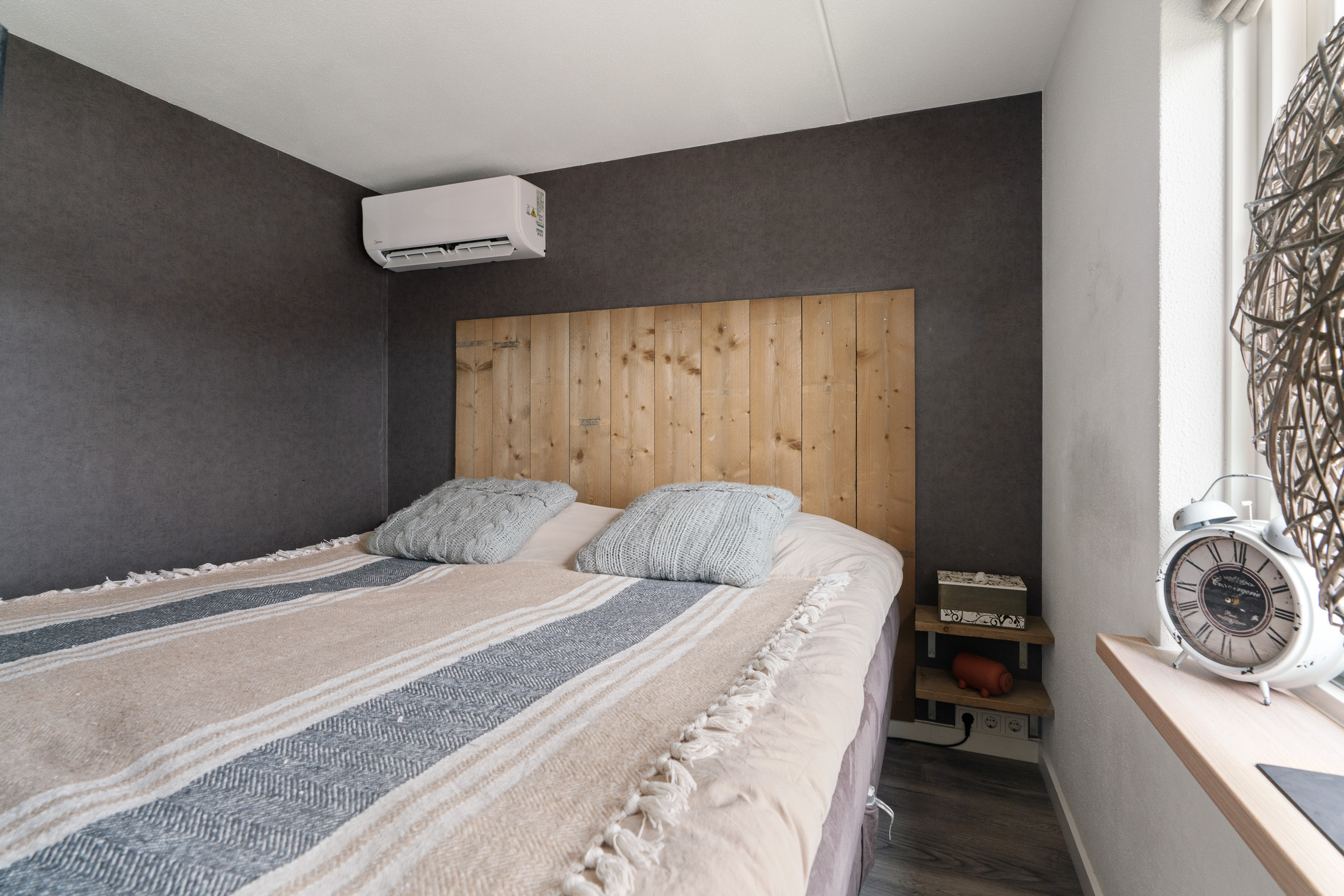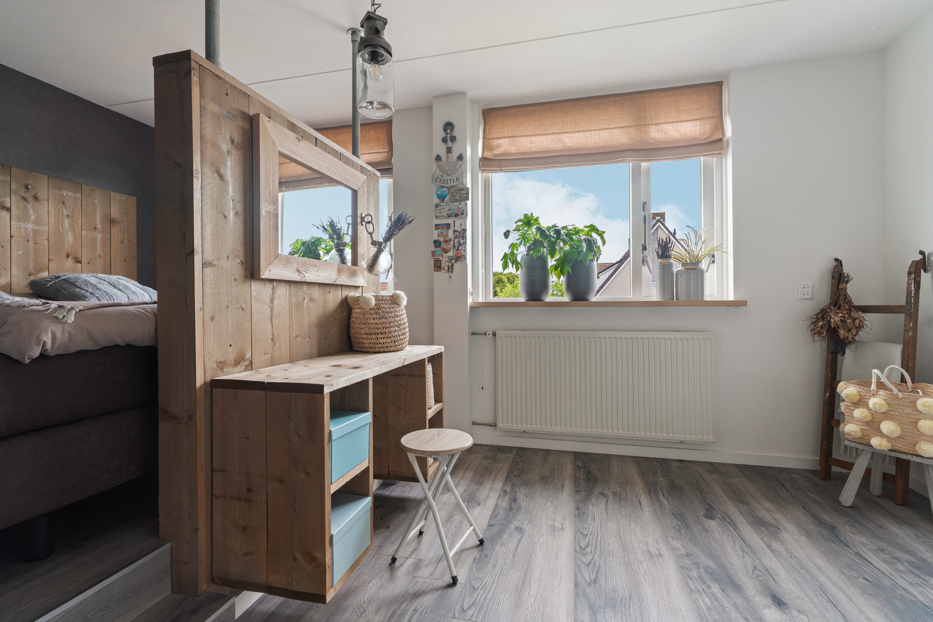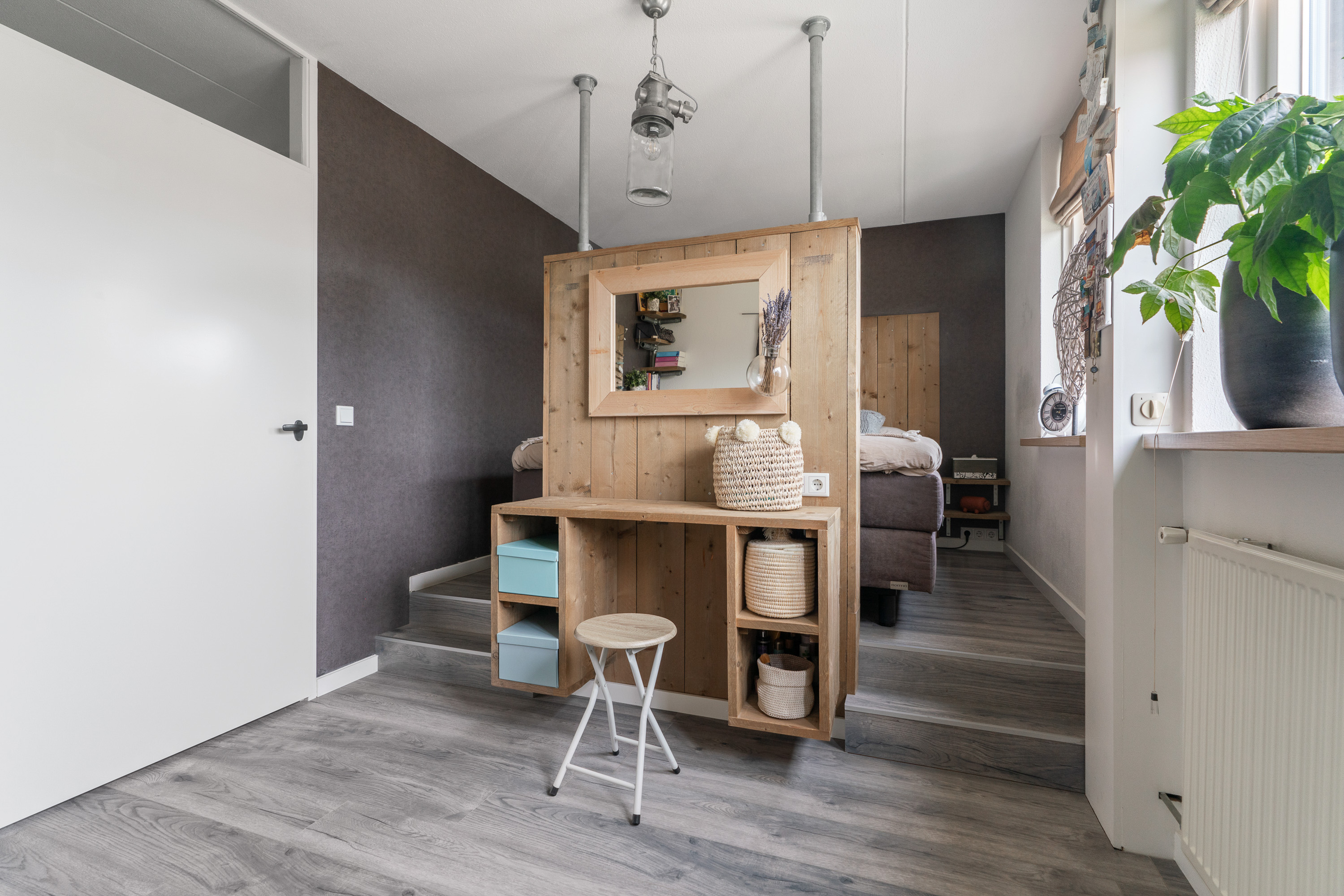 De masterbedroom heeft de volle breedte van de woning en heeft een speels karakter vanwege de deels verhoogde vloer in combinatie met de roomdevider. Het laatste is voorzien van wandcontactdozen en biedt plaats aan een TV op de slaapkamer.
