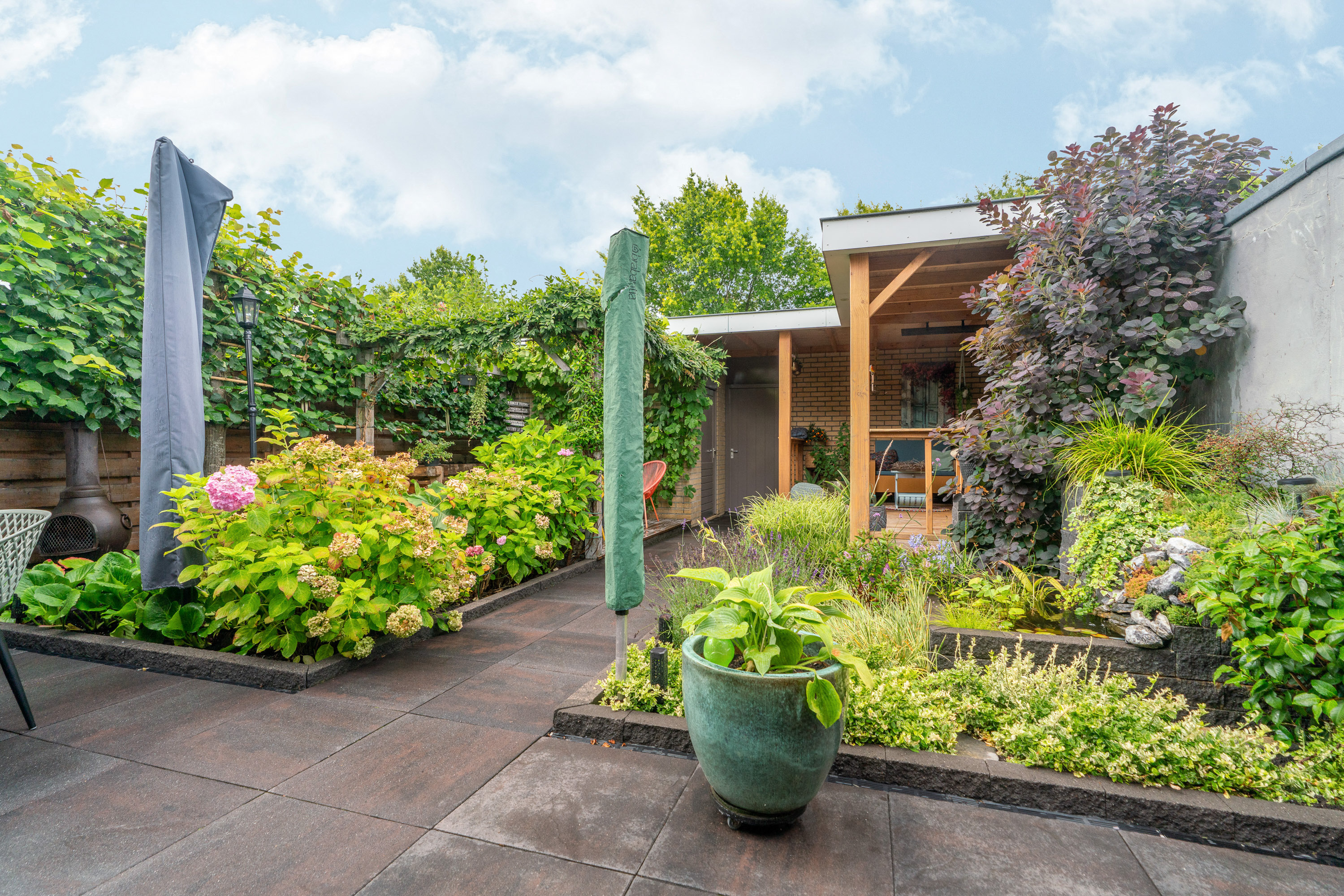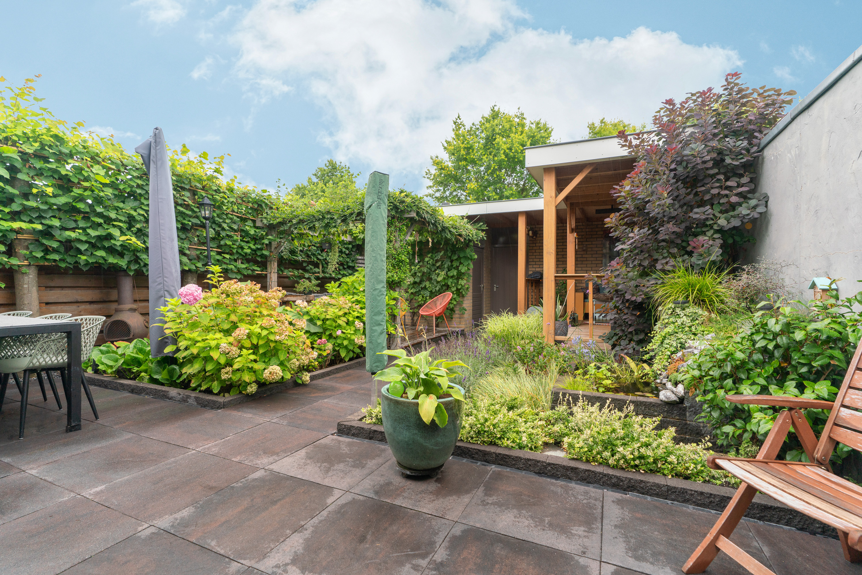 De achtertuin heeft een mooi formaat (11m diep en 7,5m breed) en biedt nagenoeg volledige privacy hetgeen wordt gecreëerd door bomen en laagbouw. Het terras is aangelegd met groot formaat tegels (60×60) waarbij de drainafvoer niet is vergeten. Een 2e terras is aangelegd met houtvlonders waarbij een pergola voor de nodige schaduw zorgt. En dat is fijn aangezien je hier veel zonuren geniet door de gunstige zuid/westligging. Een vijvertje, grassen, een druivenstruik en lavendel geven deze tuin kleur. Om de tuin ook in de zomer groen te houden, kun je gebruik maken van de buitenkraan. Tevens zijn er diverse elektrapunten geïnstalleerd.